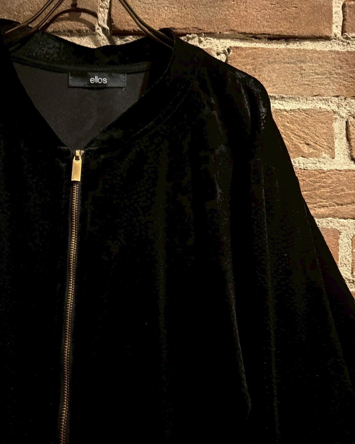 起毛感のあるブラックベロアのボディに、パイソン柄を載せたボンバージャケット。