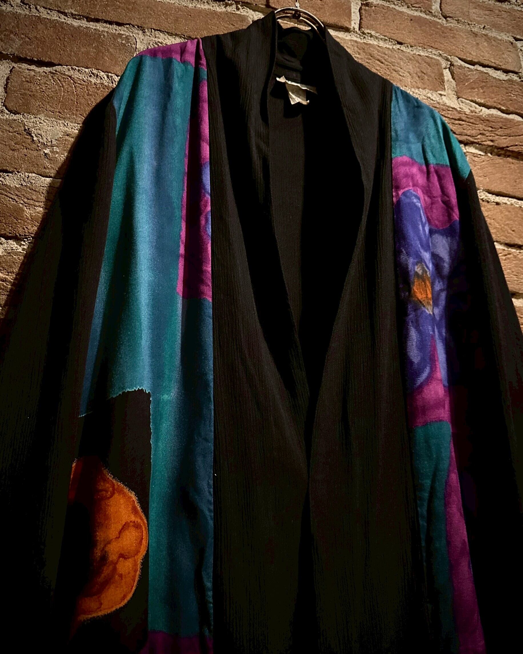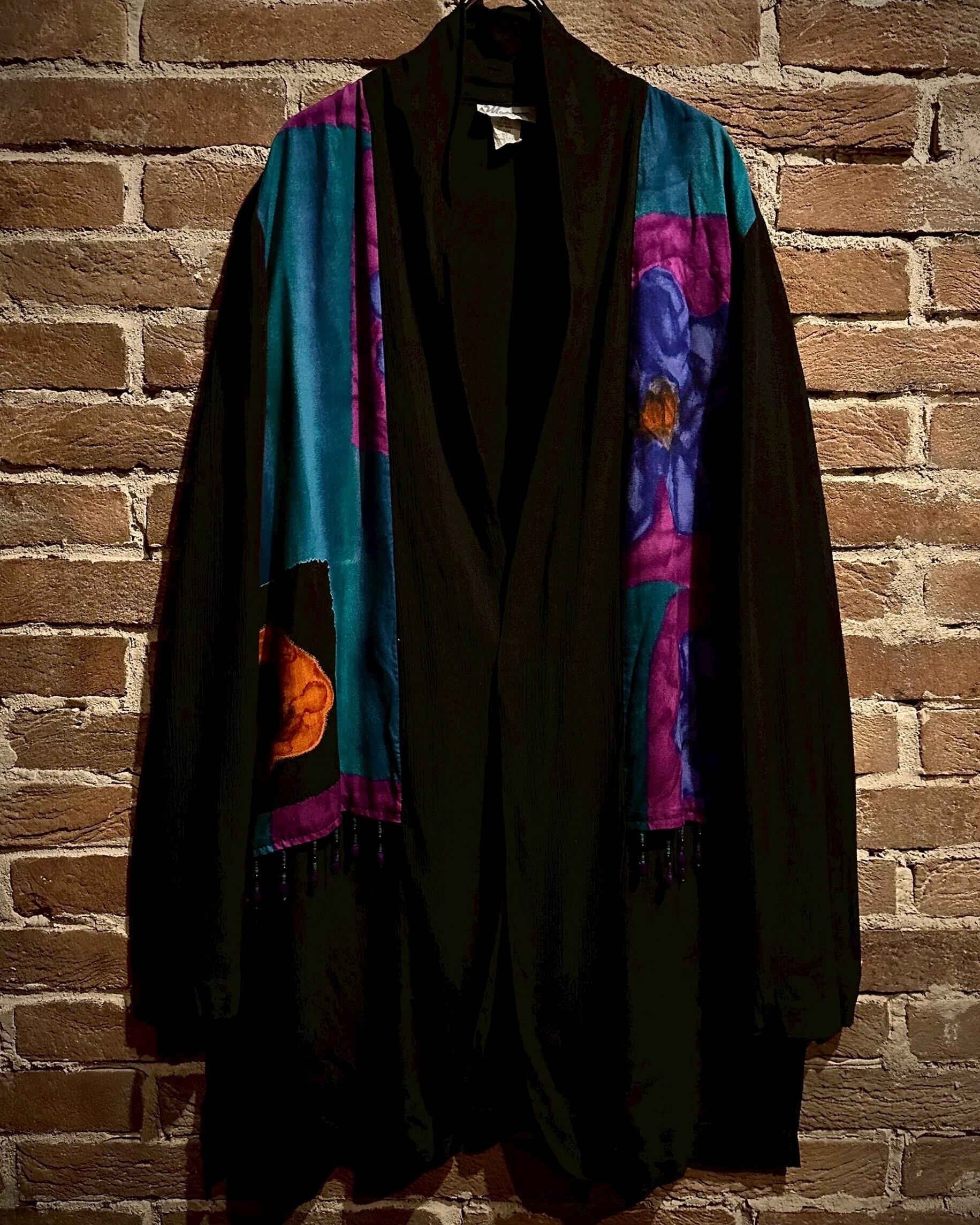 ブラックベースのボディに、肩にショールを掛けたような、レイヤード風のデザインに仕上げた羽織りジャケット。
