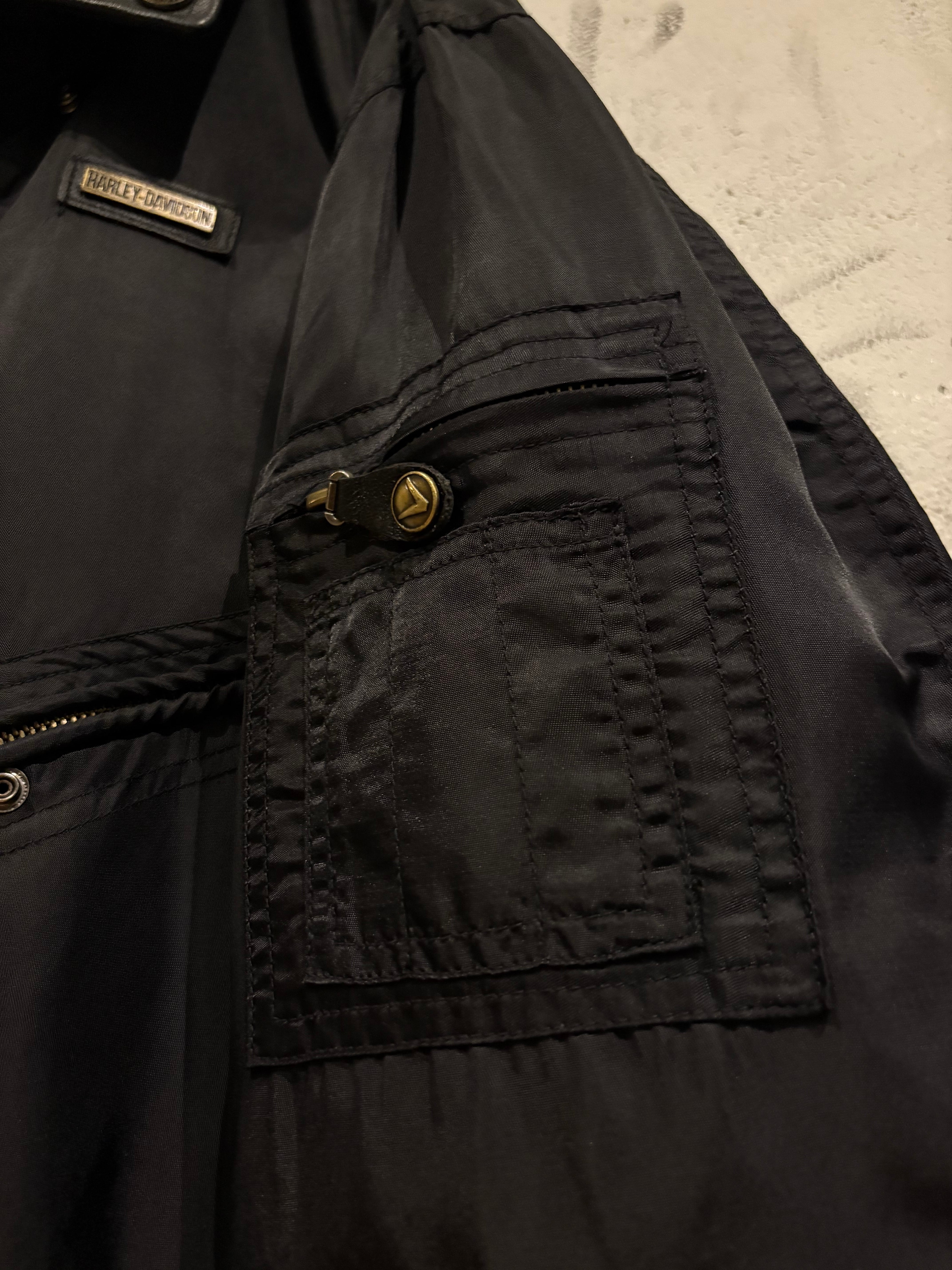 レザーで切り替えることにより、摩耗によってダメージを受けやすい襟部分の強化に加えて、デザインのアクセントにもなり、ハーレーらしい無骨さのある風合い漂うデザインへと仕上げられています。
