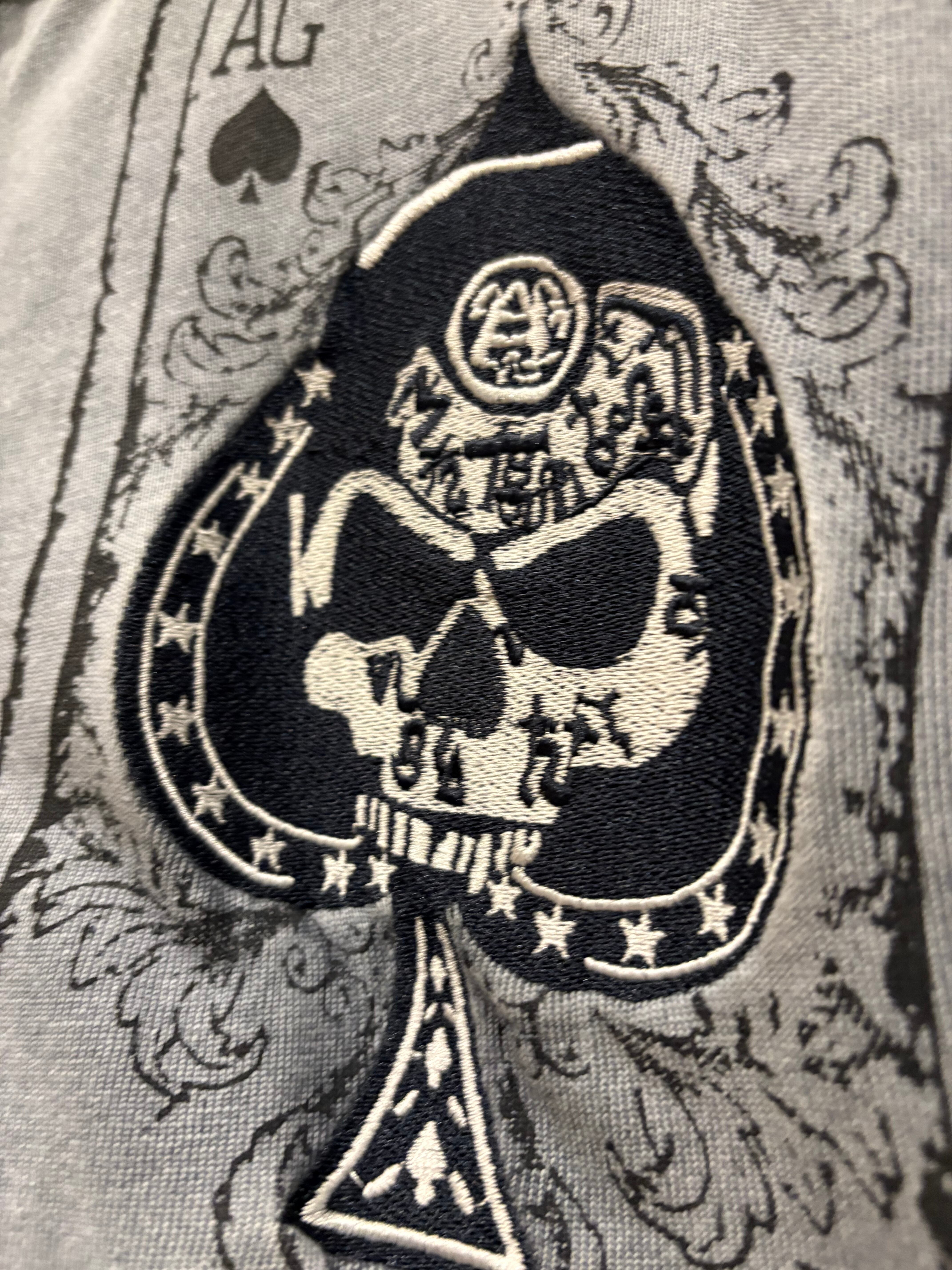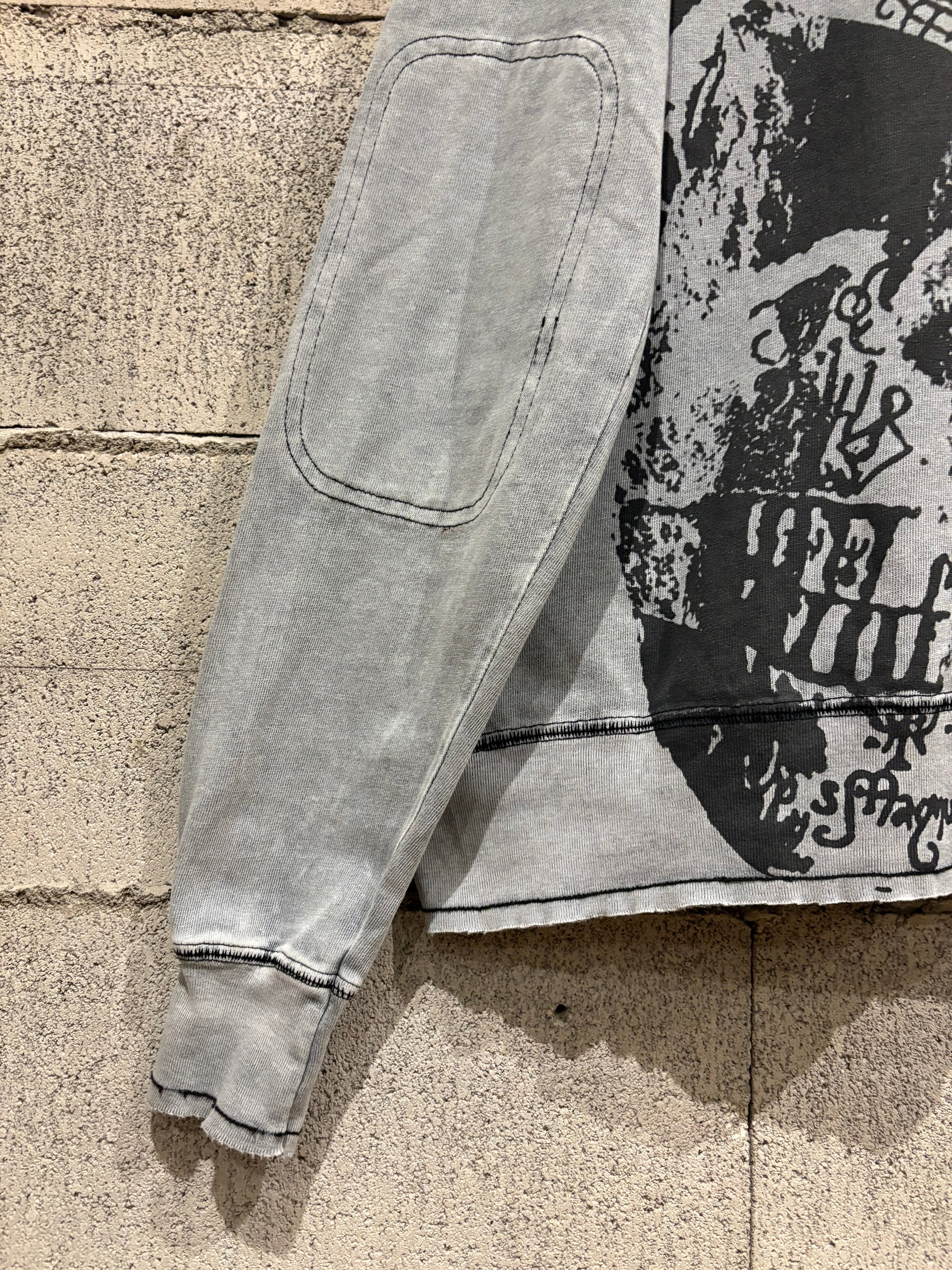 フェード感が見事に表現されたグレーのボディをベースに、左胸にはトランプのスペードを刺繍で、背面には大ぶりのスカルをプリントで載せたジップアップフーディ。