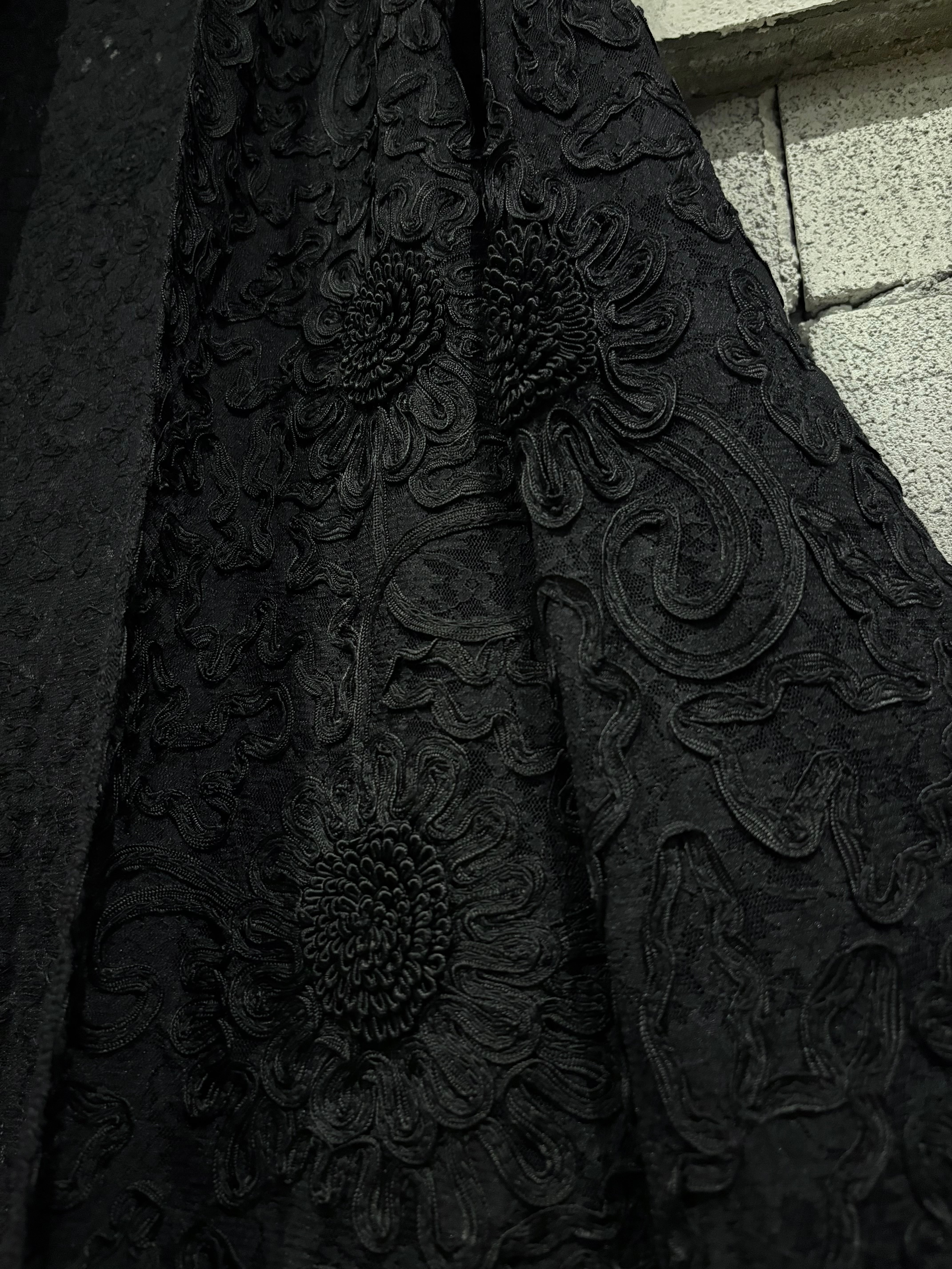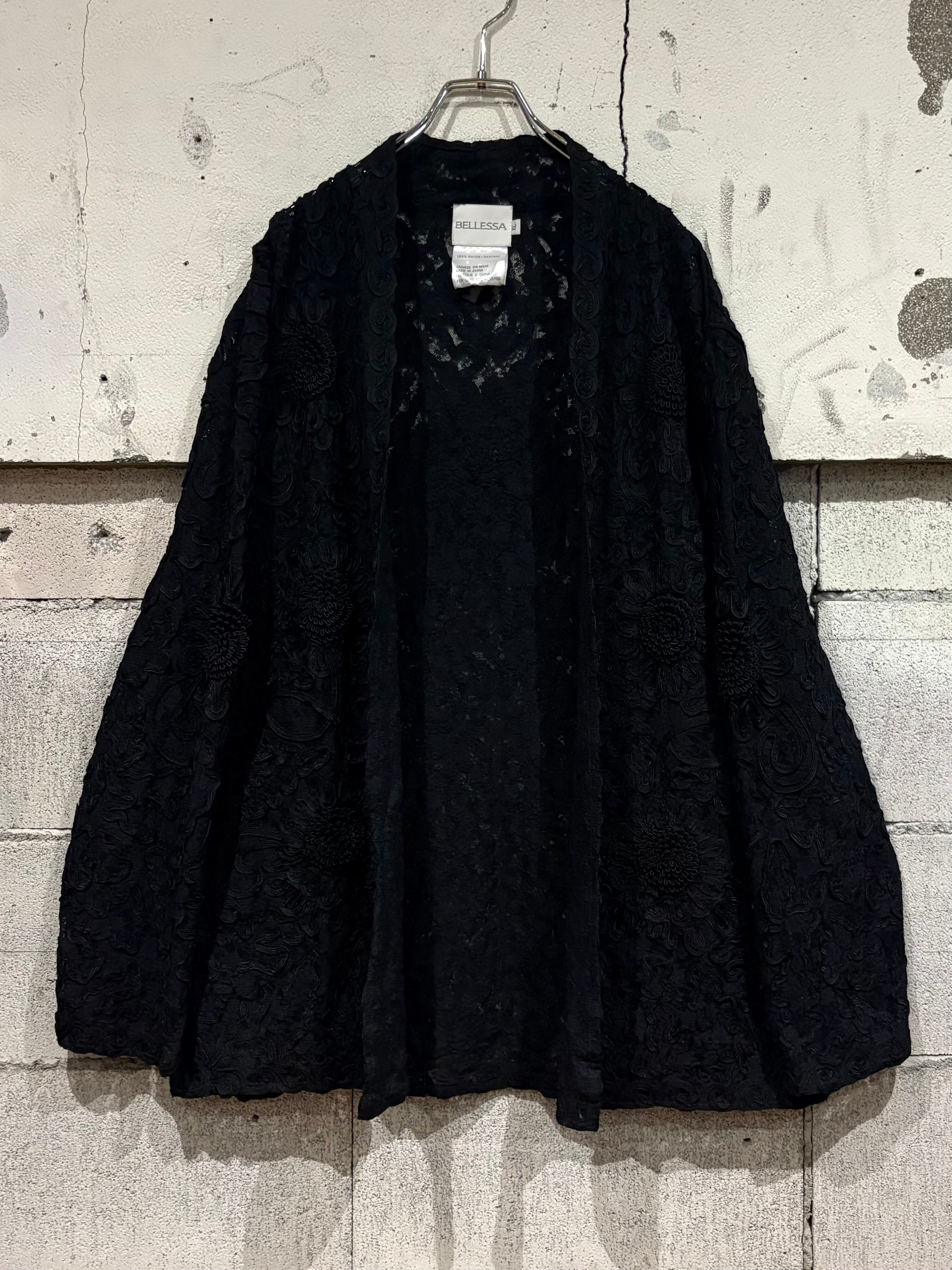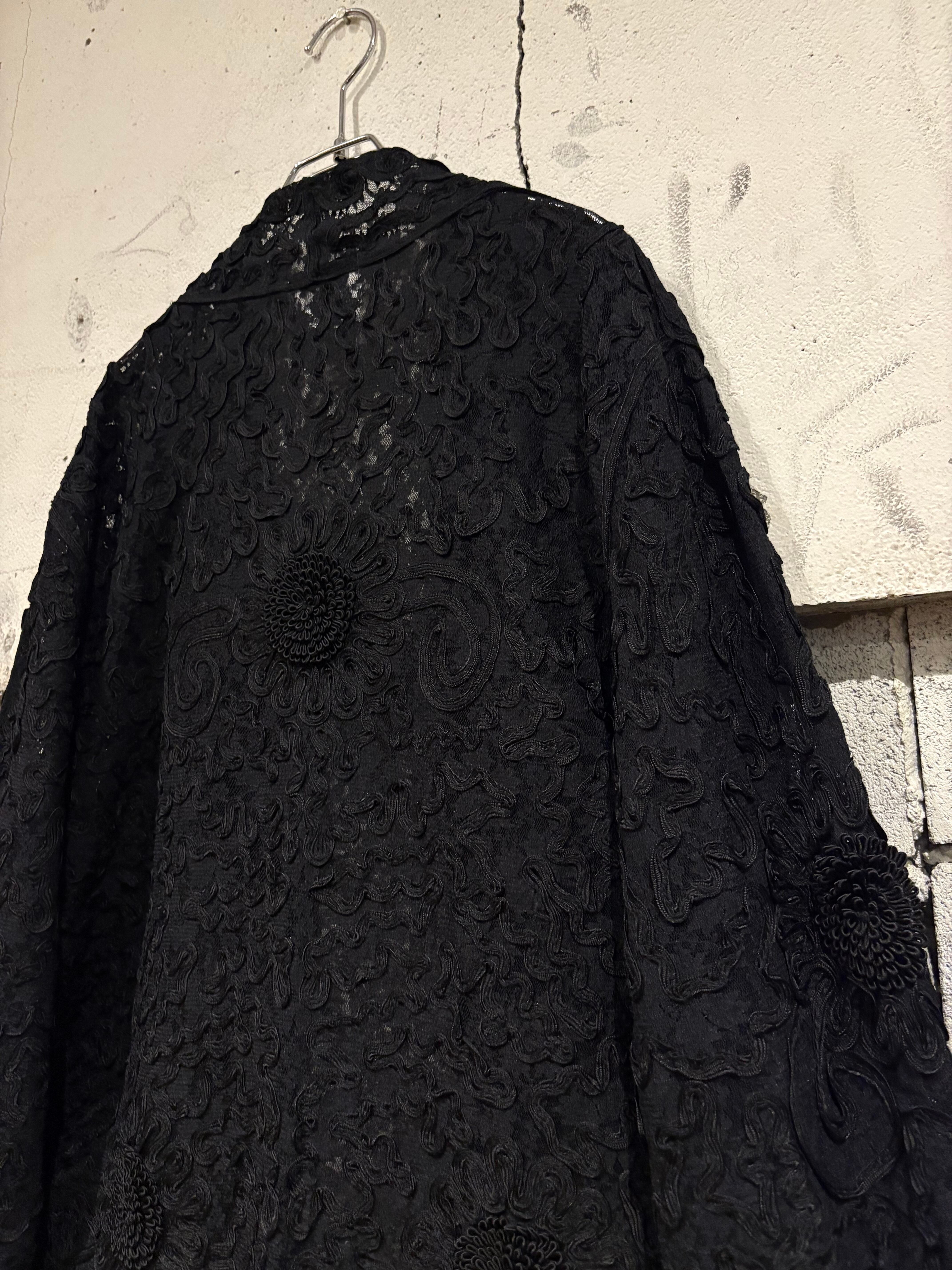 透け感の美しい上質なブラックシアーに花柄を散りばめ、さらにその上からアーティスティックかつ唯一無二感の漂う柄模様を載せたシアージャケットをご紹介致します。