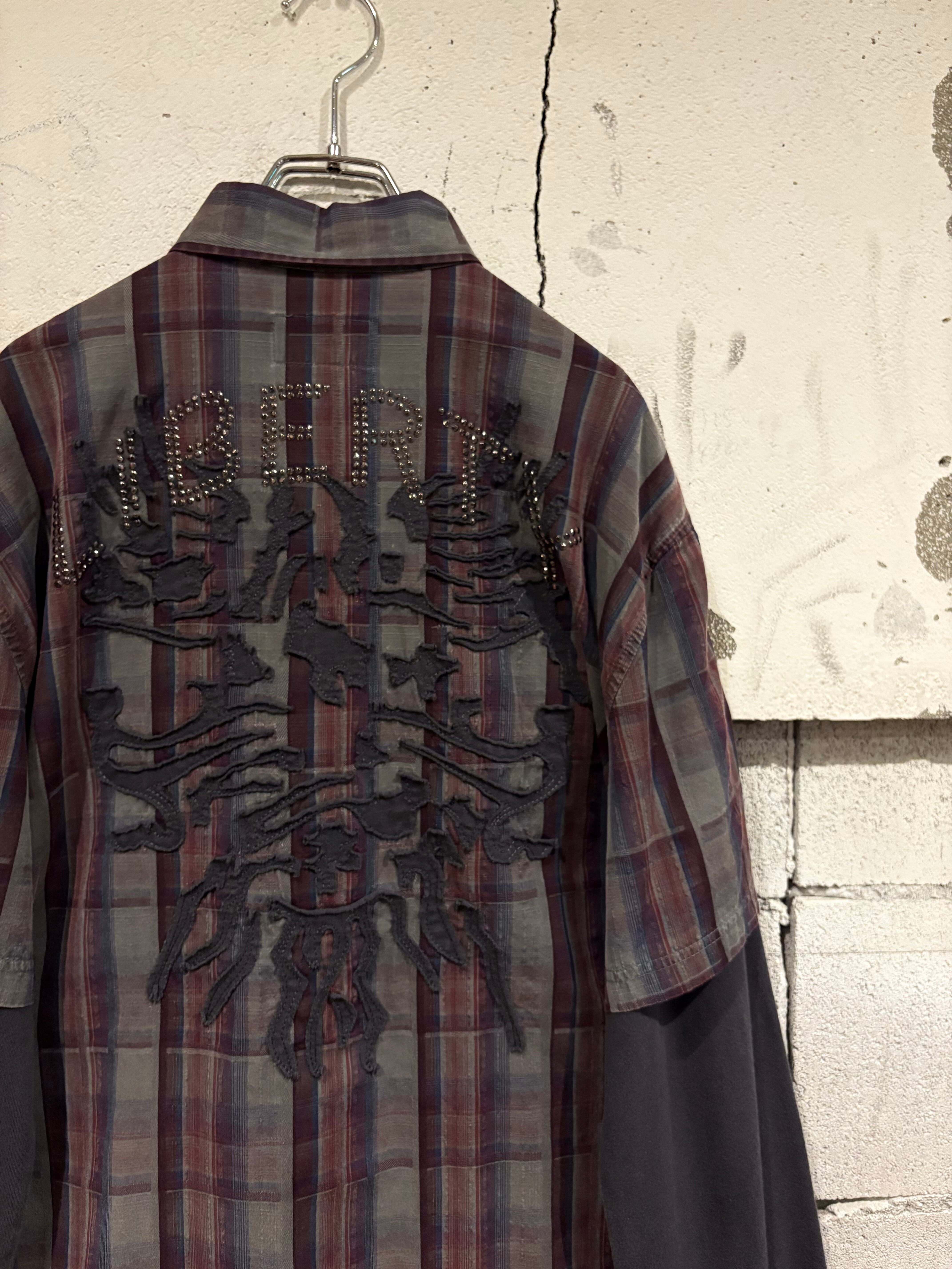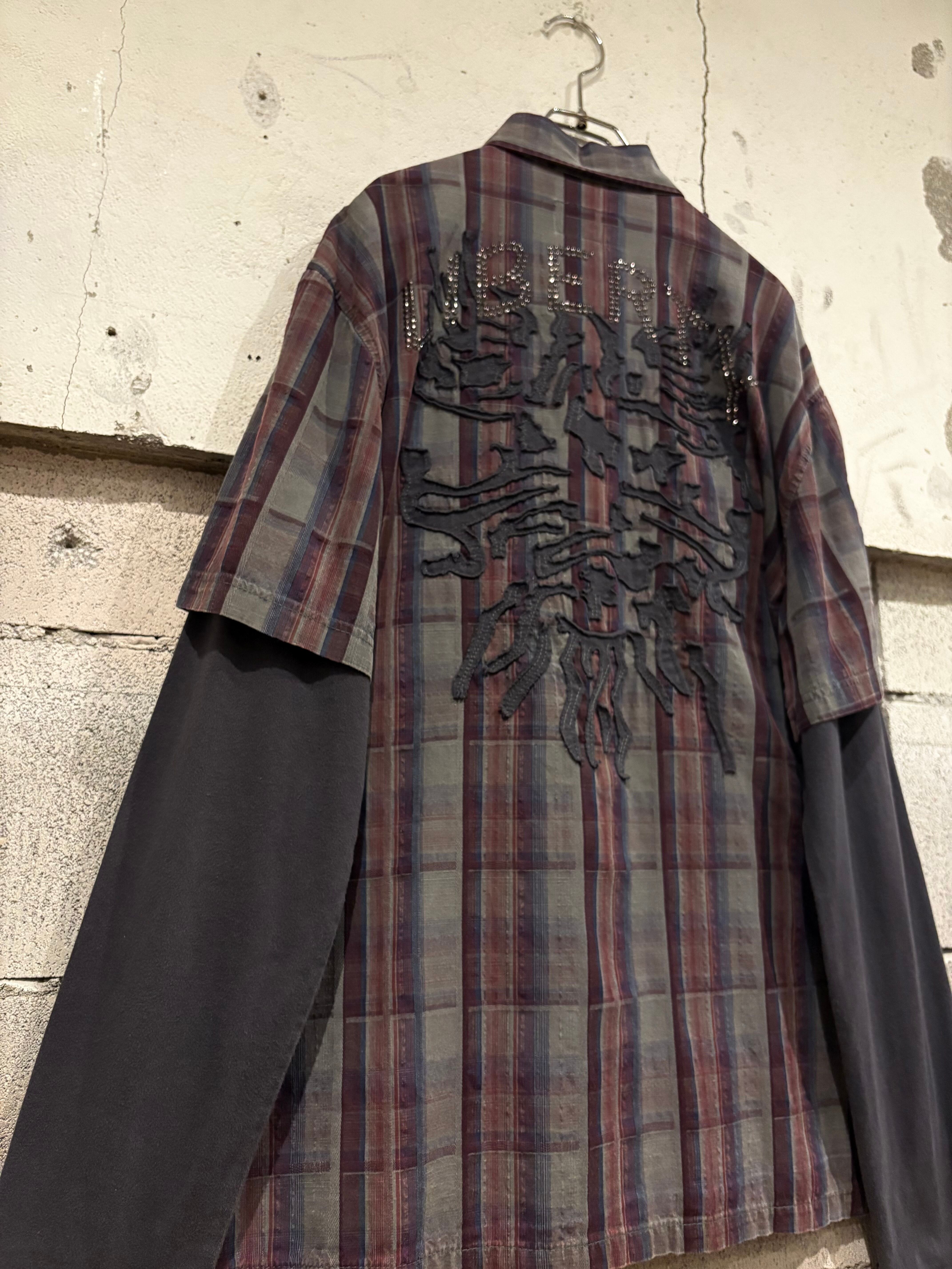 ブラックのロンTの上から半袖チェックシャツを羽織った様な、レイヤード風のデザインに仕上げた長袖シャツ。