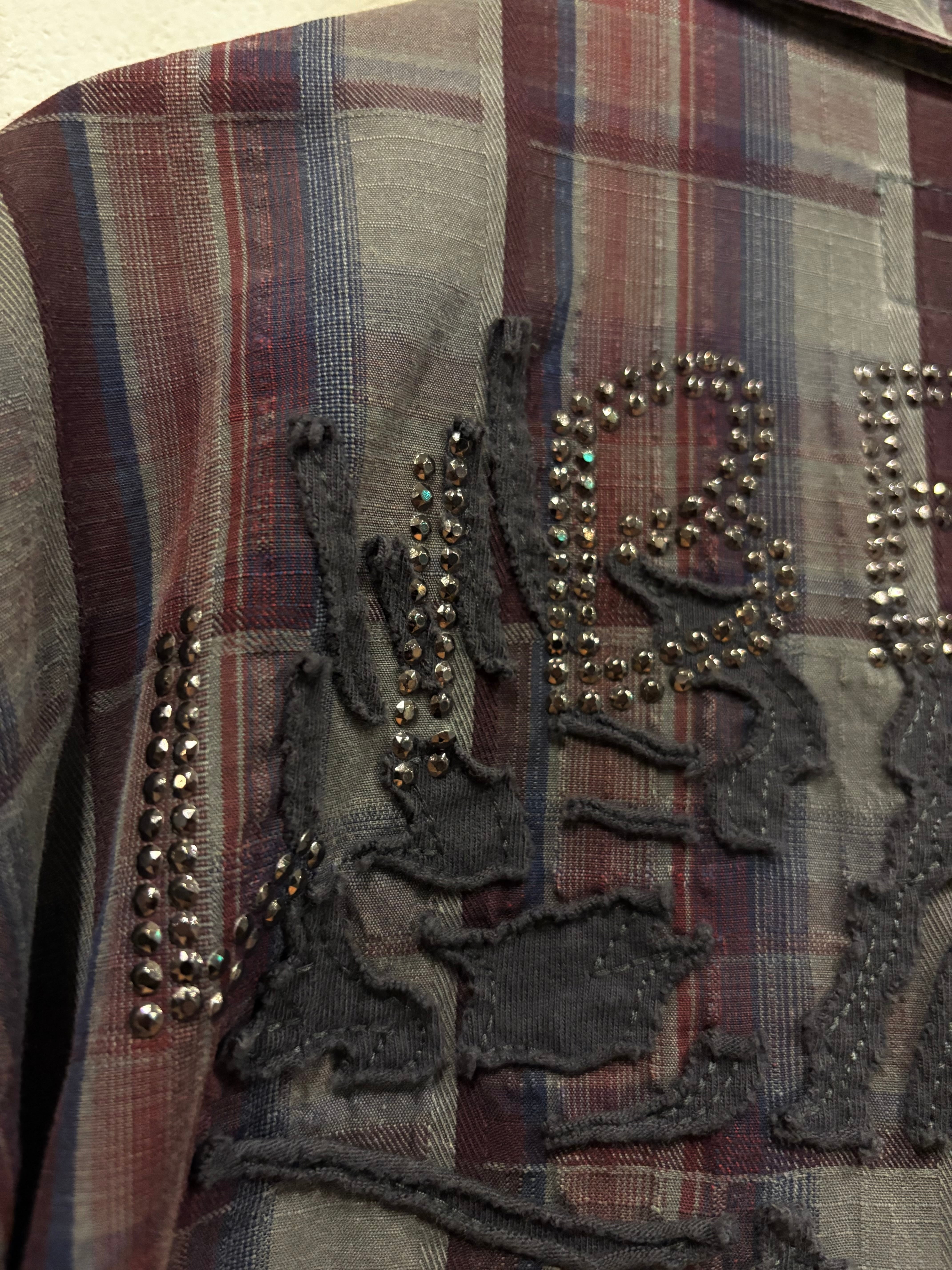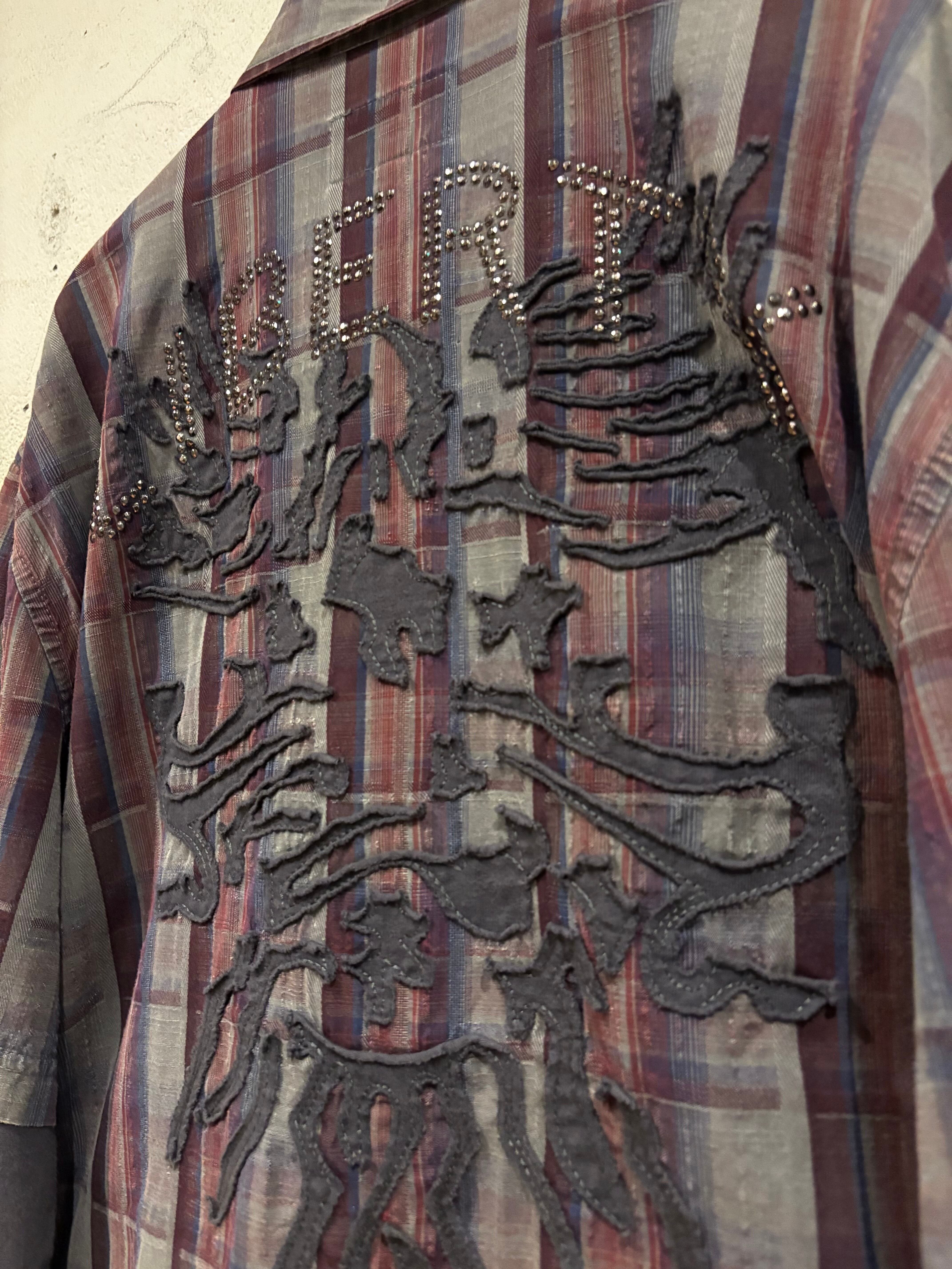 右胸にはフラップポケット、左胸や背面にはスタッズでロゴを、さらにカットオフした生地でトライバル風のデザインが施されてたりと、デザインのクオリティが高い1着かと。