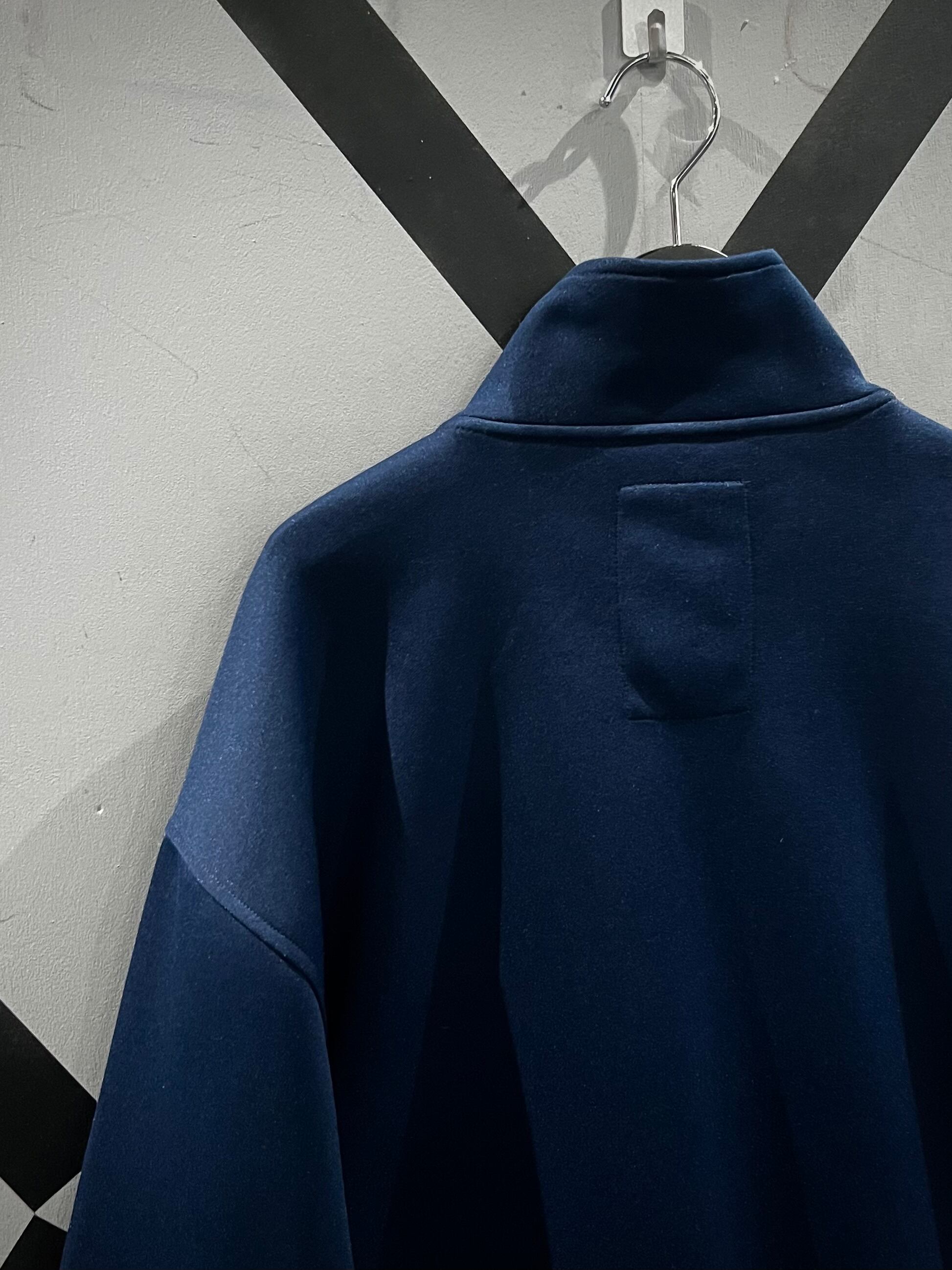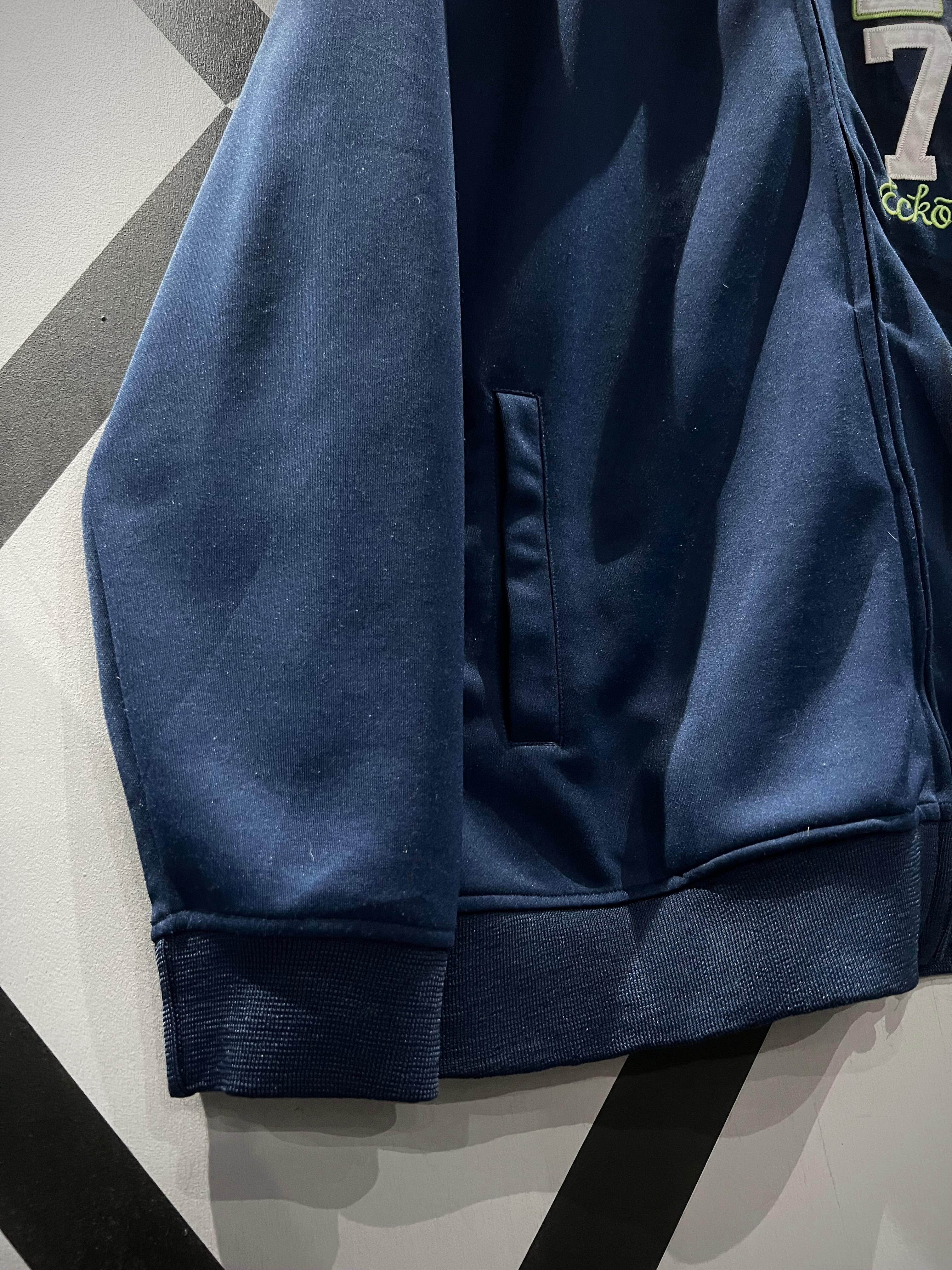 ネイビーのボディをベースに、左胸に黒色のプリントでブランドロゴを載せ、さらにその上から刺繍でブランドイニシャル、ナンバリングを載せたトラックジャケット。
