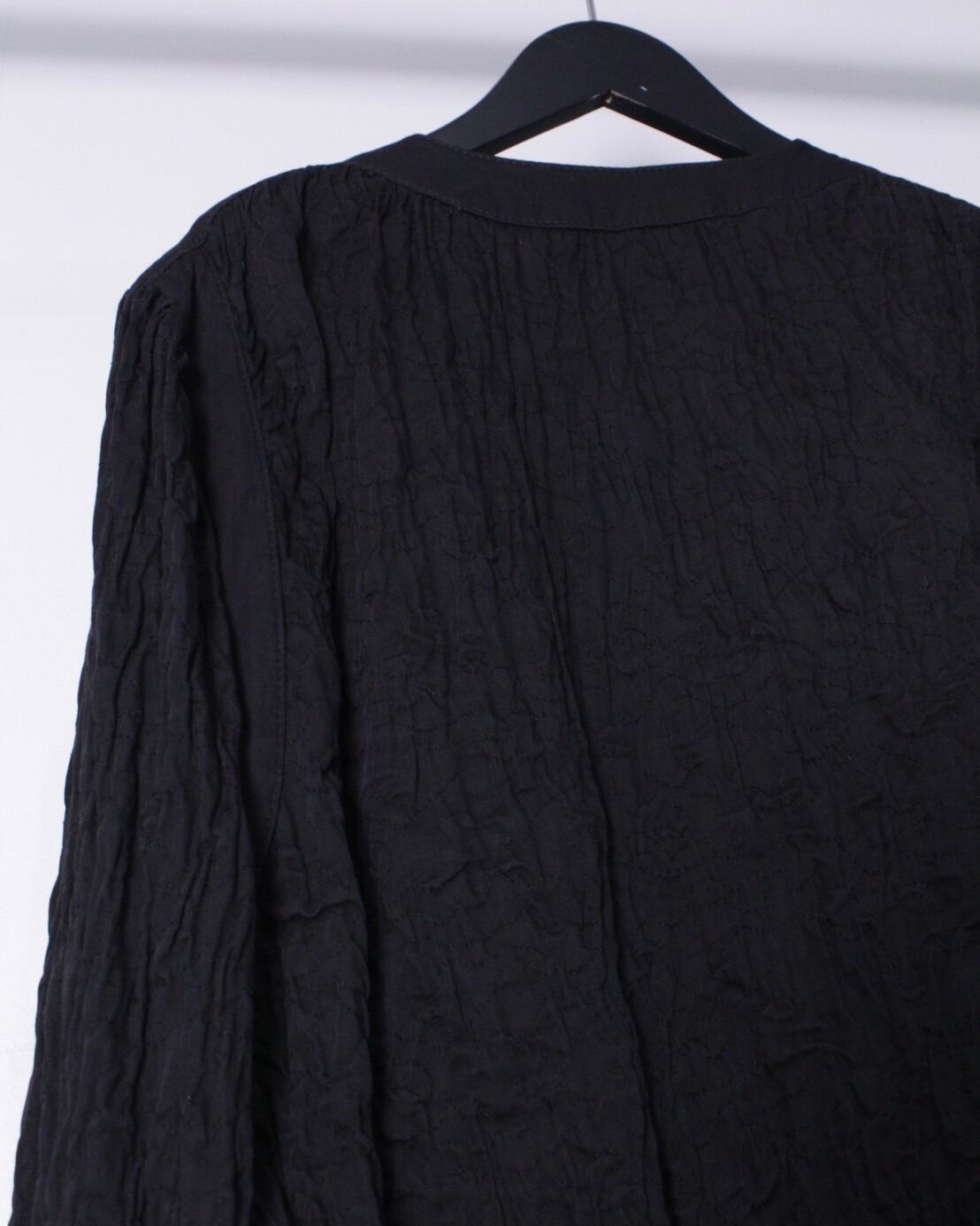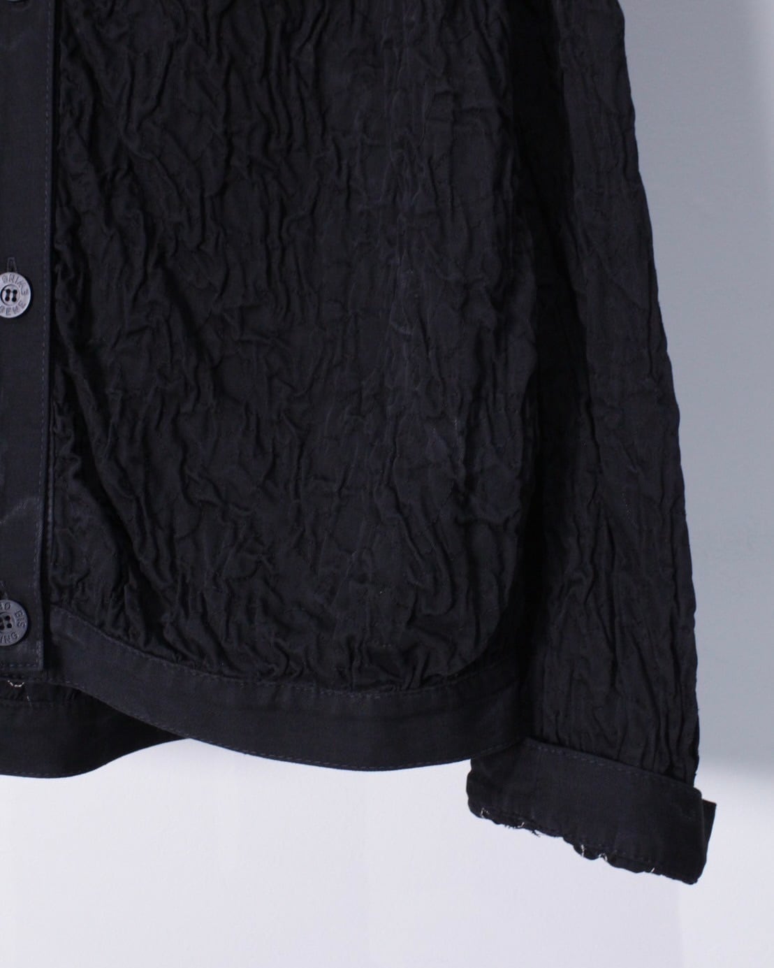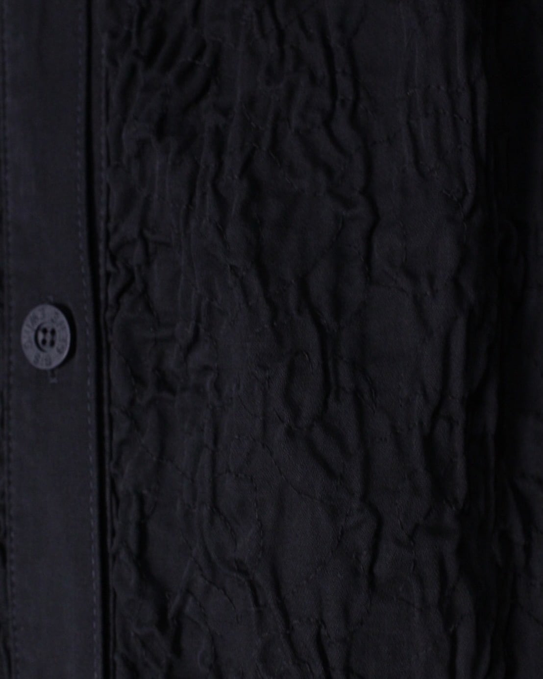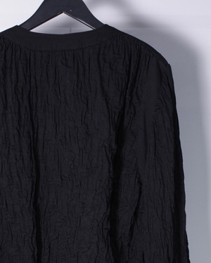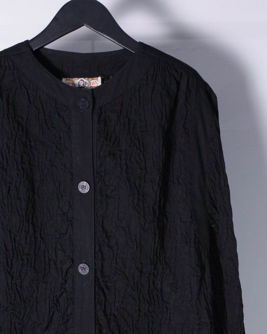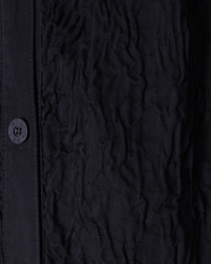 サラッとしたブラックのファブリックをボディに用い、全体にシュリンク加工を施したノーカラーシャツジャケット。