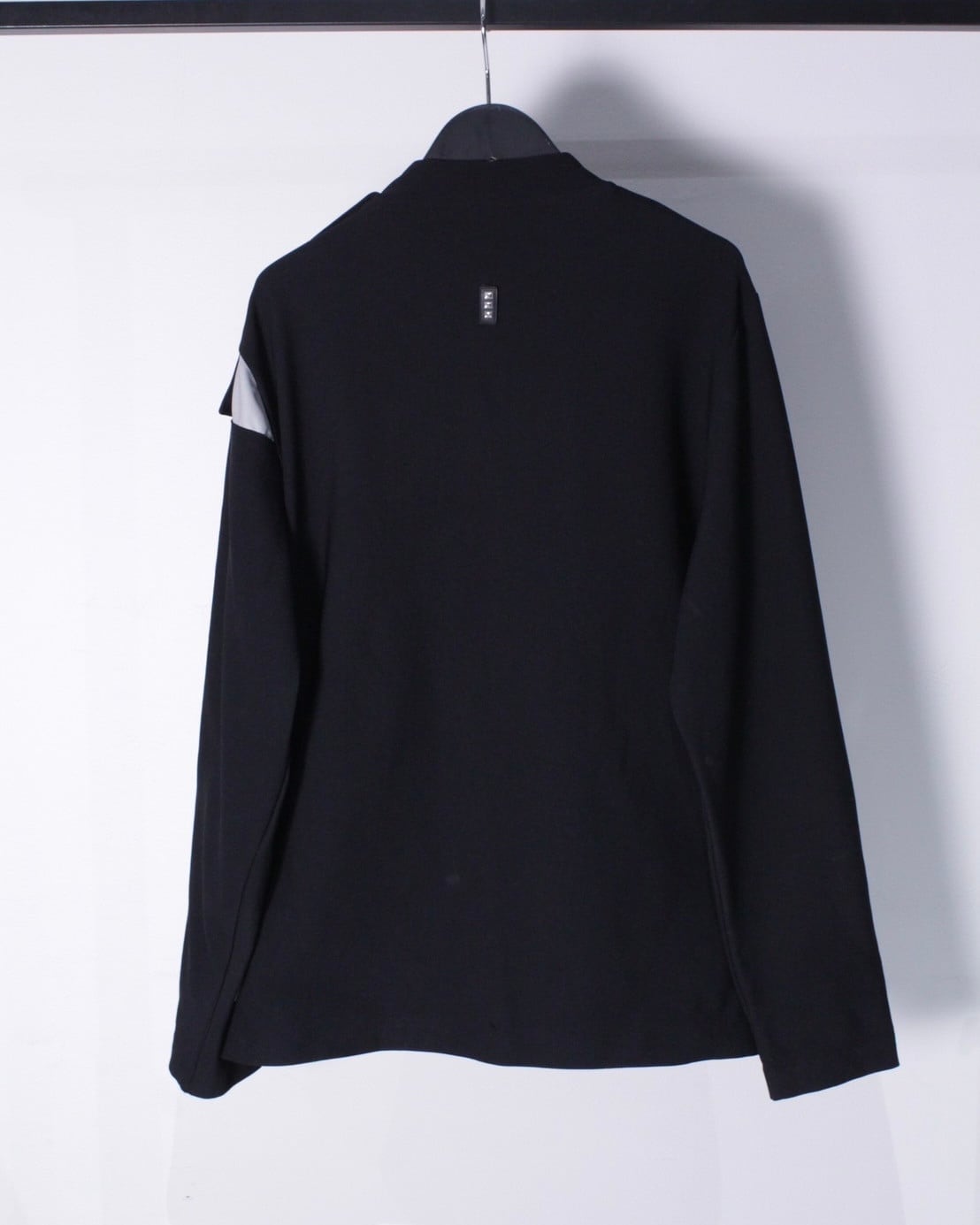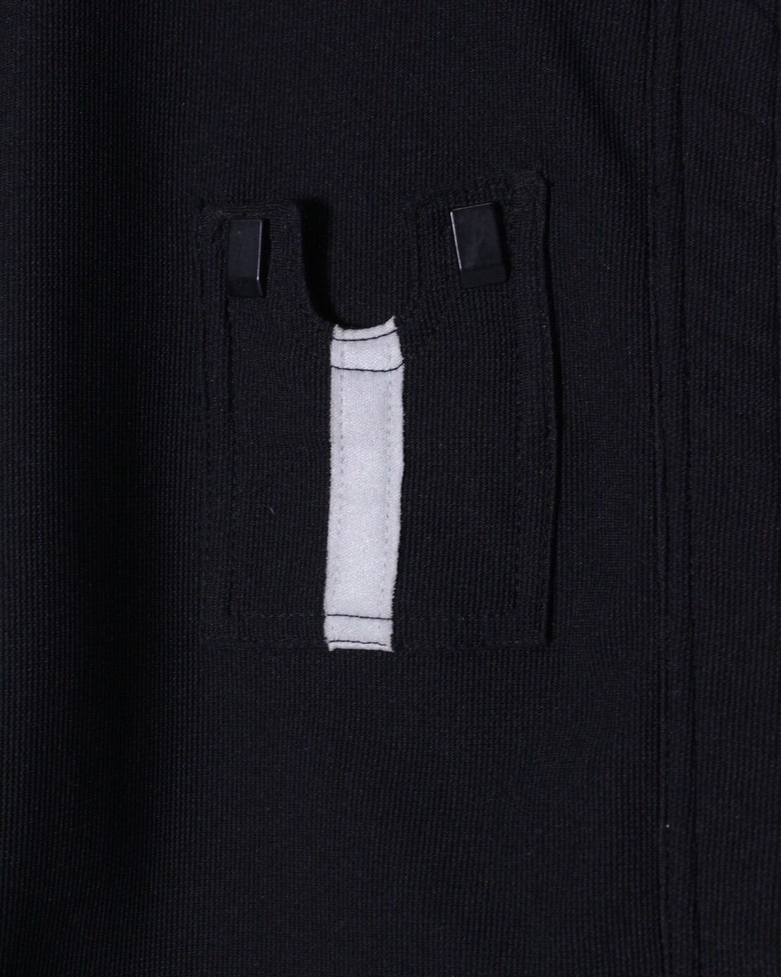 サラッと柔らかく特有の光沢を持つブラックのボディをベースに、胸には小ぶりのポケット、左肩にはエポレットのようなディテール、左アームにはジップが施され、全て開ける仕様に。