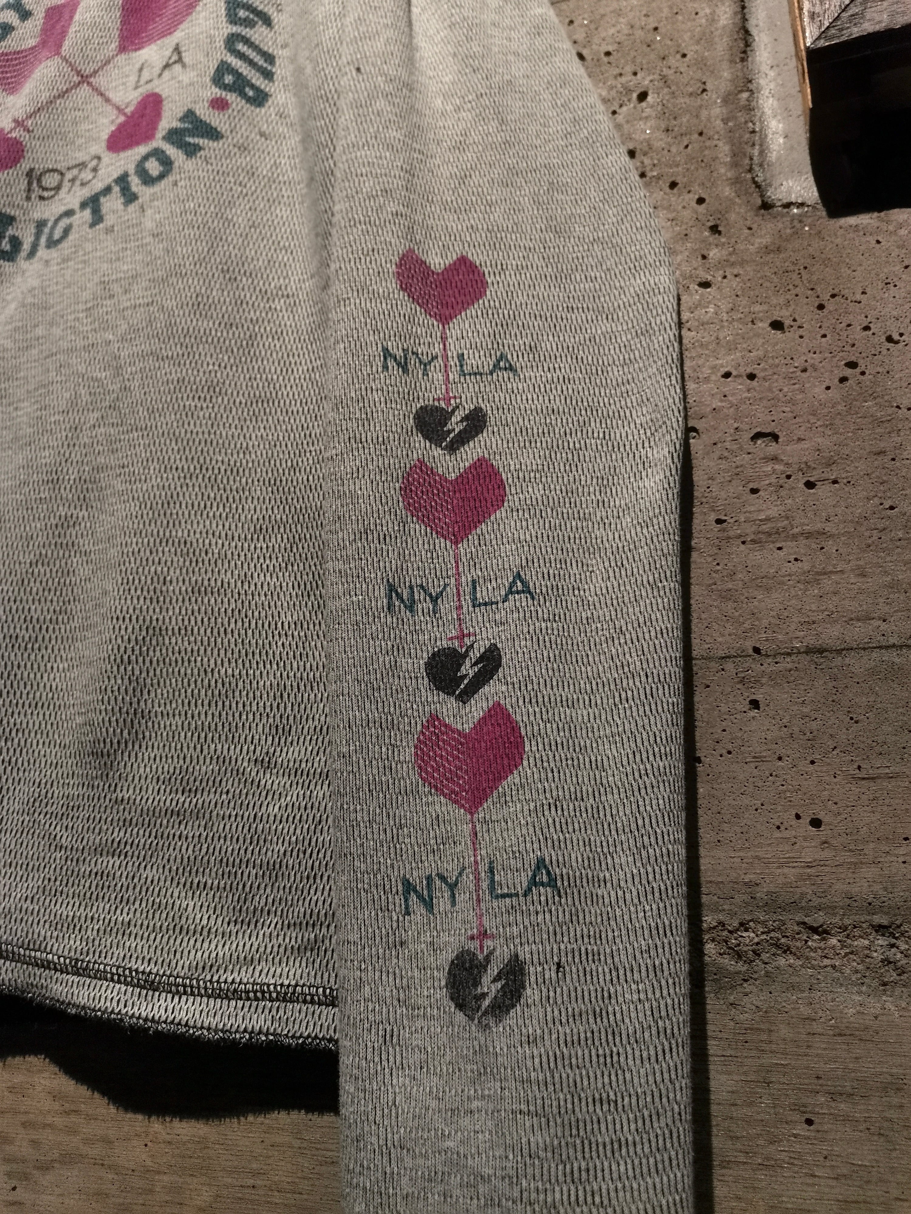 表の墨黒の面にはハートをモチーフとしたアメリカンなプリントをON。白の面にはラブリーなプリントを載せた、表裏でのギャップのあるデザインが◎