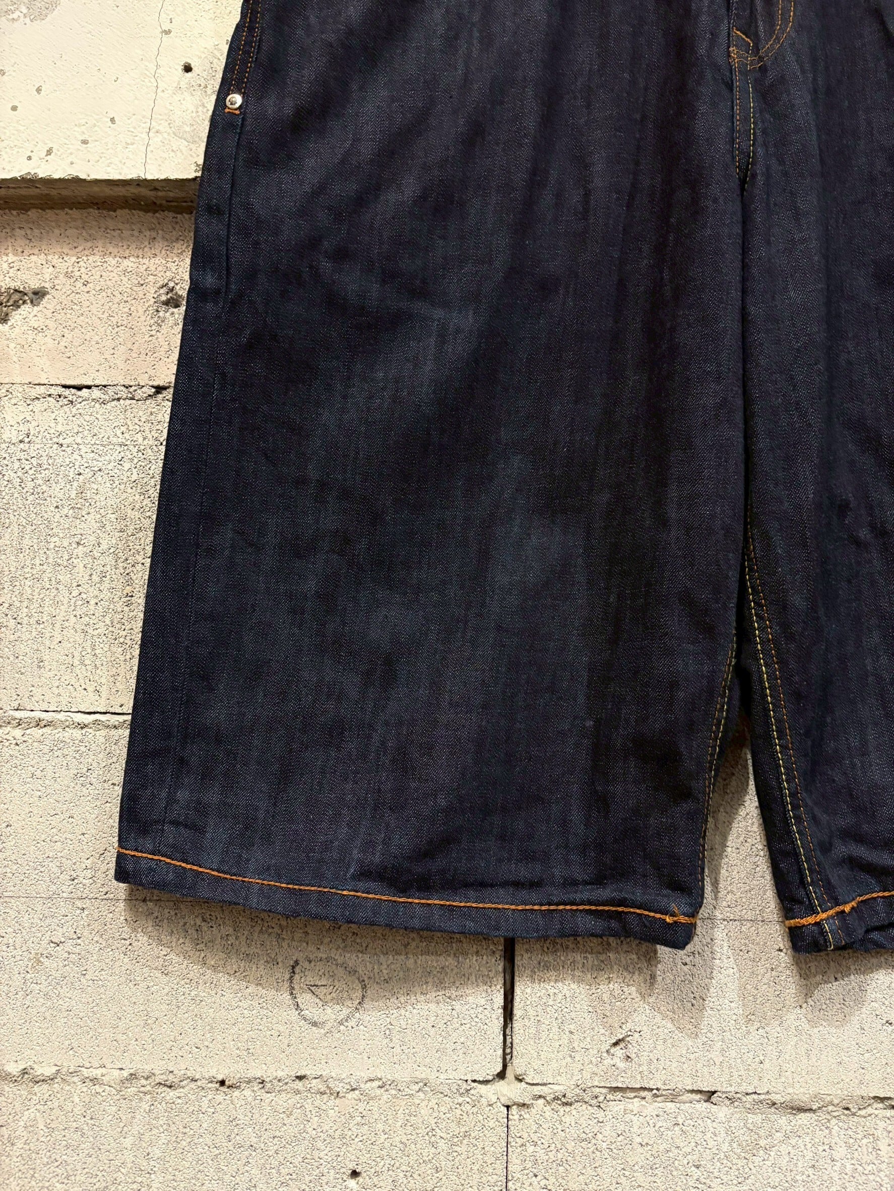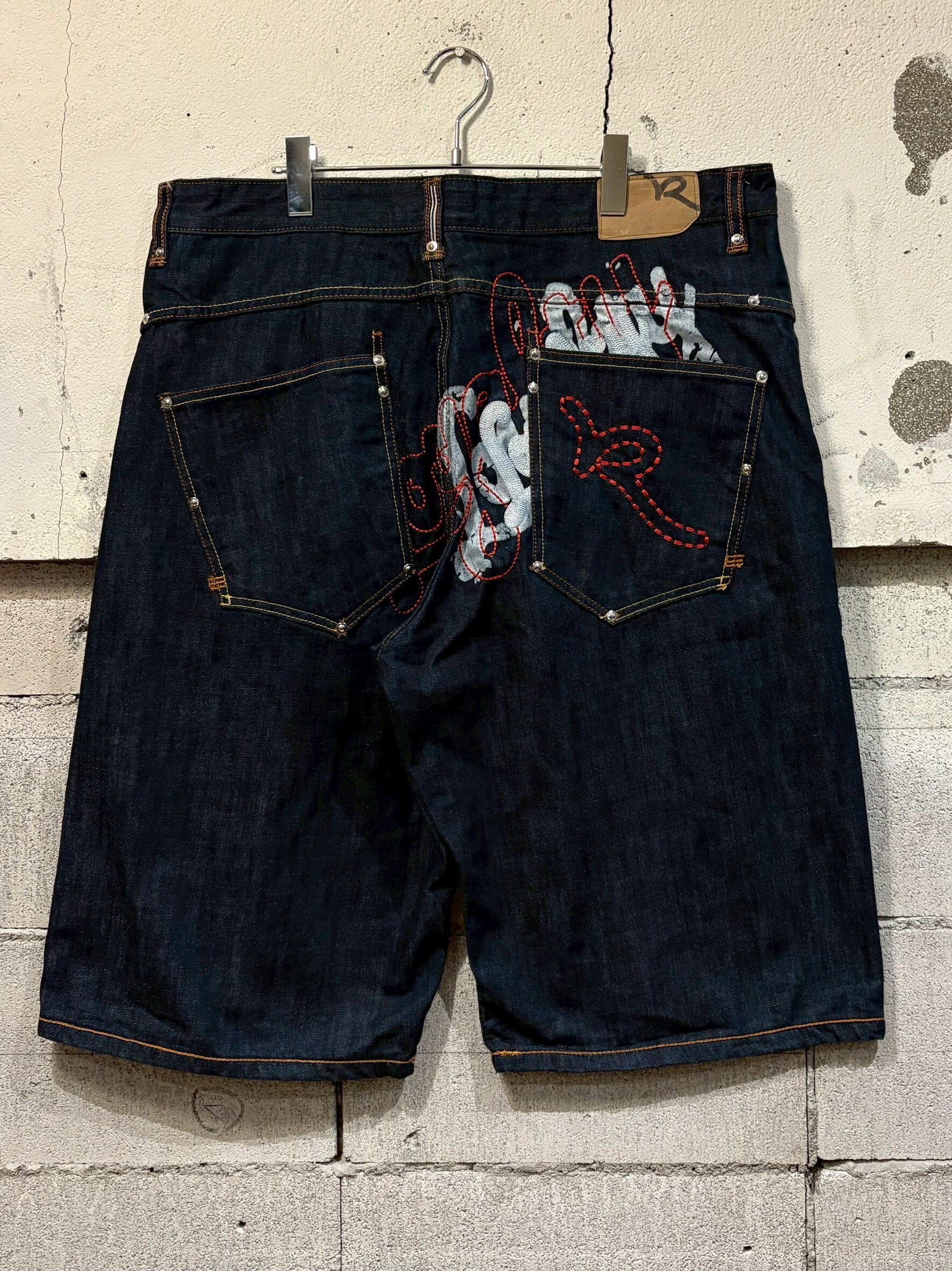 色残りがしっかりとあるインディゴブルーのボディをベースに、背面ポケット、そのまわりにブランドロゴと文字デザインを刺繍で施したデニムショーツ。