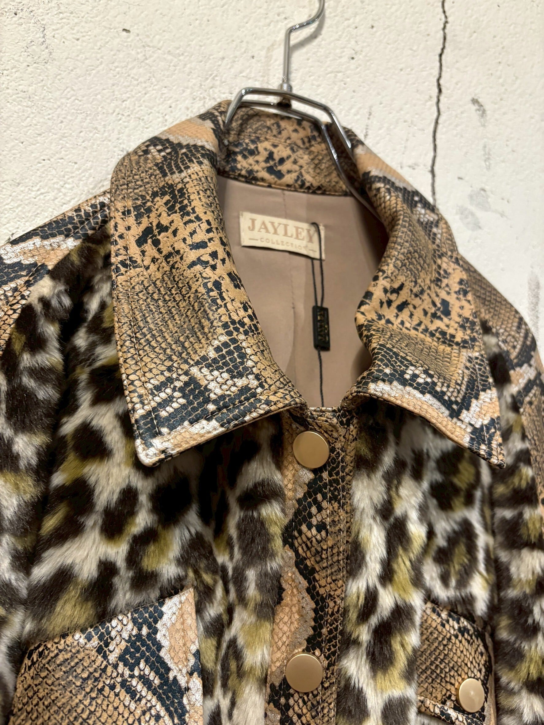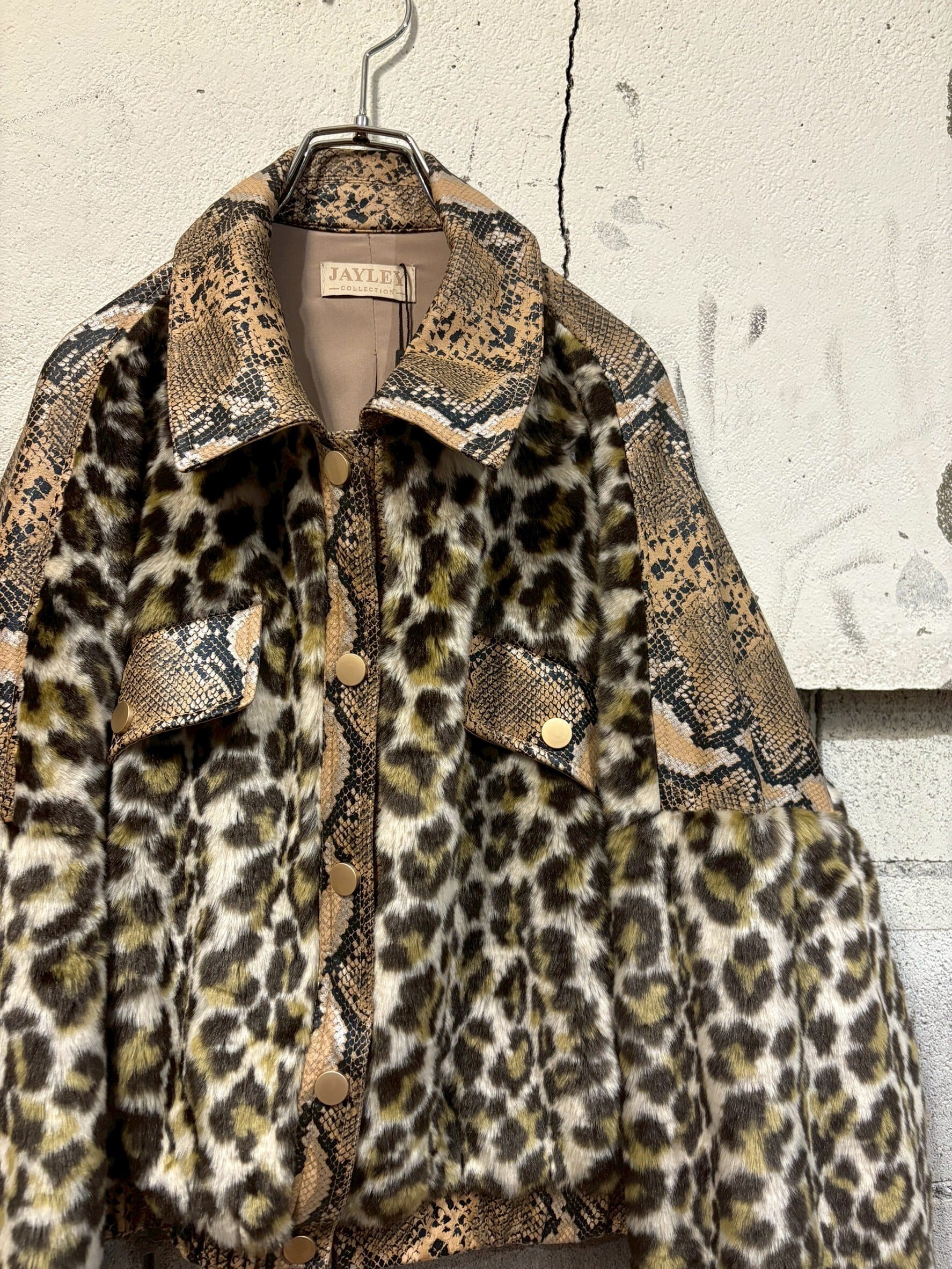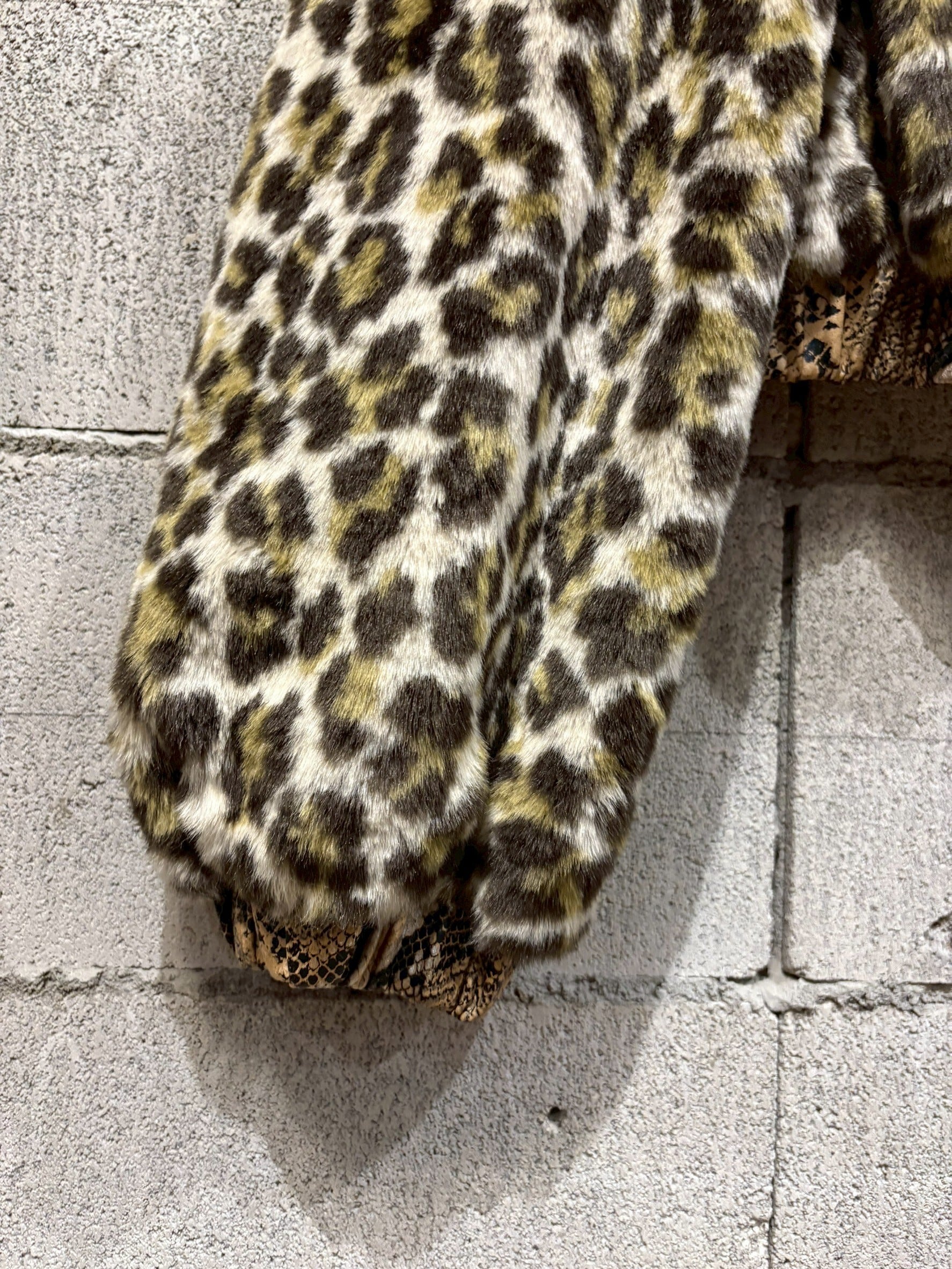 フワッと柔らかなエコファー素材を用いたボディをベースに、レオパード柄を載せ、襟や両胸のフラップ、前立てや袖口、裾にパイソン柄を切り替えたジャケット。