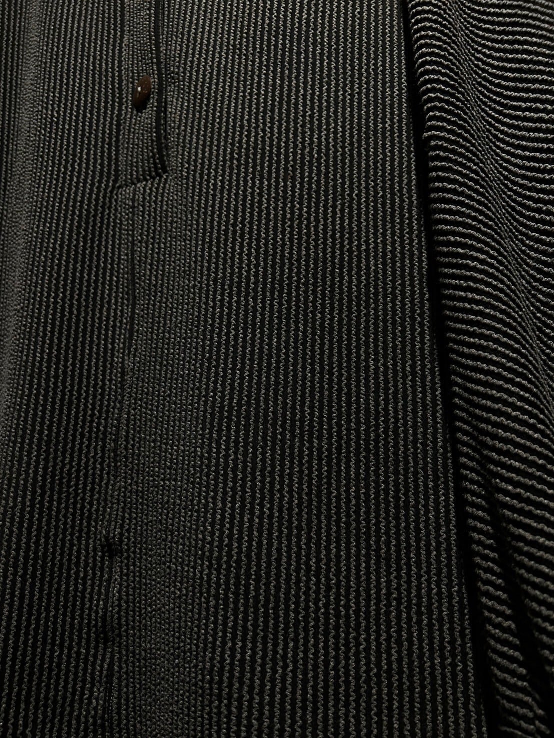 伸縮性のあるポリエステル素材を採用したボディに、うねりのあるストライプ状のラインを全面に施したハーフボタン仕様のシャツ。
