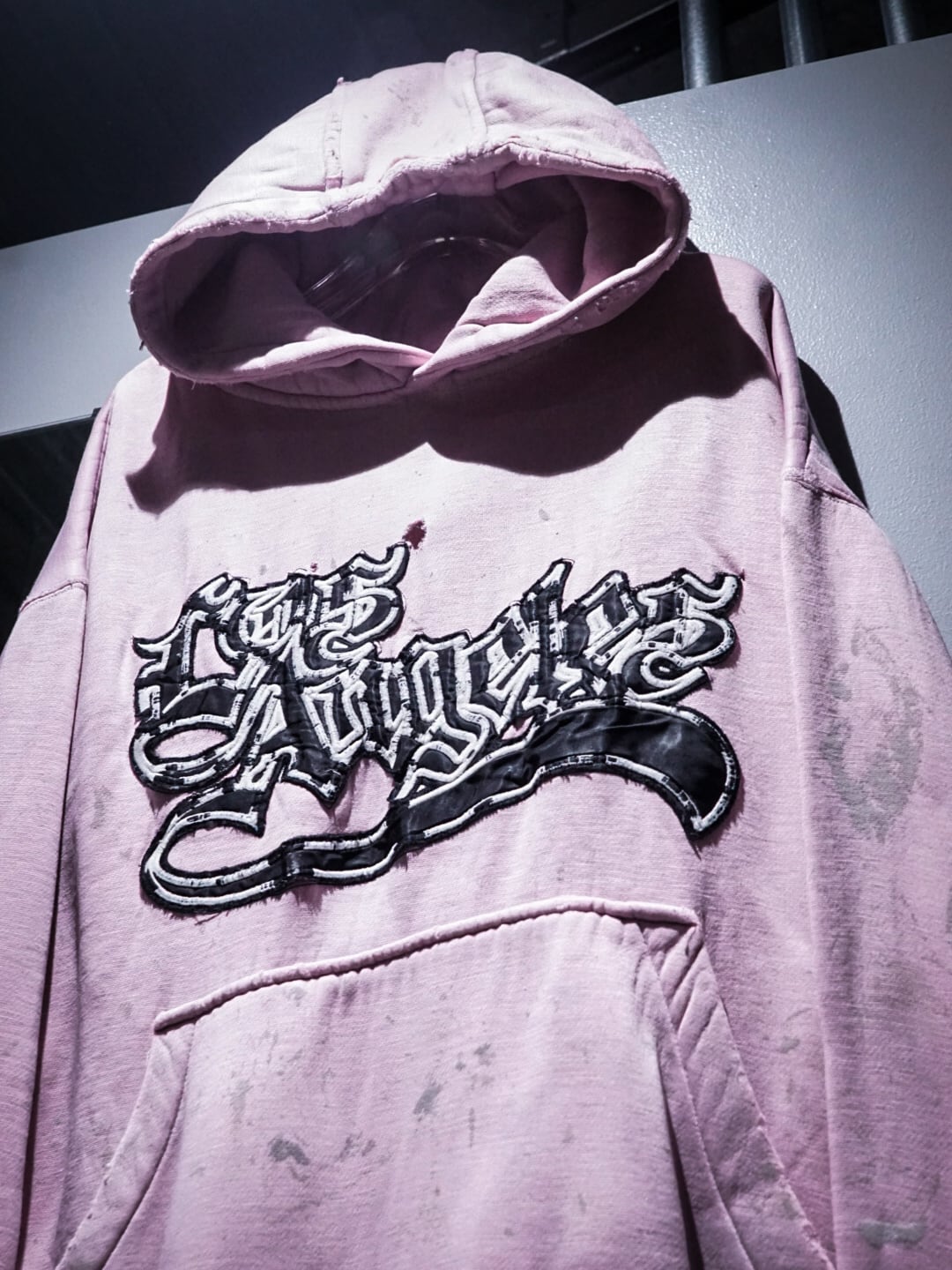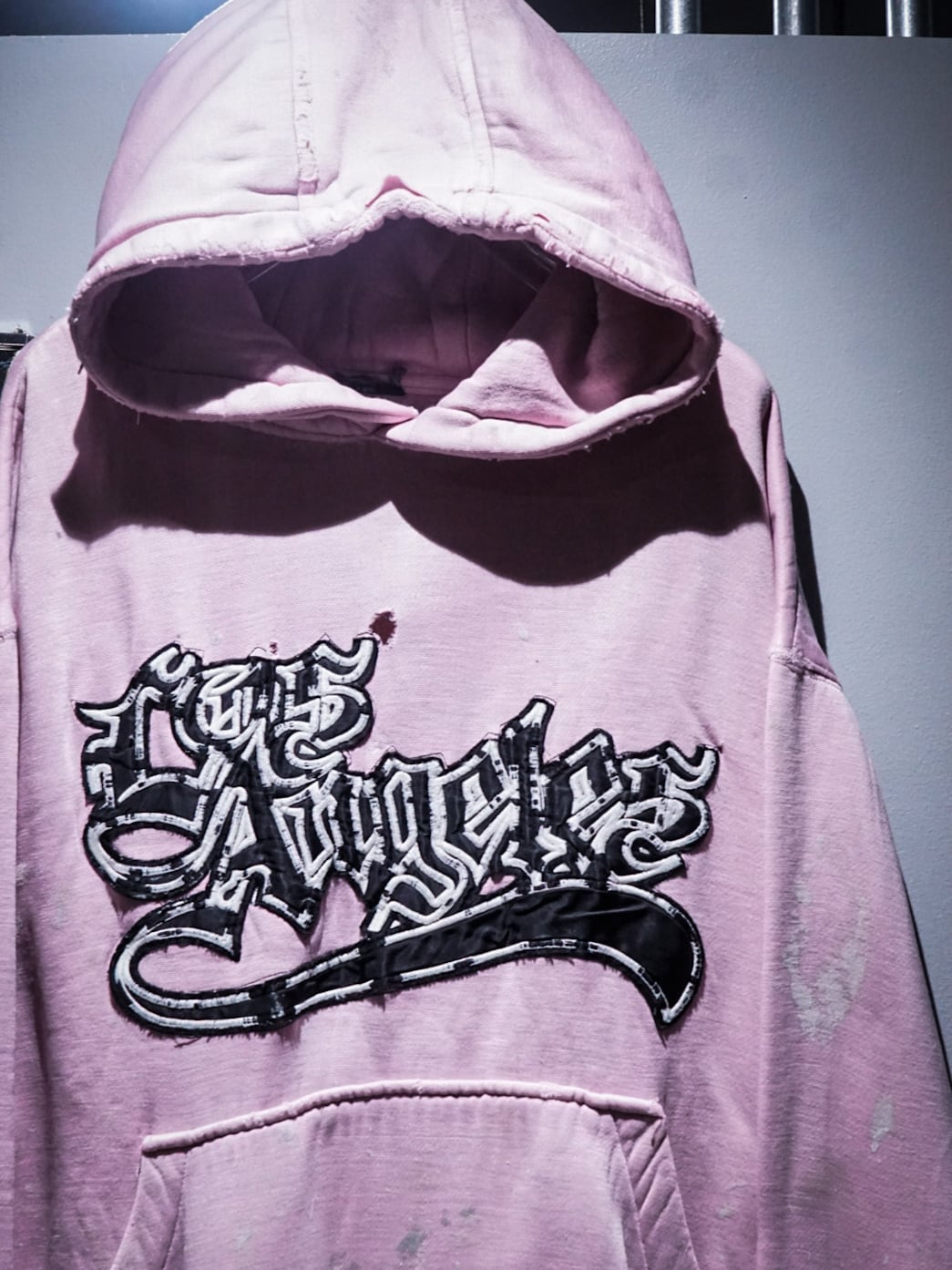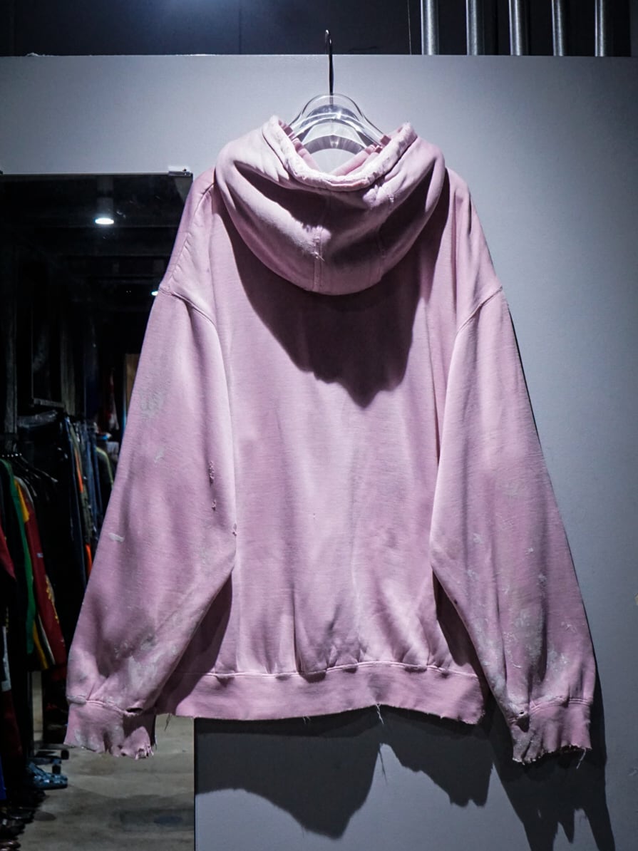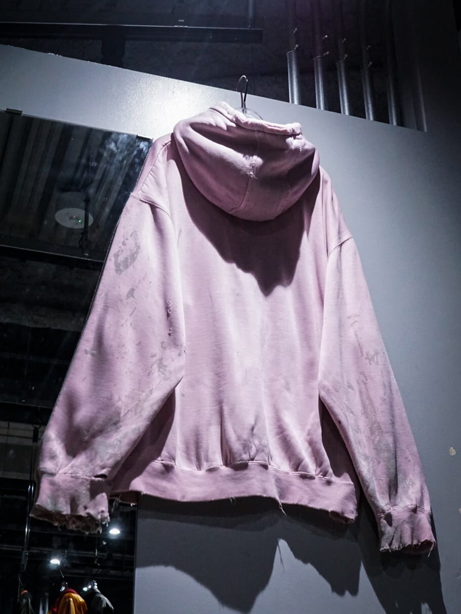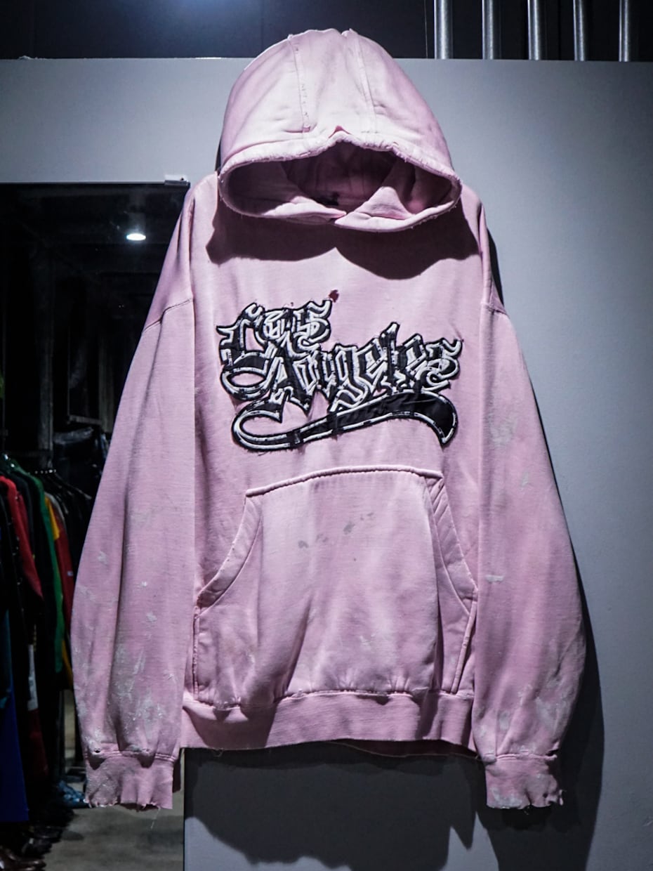 "LOS ANGELES"のパッチがフロントに施された柔らかなピンクカラーのボディに、随所にペイントやダメージが加えられたプルオーバーフーディ。