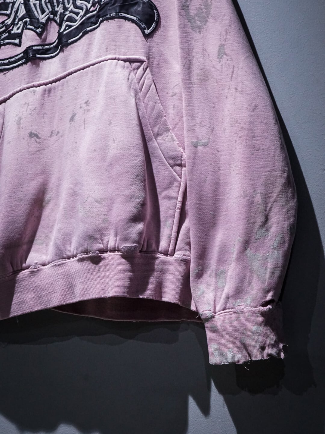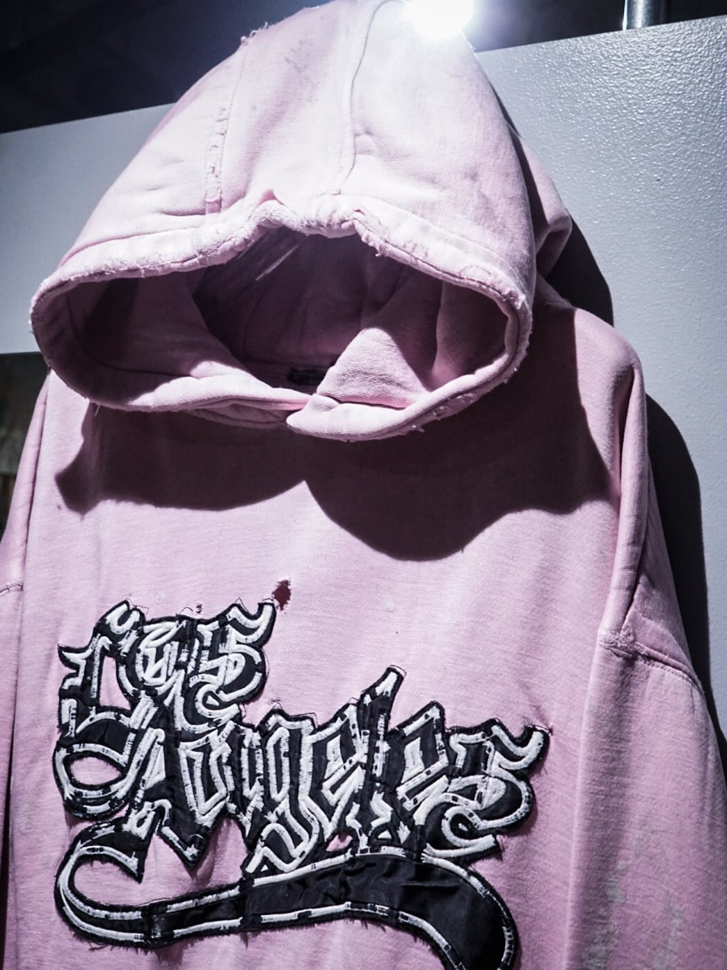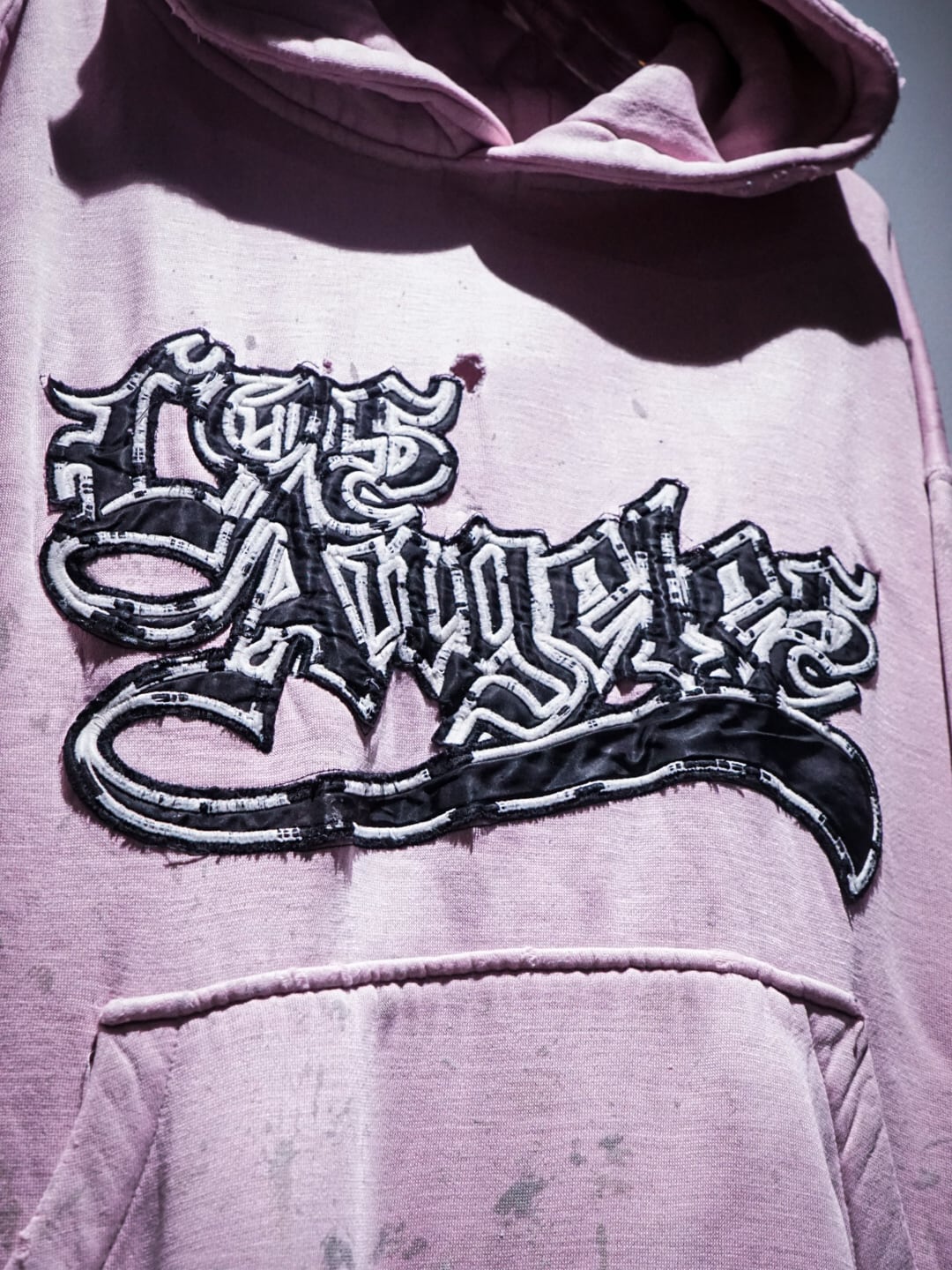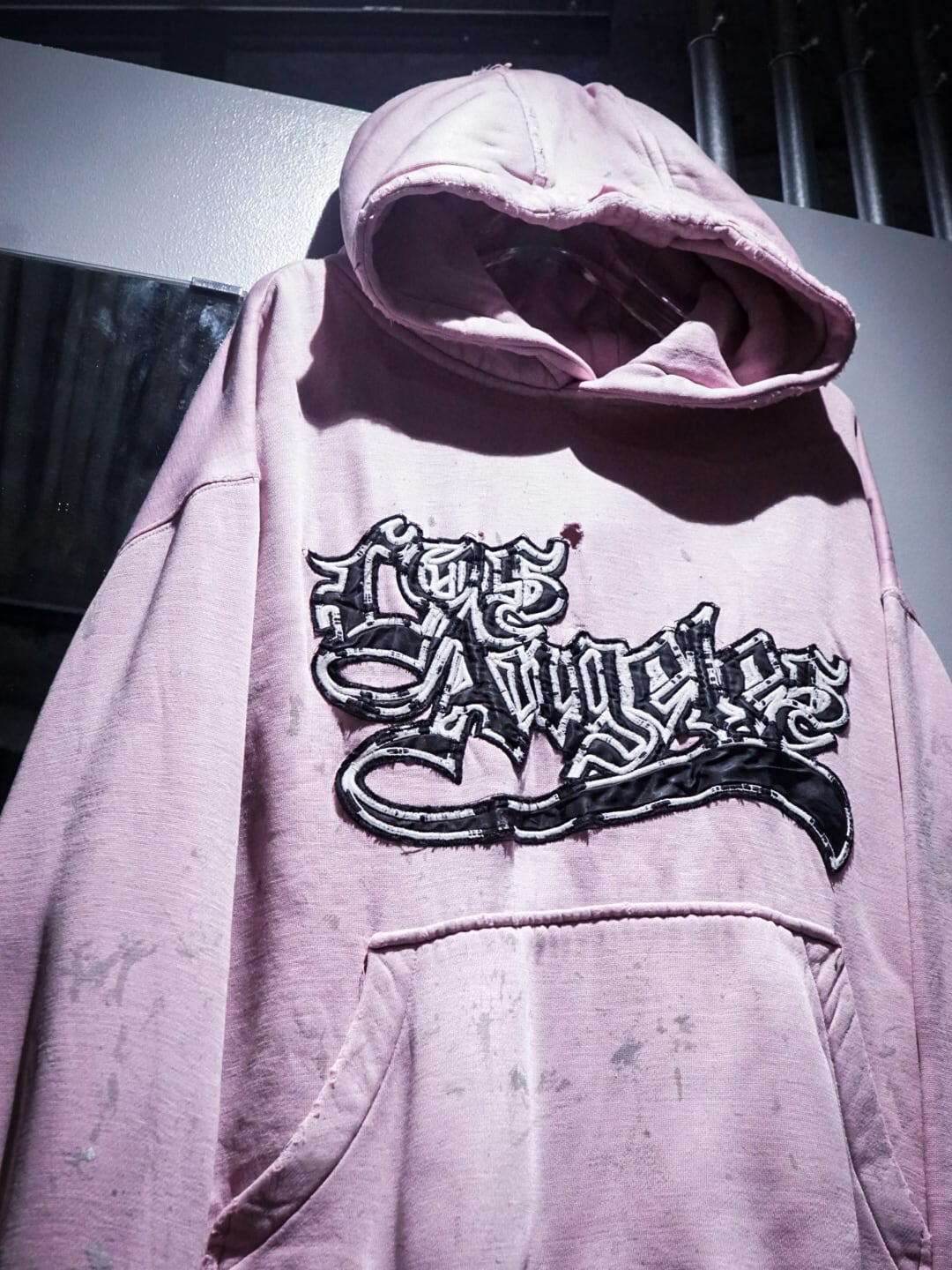 "LOS ANGELES"のパッチがフロントに施された柔らかなピンクカラーのボディに、随所にペイントやダメージが加えられたプルオーバーフーディ。