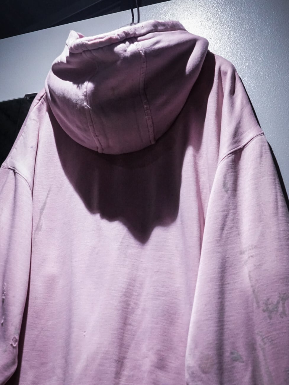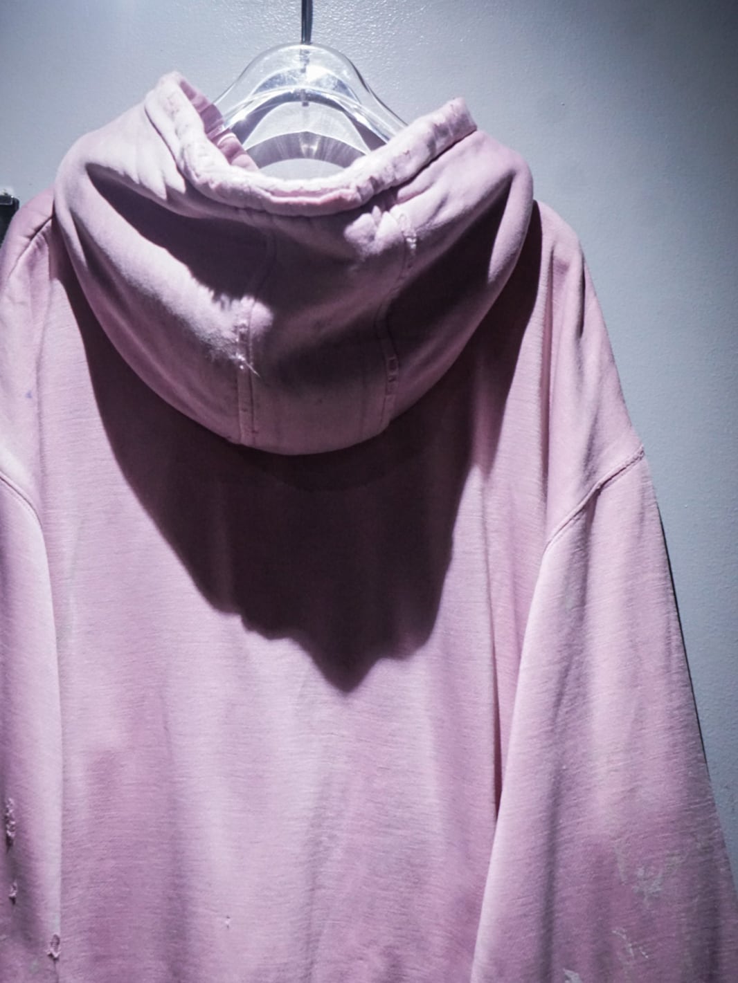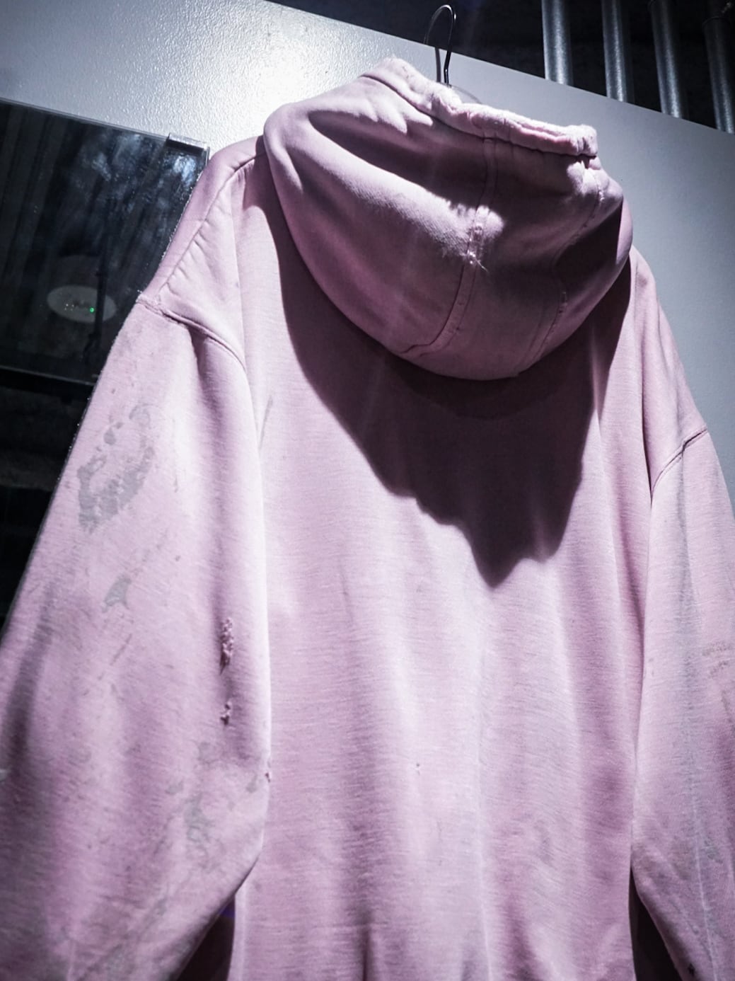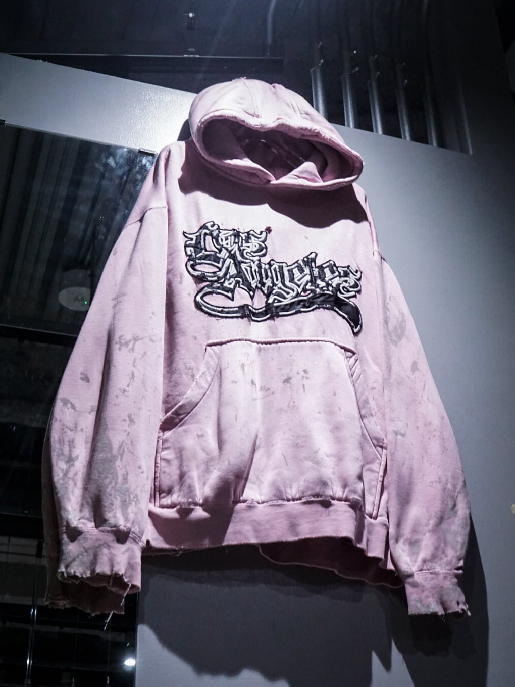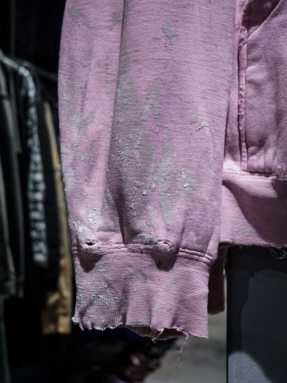 "LOS ANGELES"のパッチがフロントに施された柔らかなピンクカラーのボディに、随所にペイントやダメージが加えられたプルオーバーフーディ。