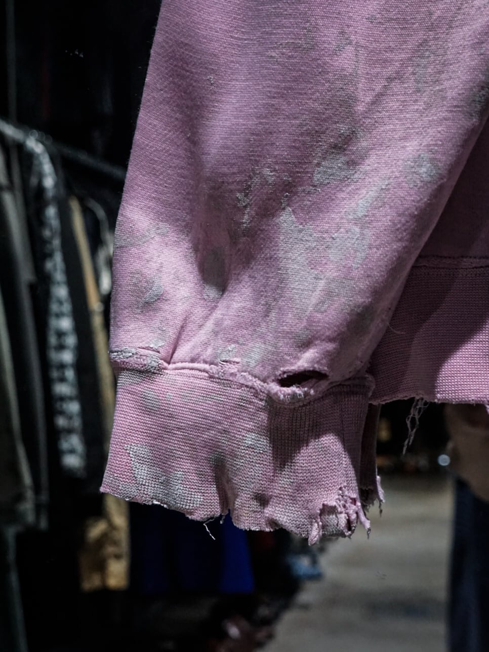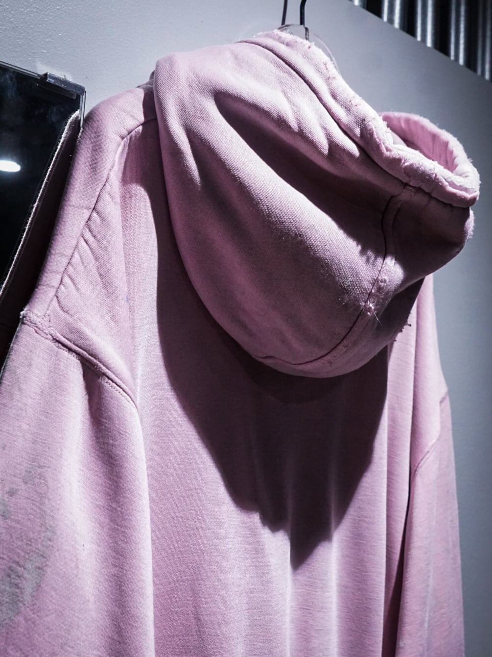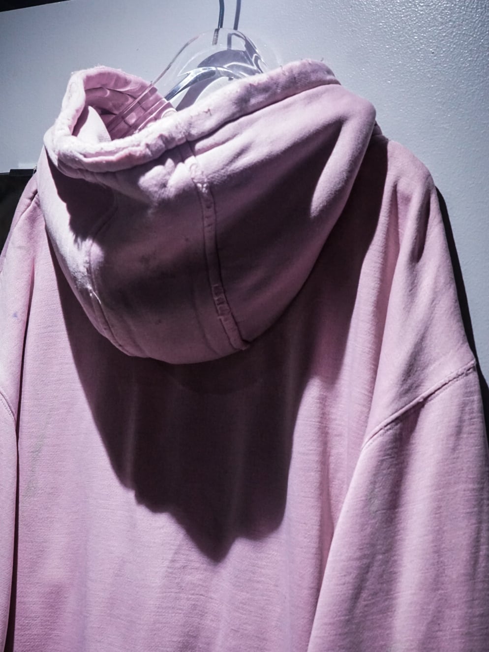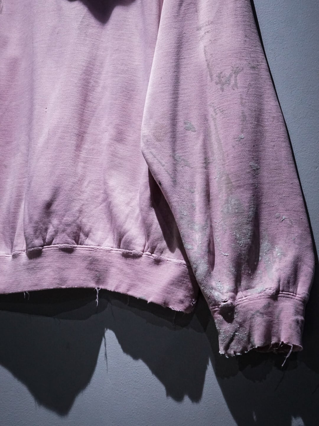 "LOS ANGELES"のパッチがフロントに施された柔らかなピンクカラーのボディに、随所にペイントやダメージが加えられたプルオーバーフーディ。
