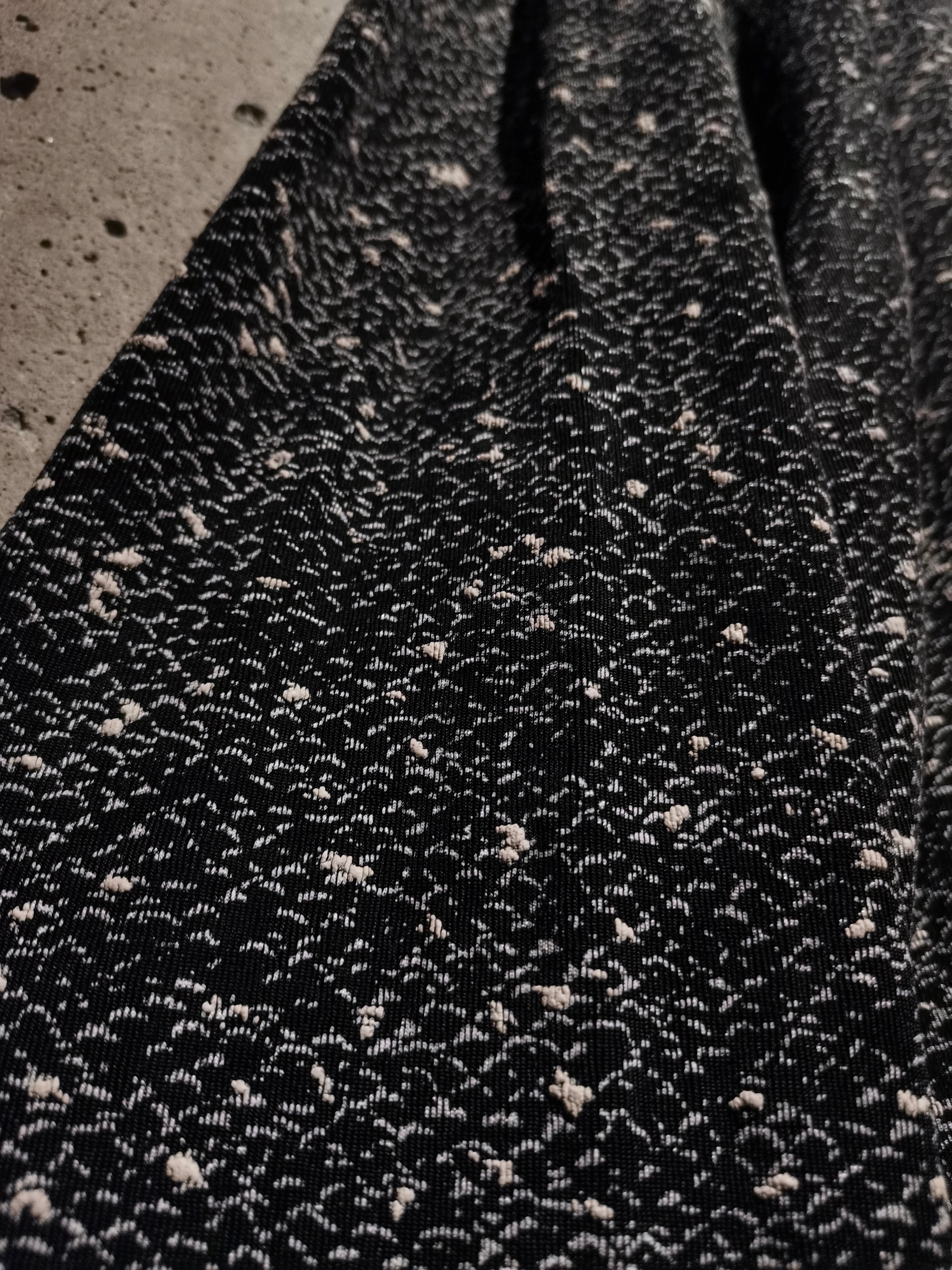 伸縮性の高いストレッチ生地をボディに用いて、黒×白のモノトーンのカラーリングで鱗状の細かな柄をボディ全体に載せたジップアップジャケット。