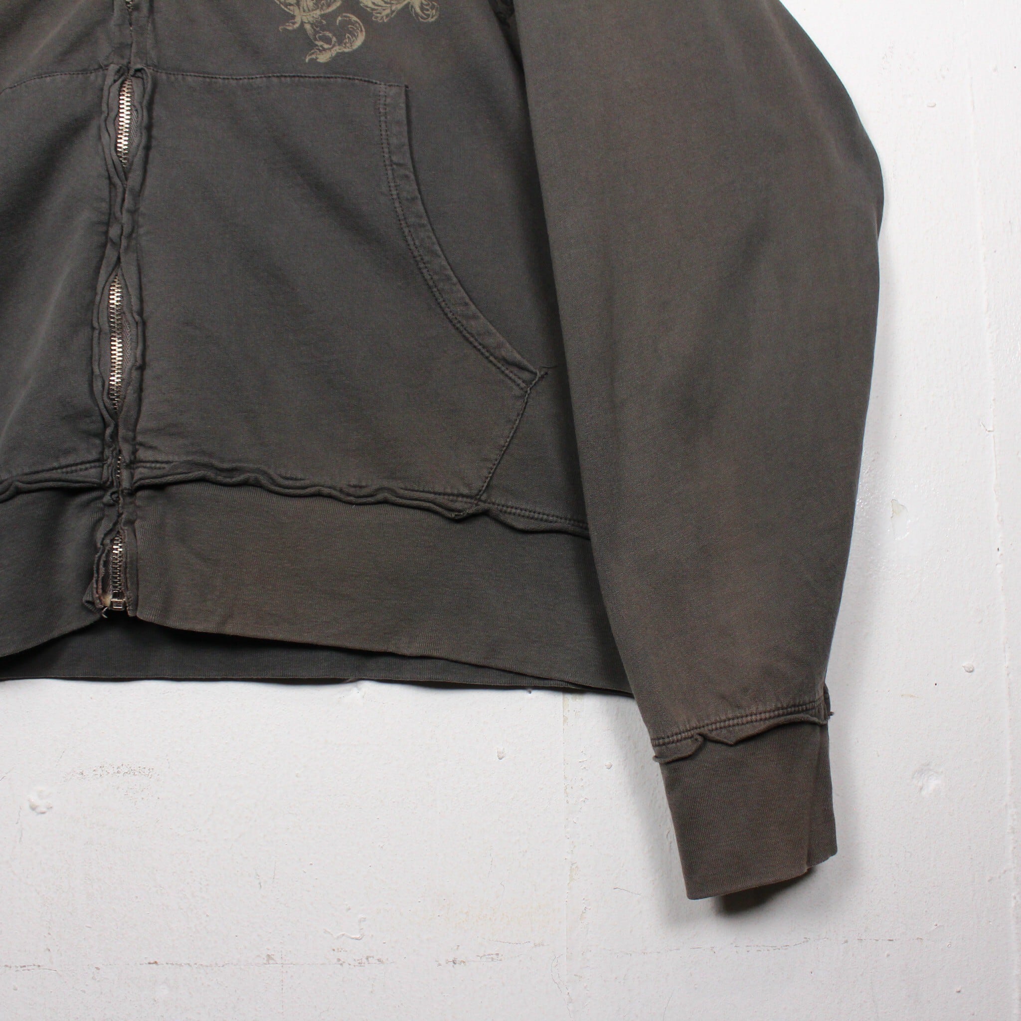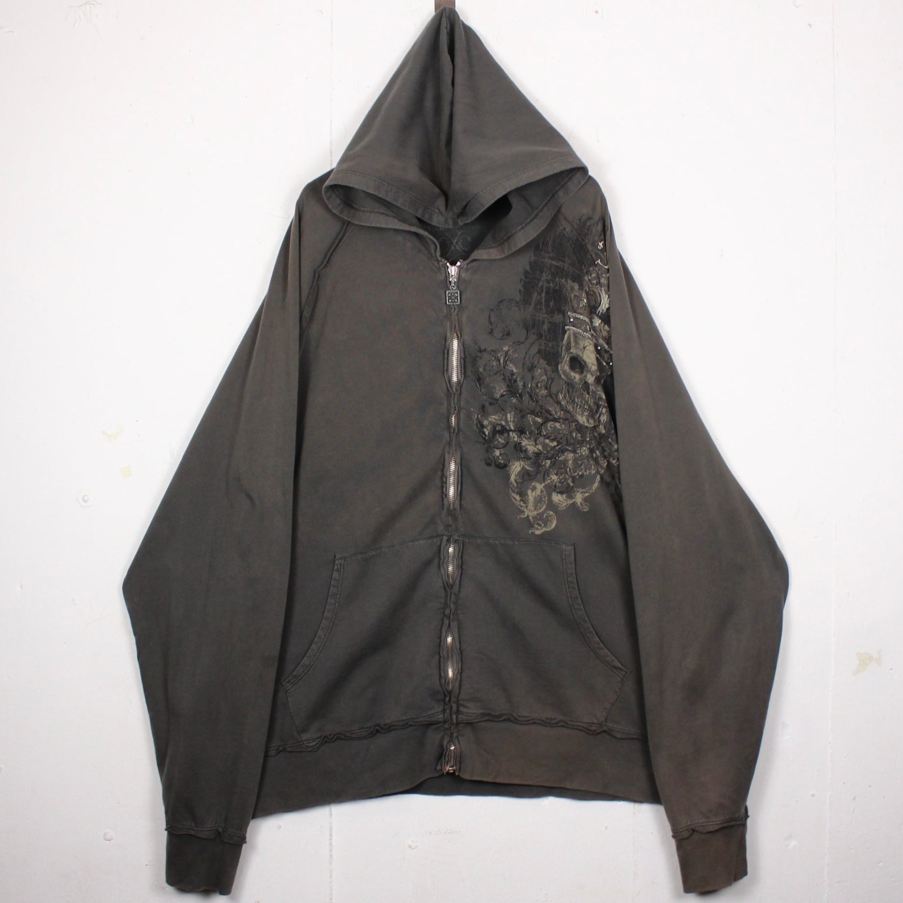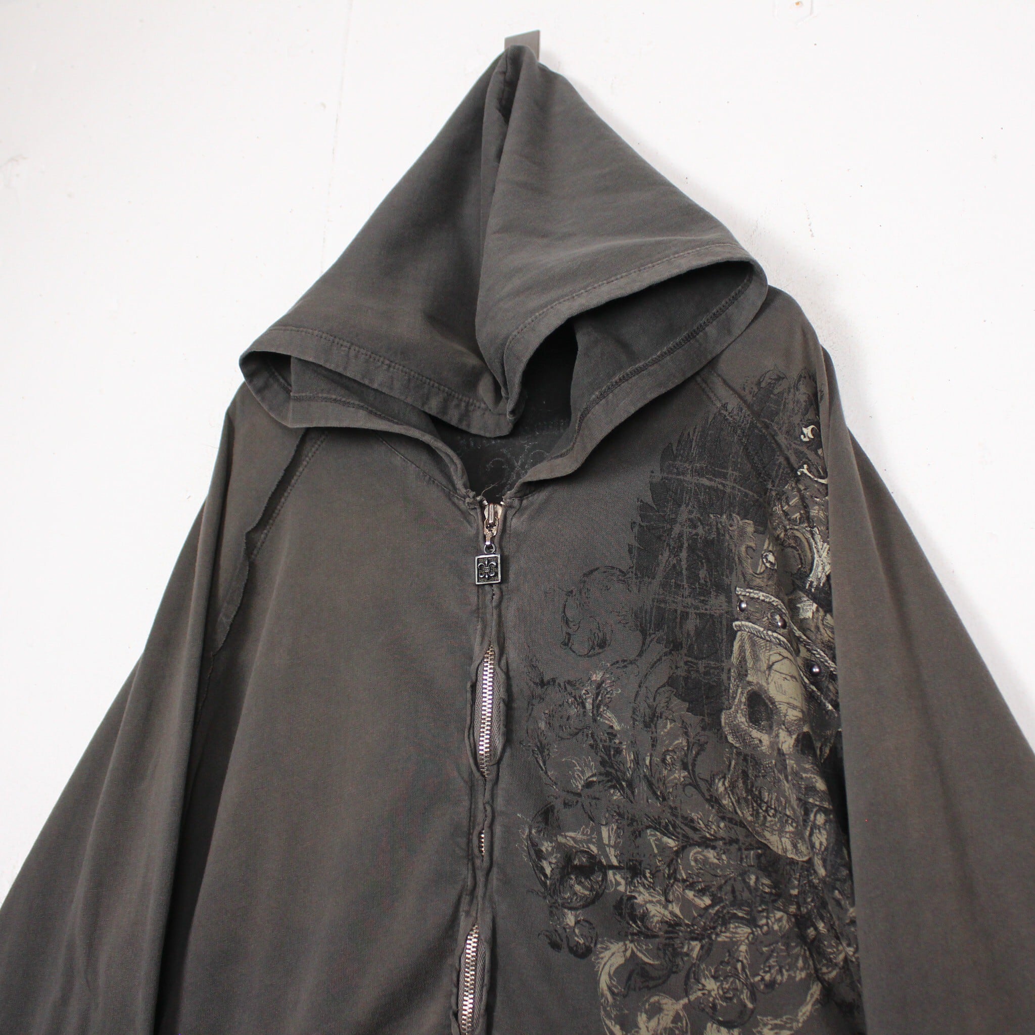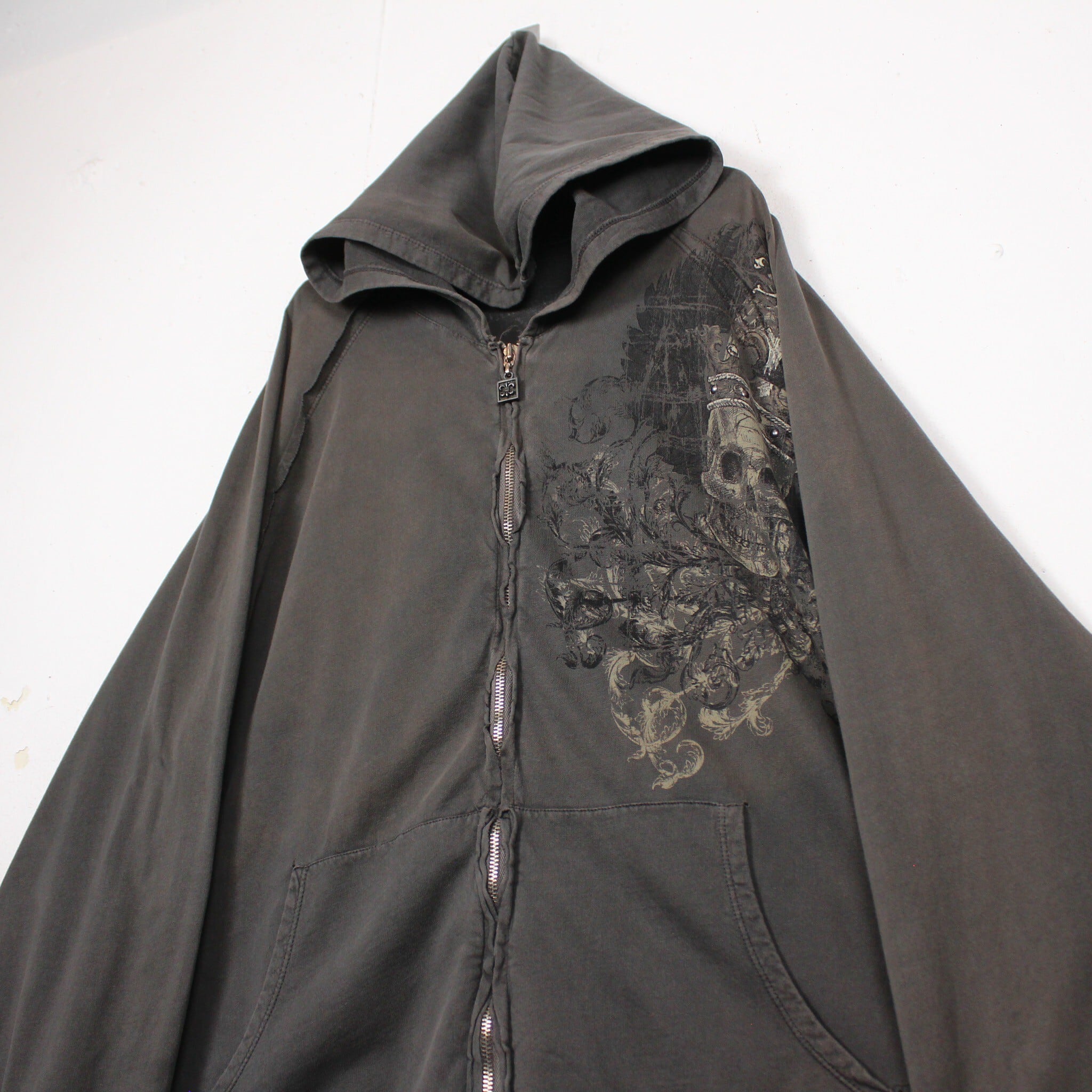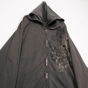 サラッとしたライトな質感で仕上げられたグレーカラーのボディに、スカル等を組み込んだゴシックなプリントデザインを載せたジップフーディ。