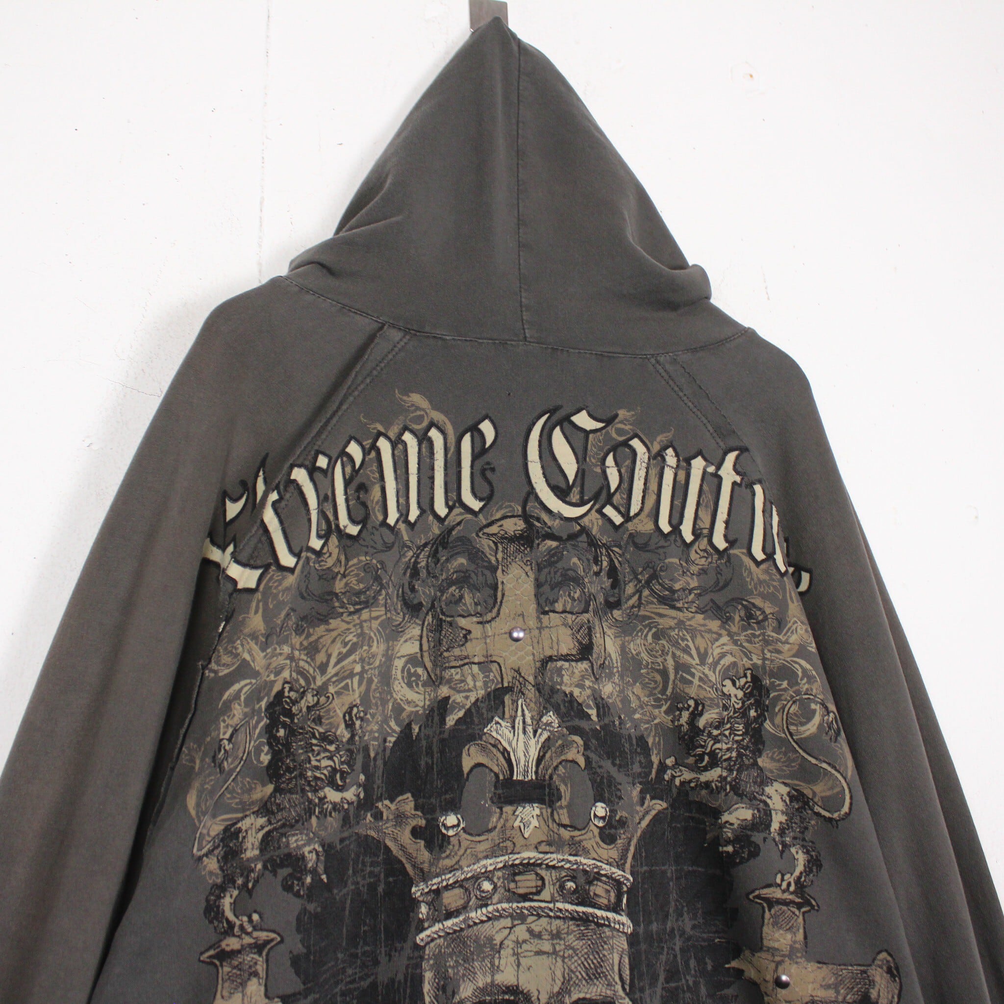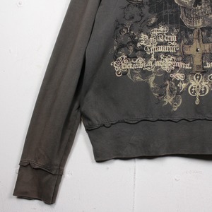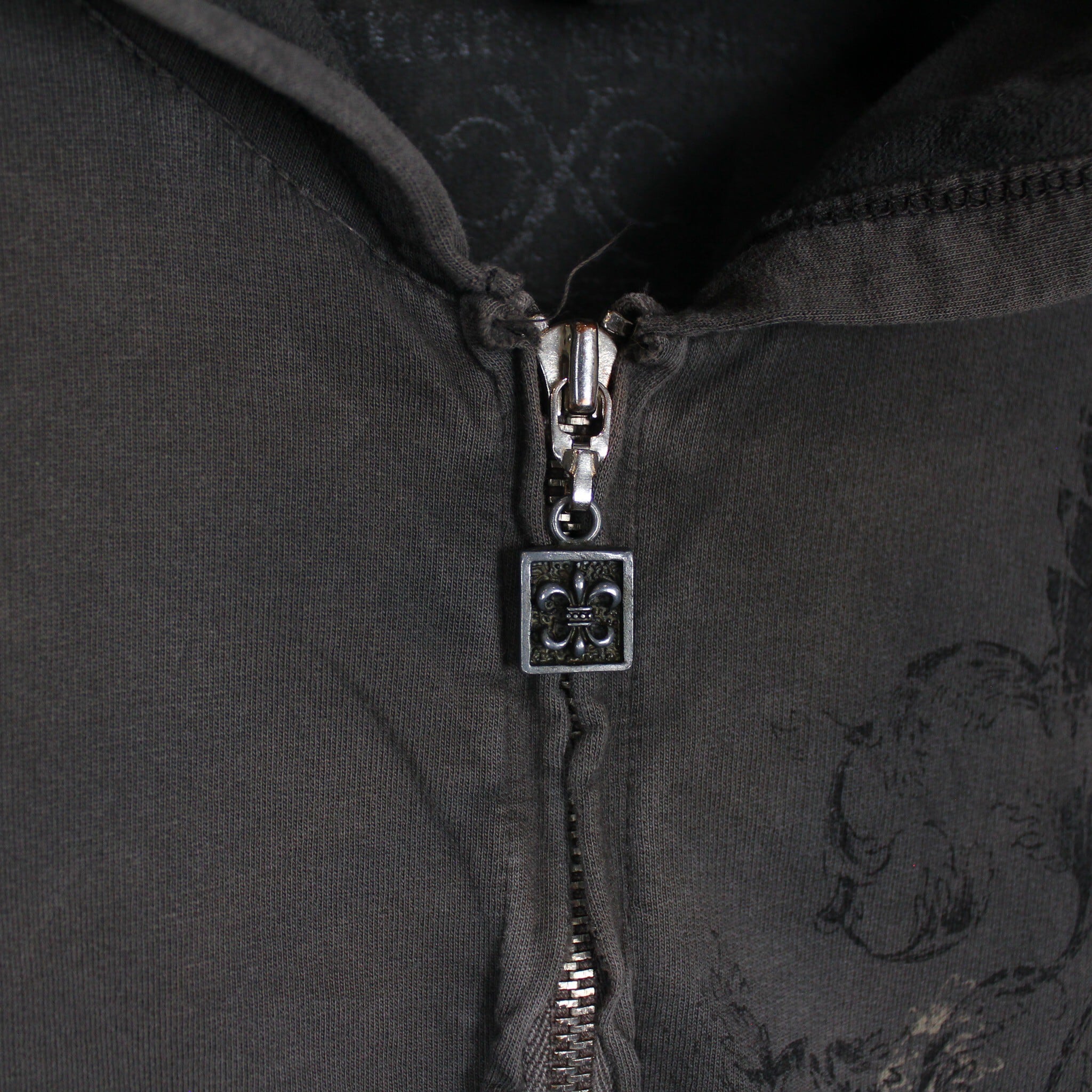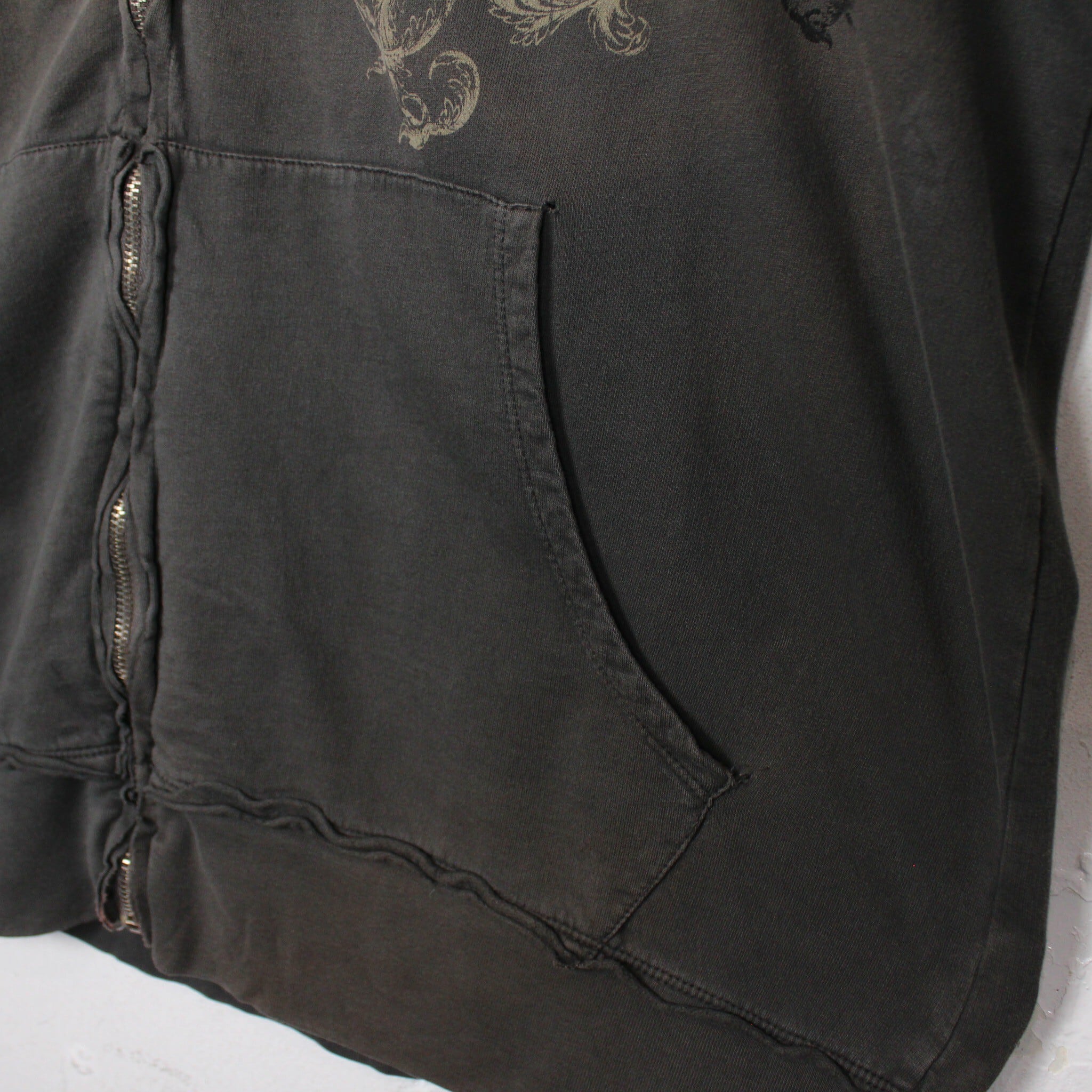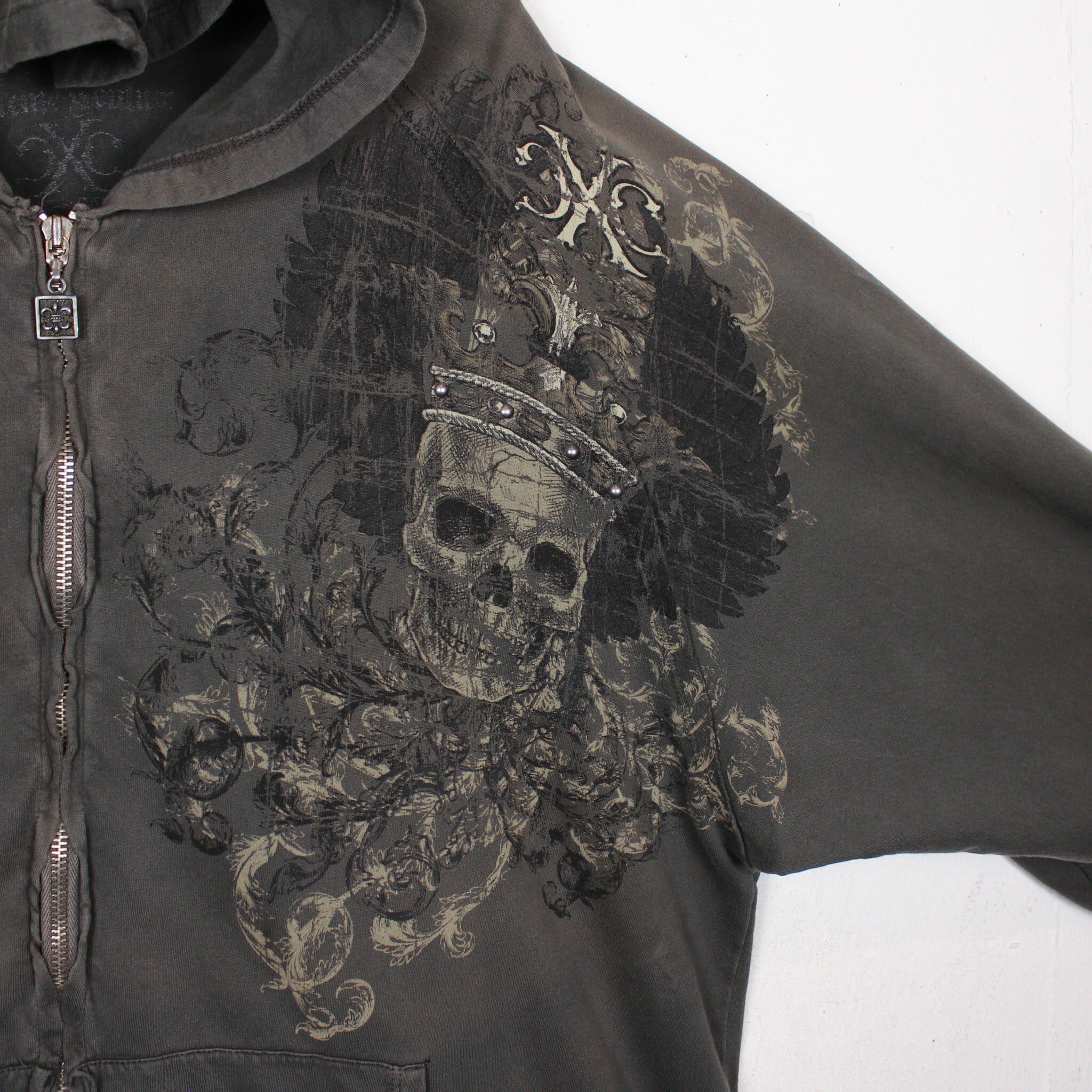 サラッとしたライトな質感で仕上げられたグレーカラーのボディに、スカル等を組み込んだゴシックなプリントデザインを載せたジップフーディ。
