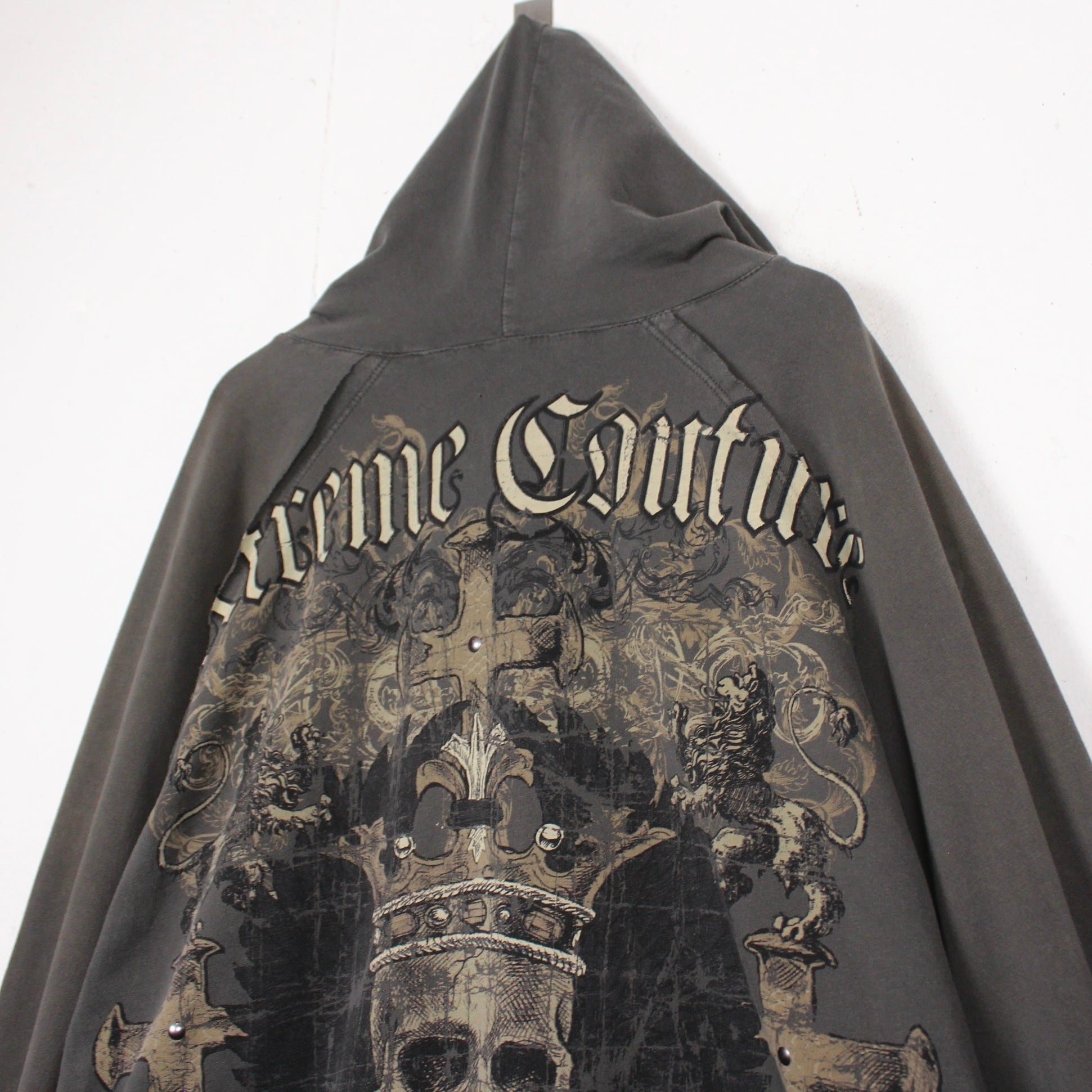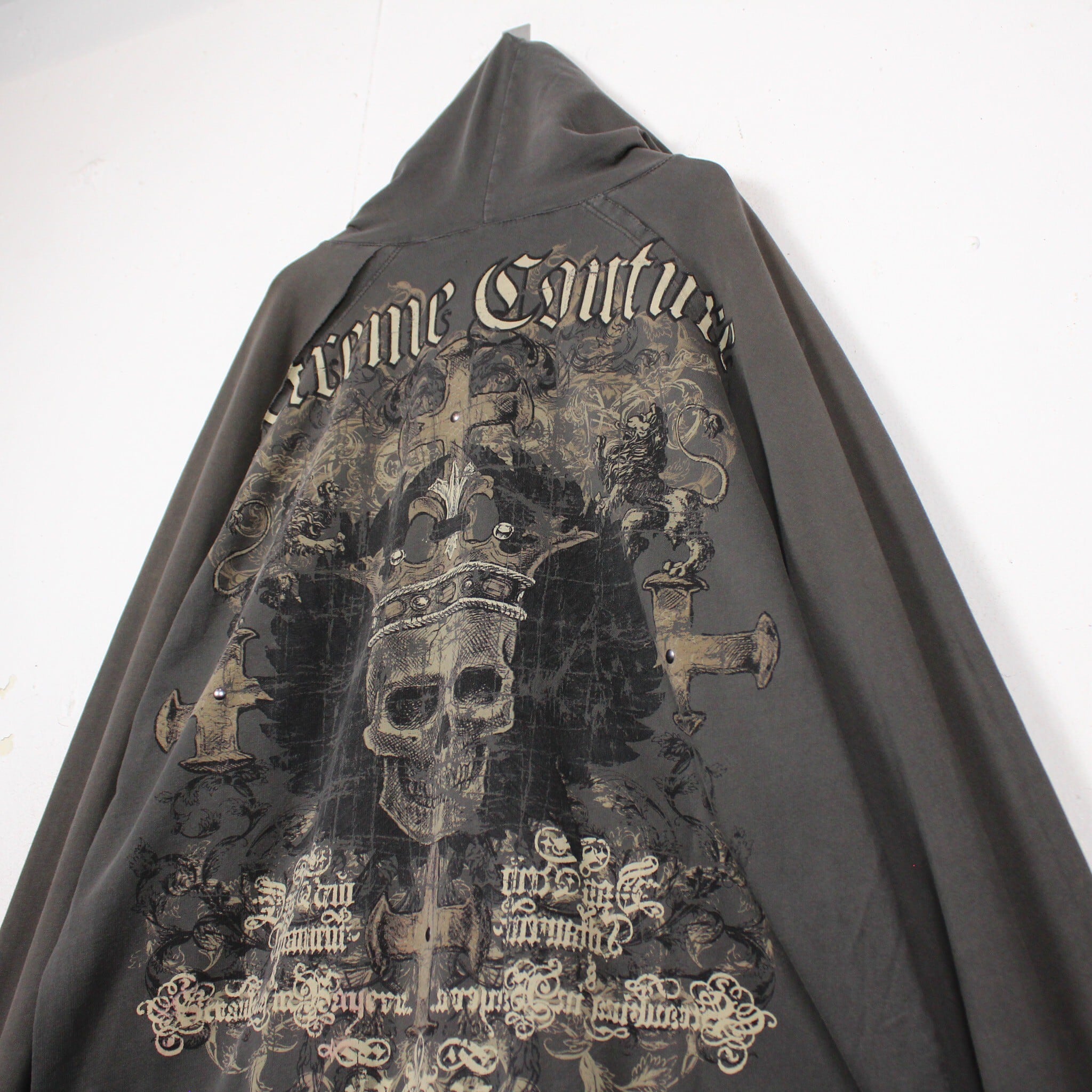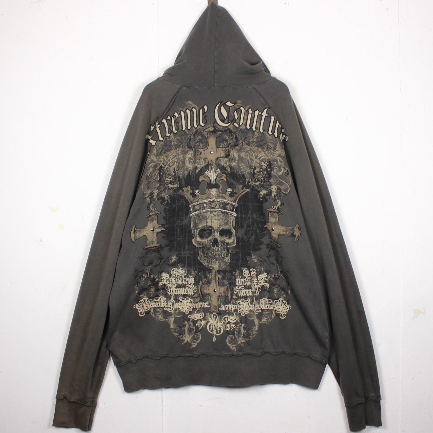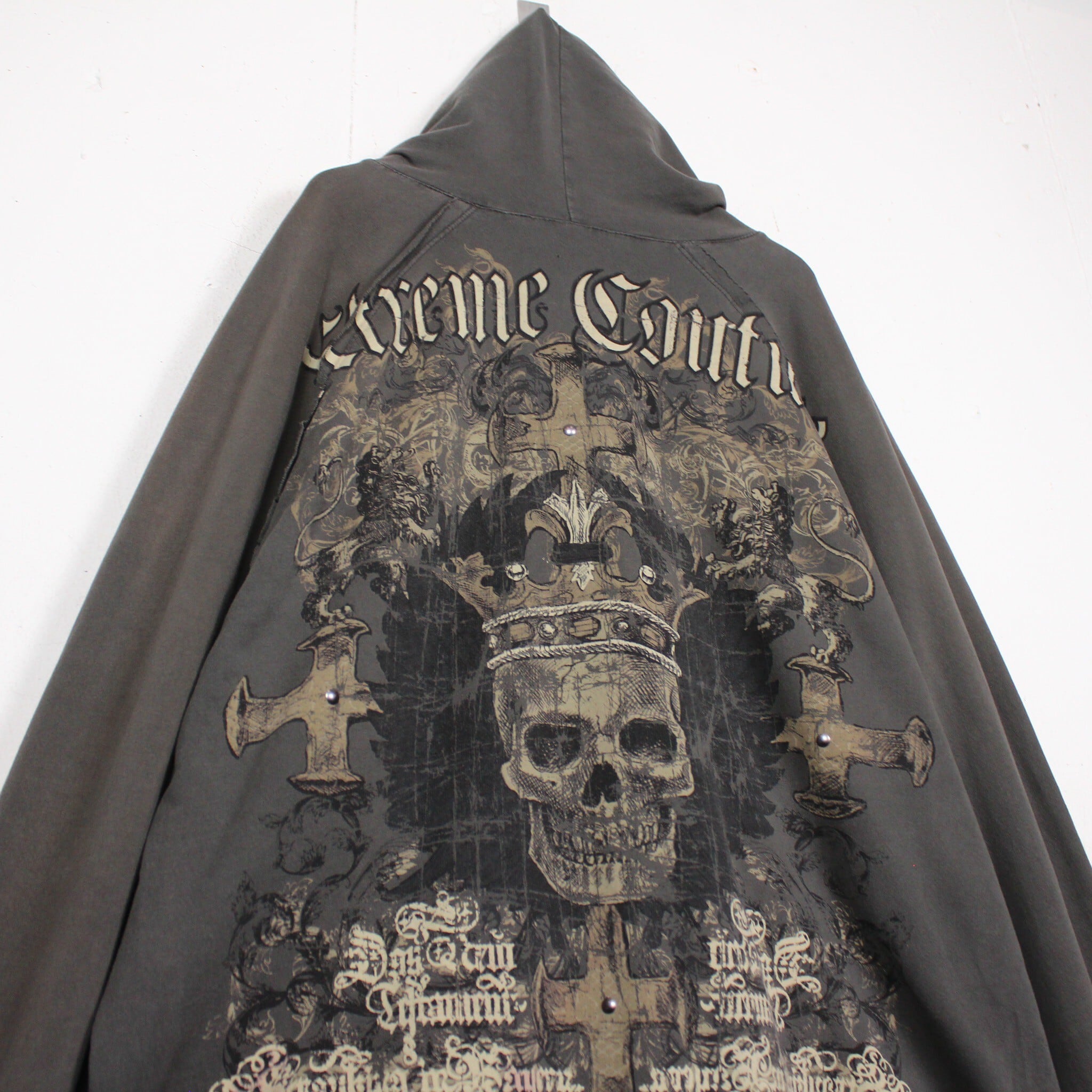 サラッとしたライトな質感で仕上げられたグレーカラーのボディに、スカル等を組み込んだゴシックなプリントデザインを載せたジップフーディ。
