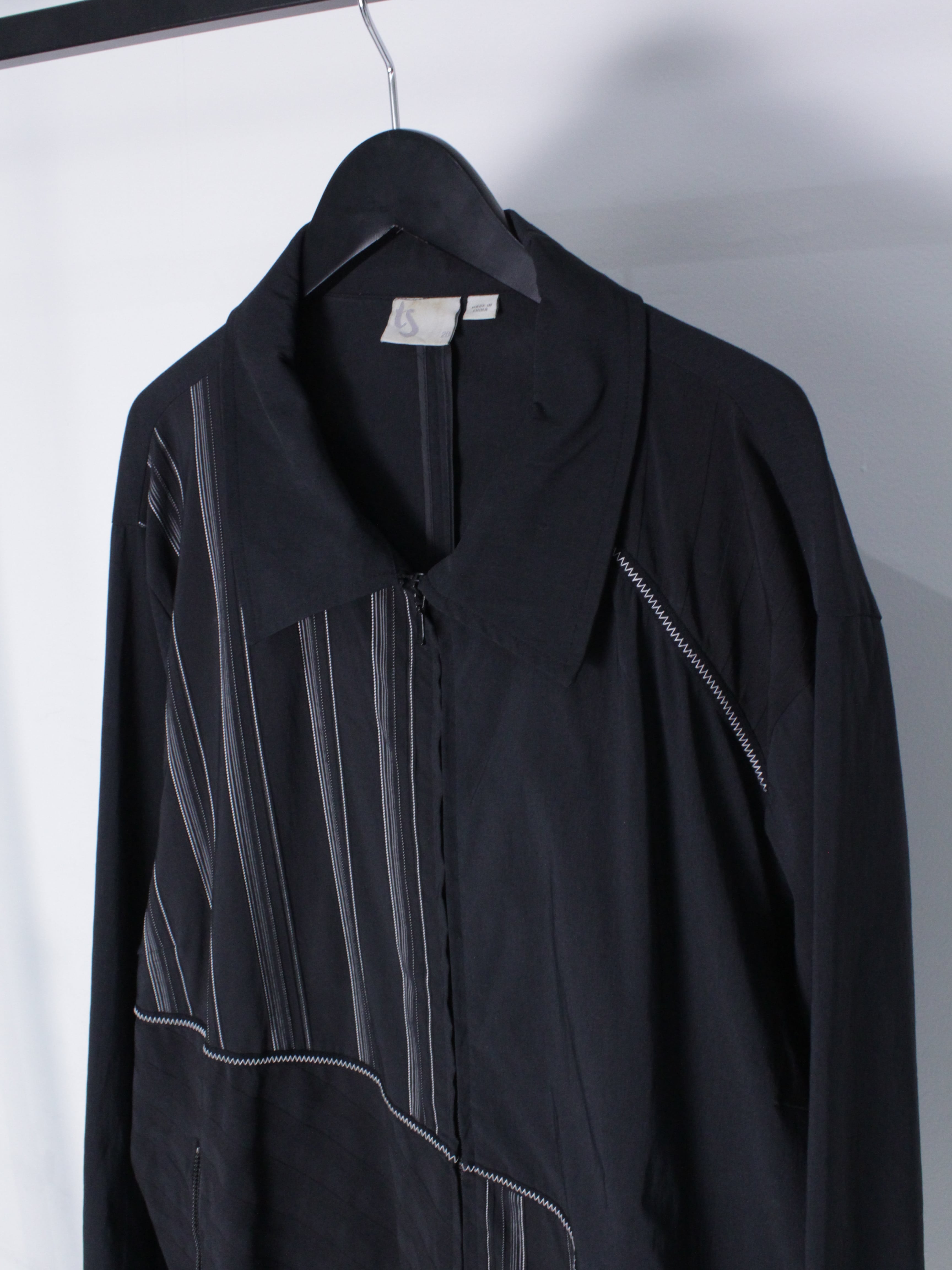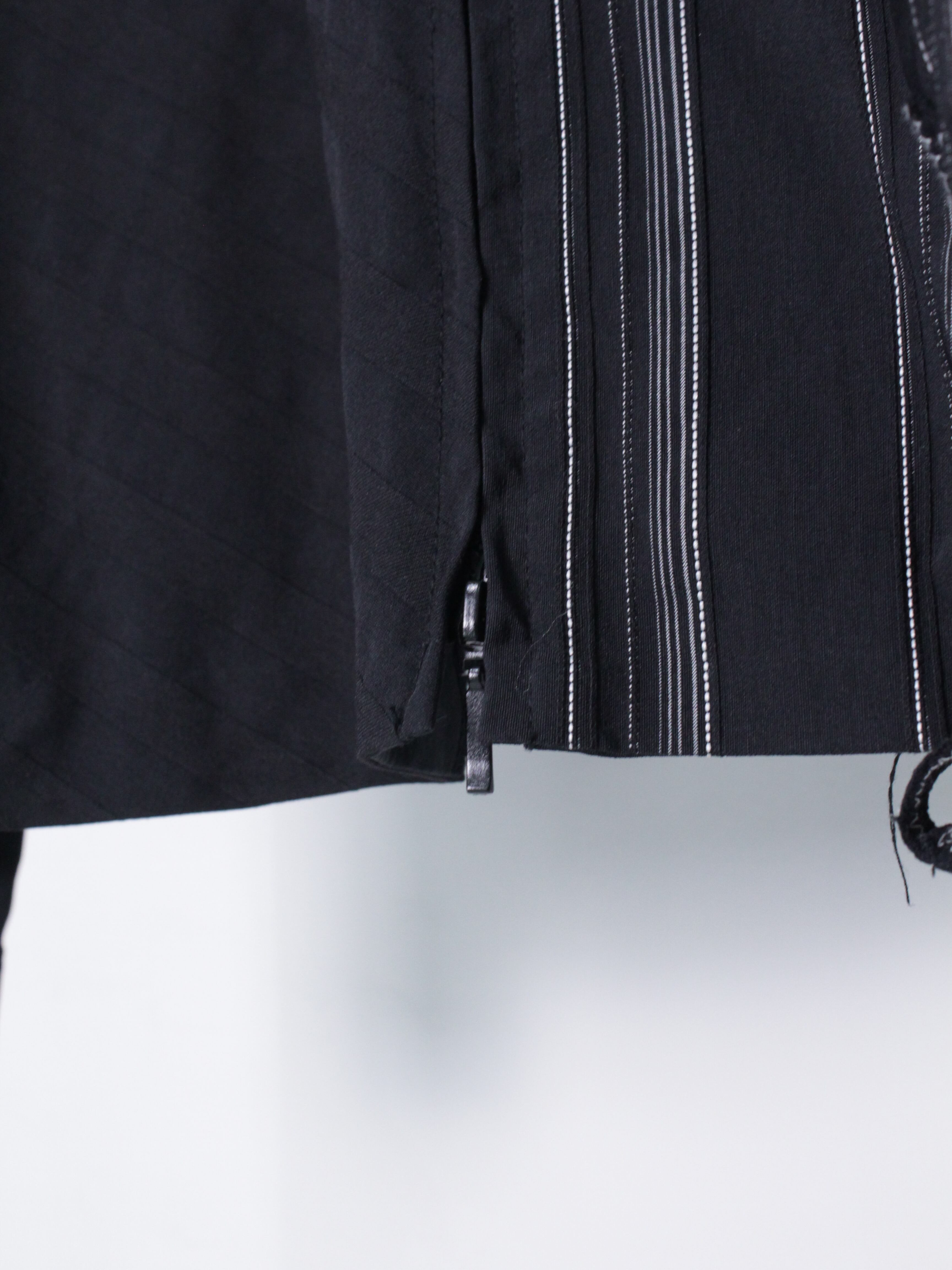ステッチ×テープによるラインを走らせ、ストライプ柄の切り替えをアシンメトリーに施したシャツジャケット。