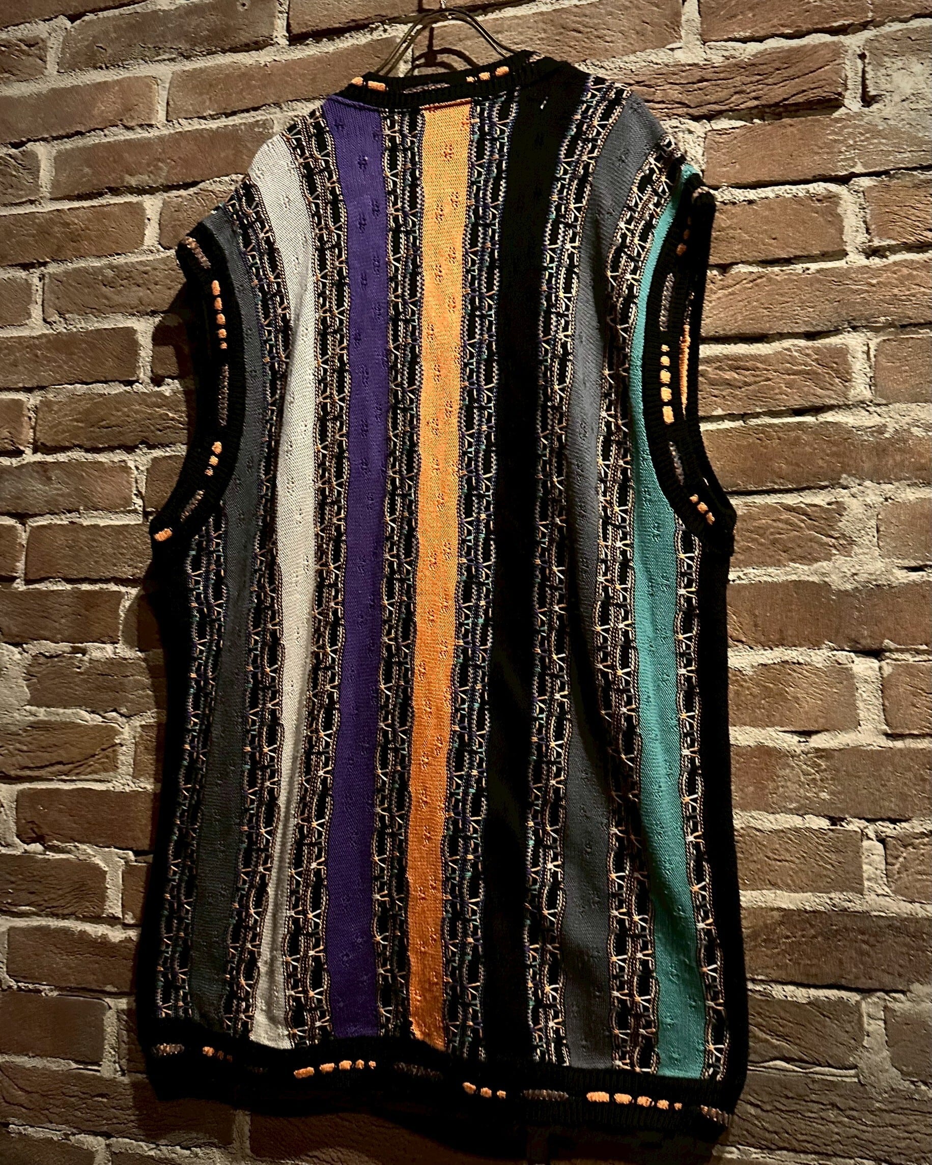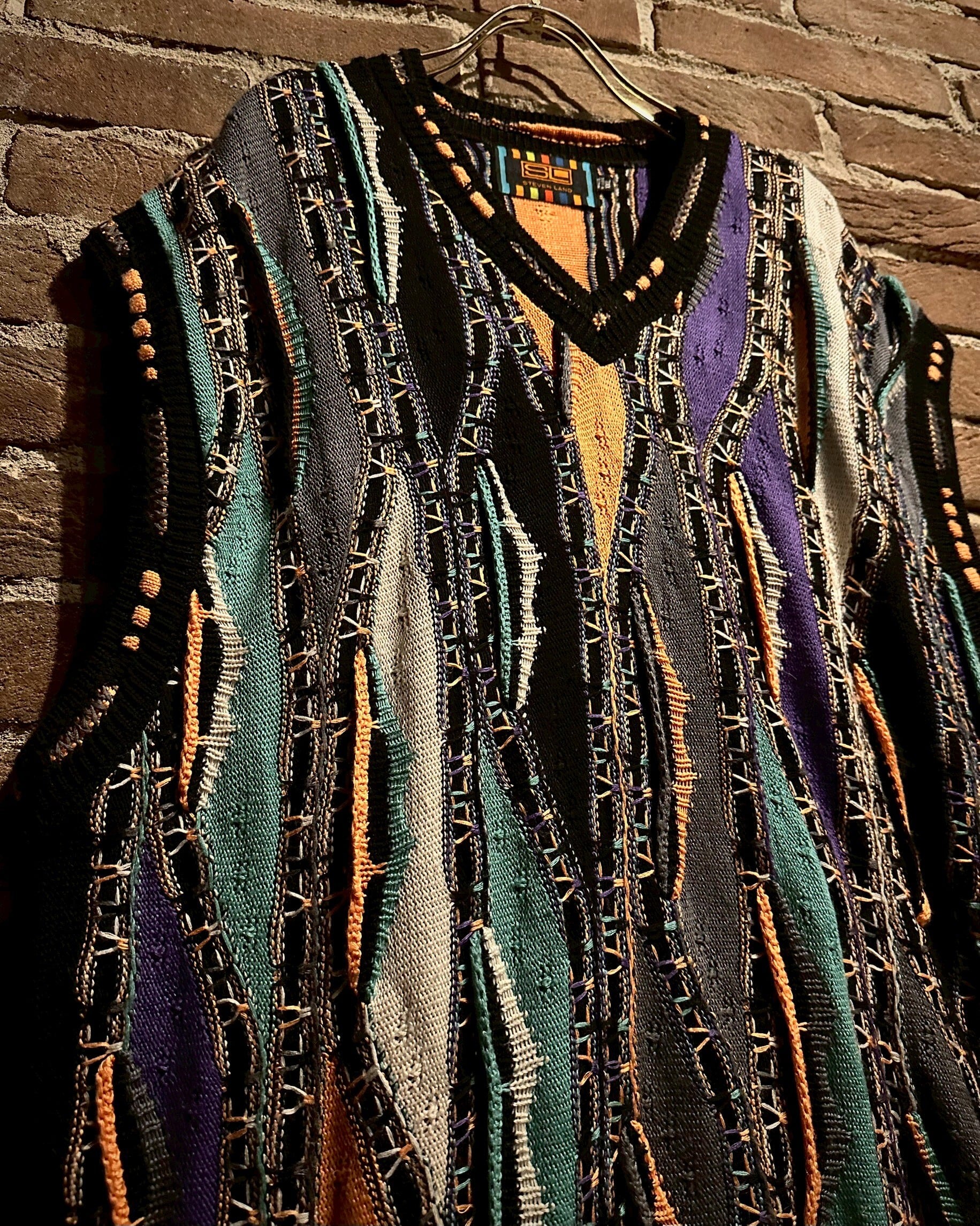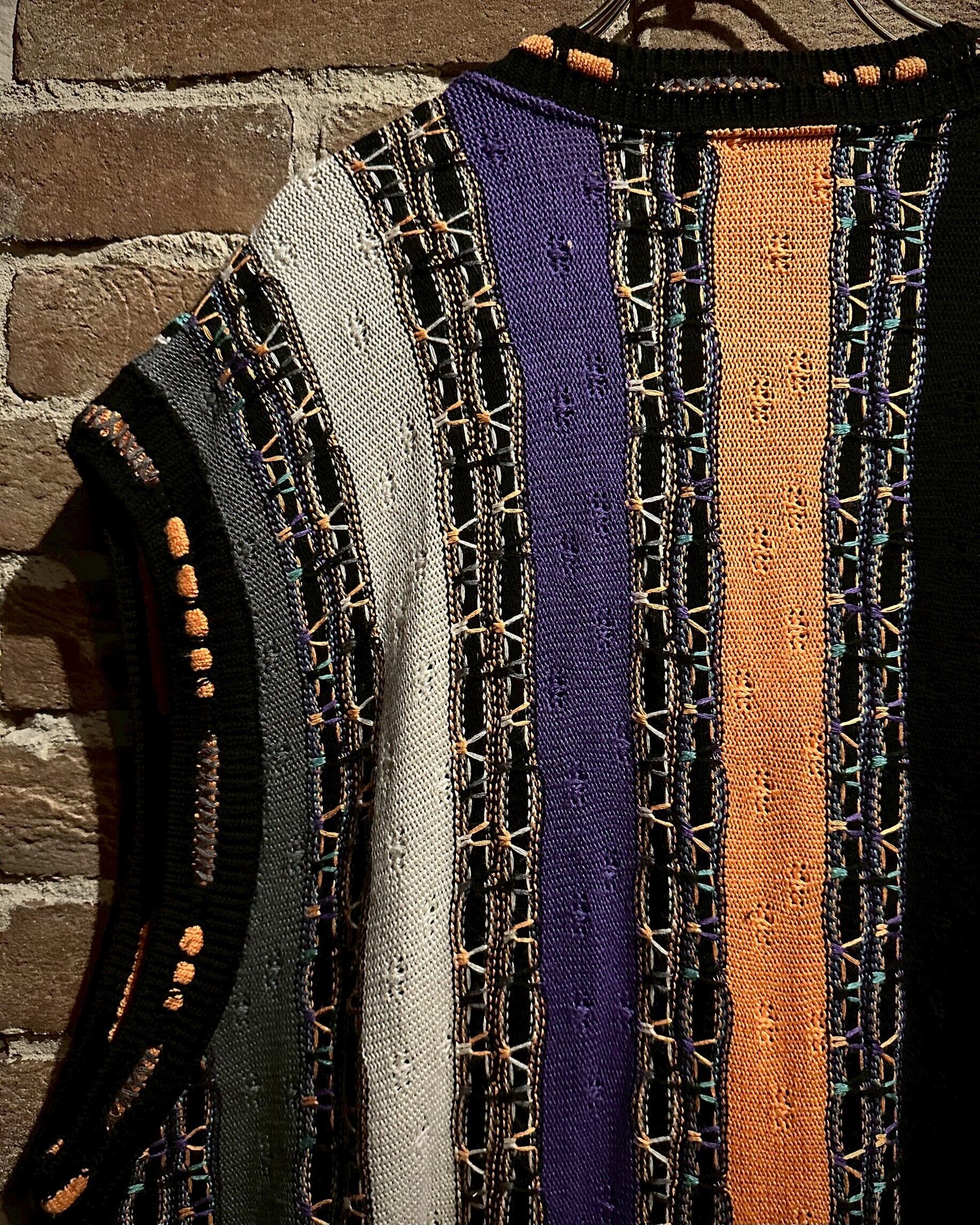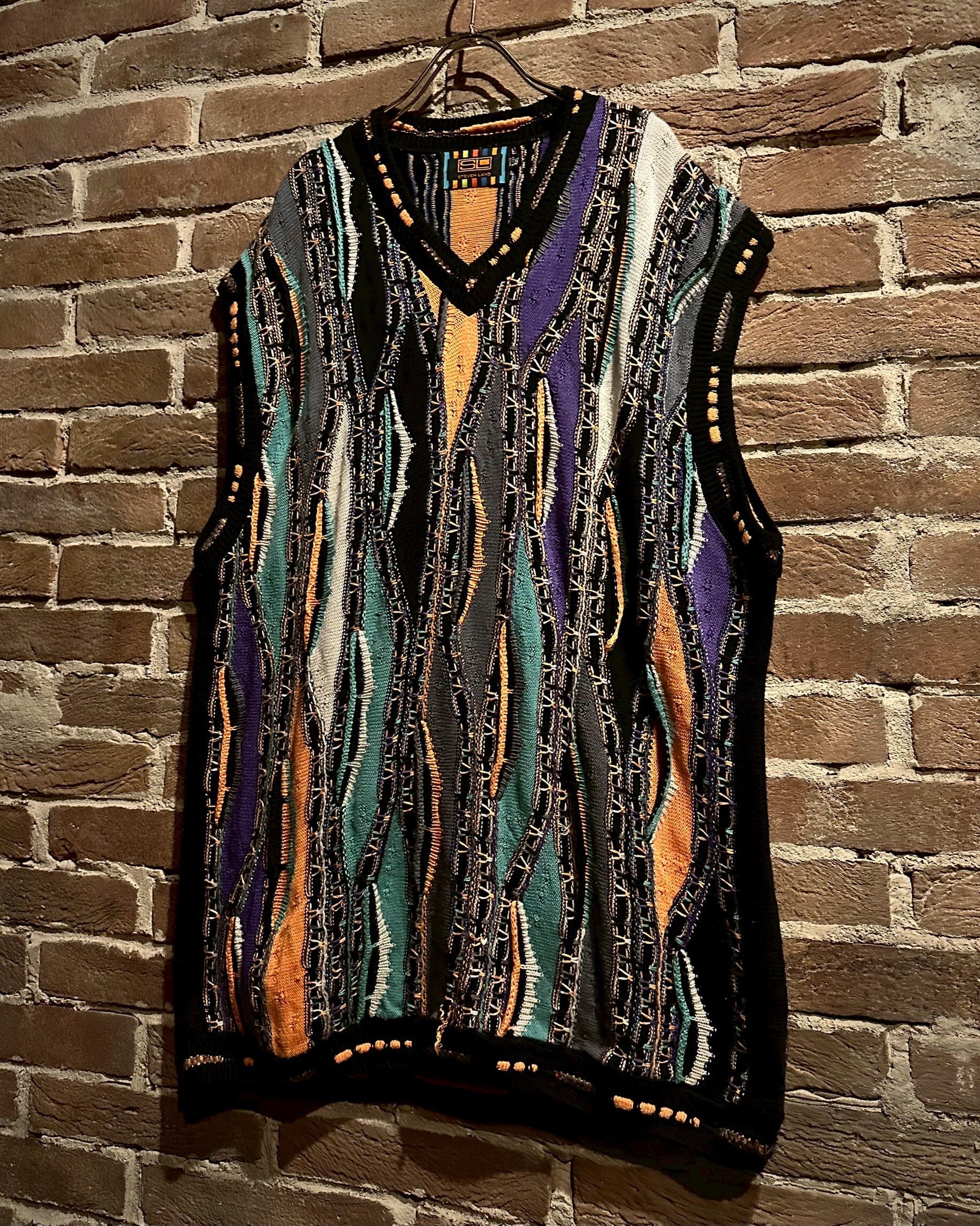 昨今高騰化が著しい、Cakaグループの代名詞の一つでもある3Dニットより、サイケデリックな配色バランスが素晴らしいニットベストをご紹介致します。