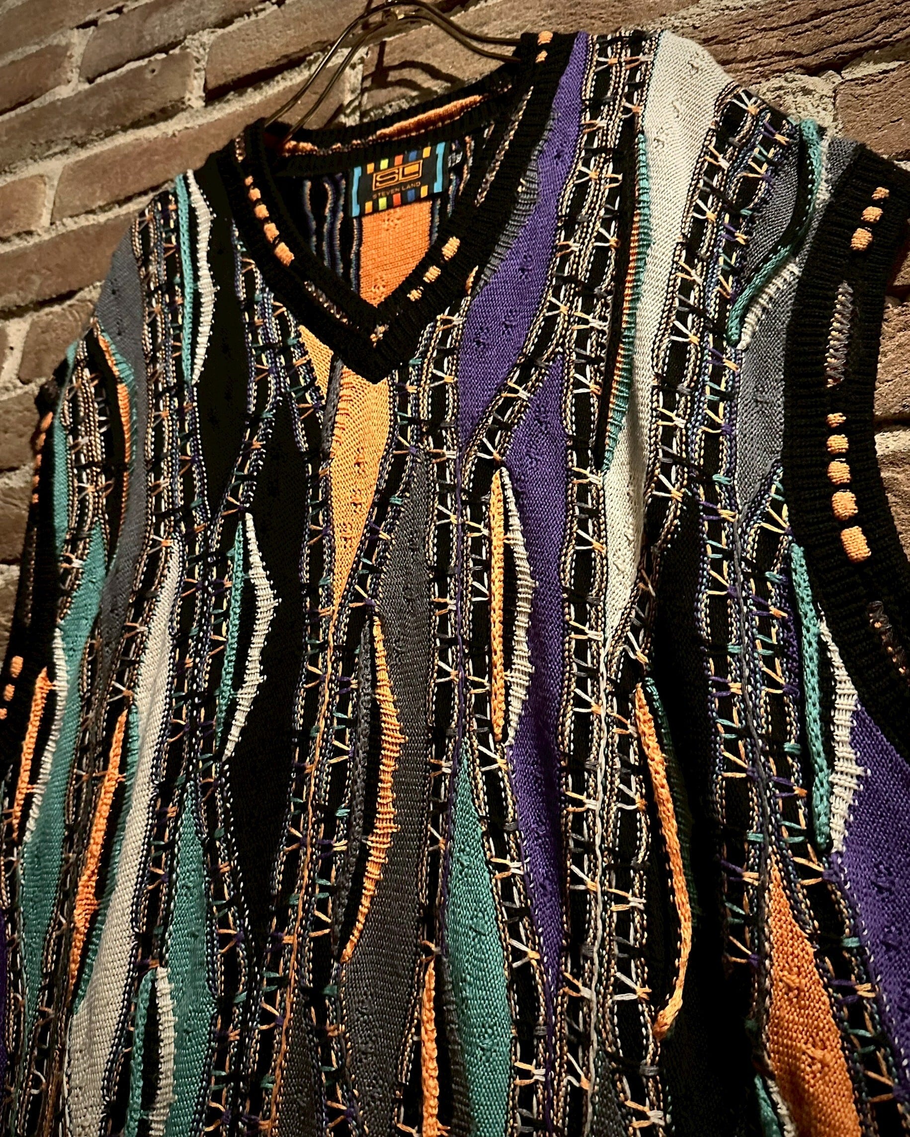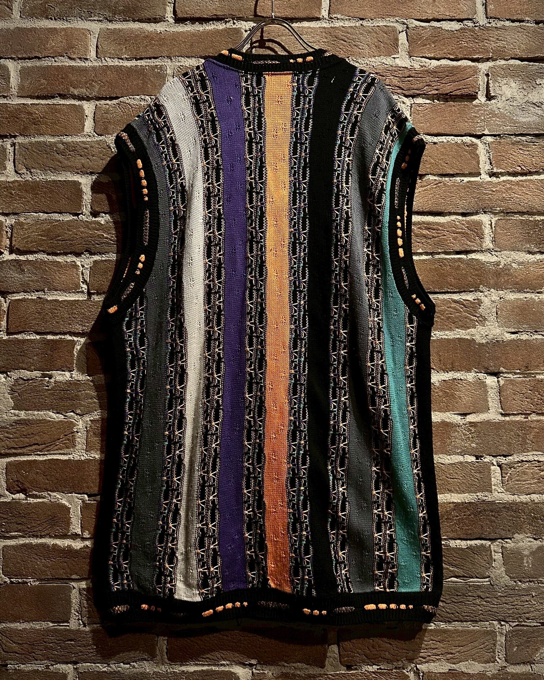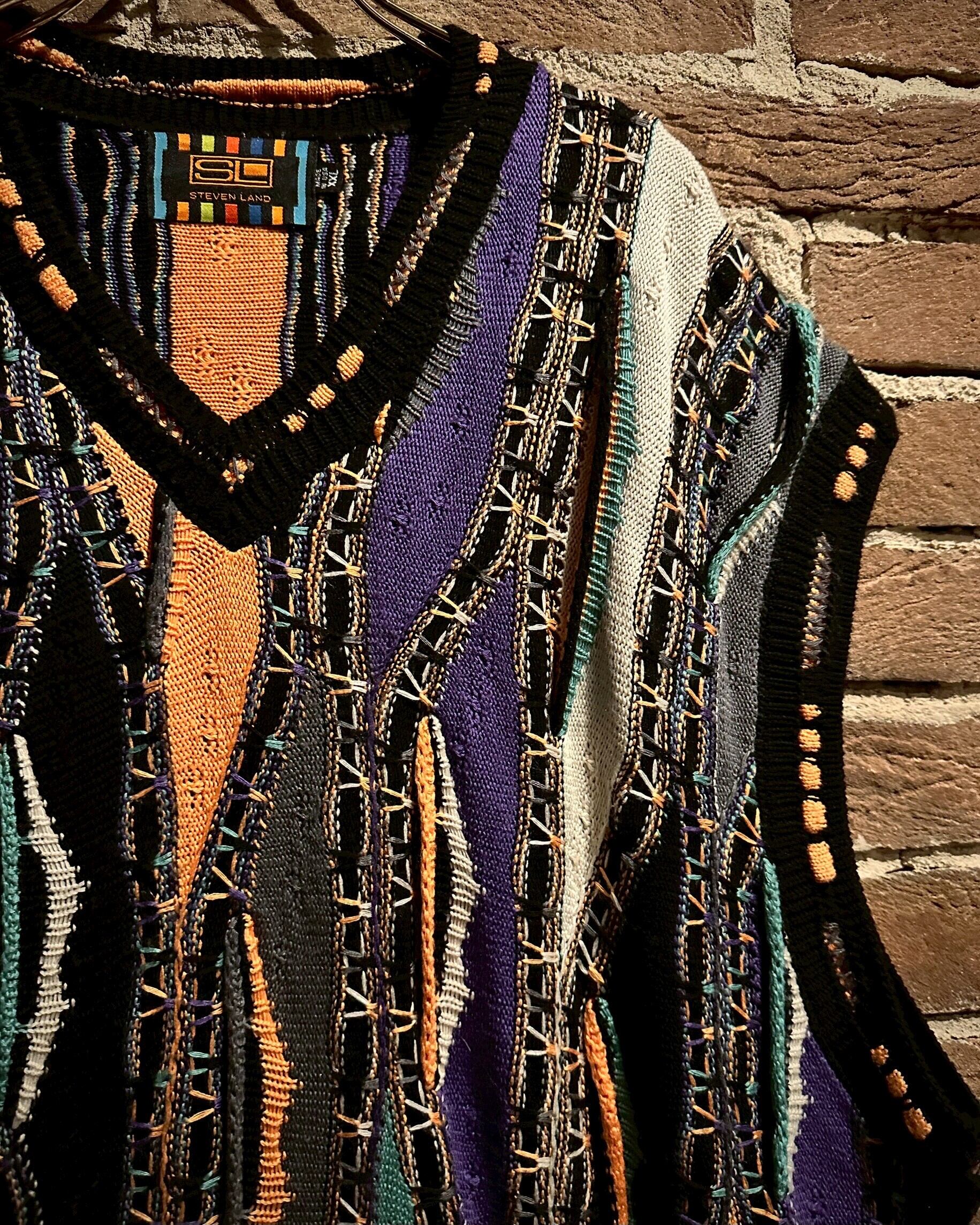 昨今高騰化が著しい、Cakaグループの代名詞の一つでもある3Dニットより、サイケデリックな配色バランスが素晴らしいニットベストをご紹介致します。