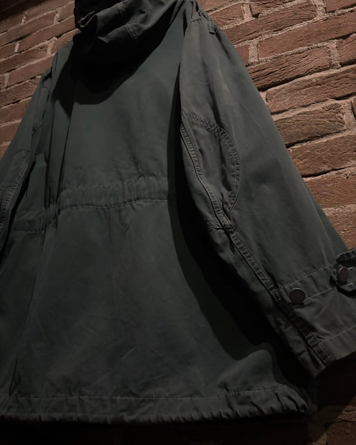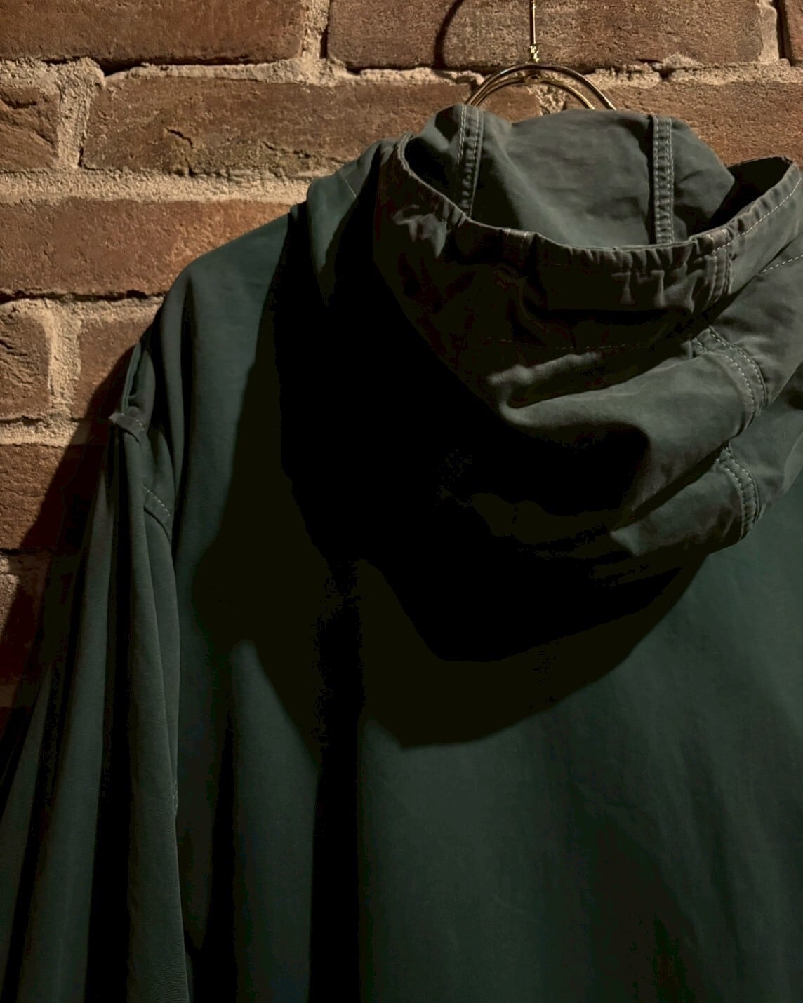 薄手のグリーンのコットン素材をベースに、前立て部分にはファイアーマンバックルを載せたフーディジャケット。