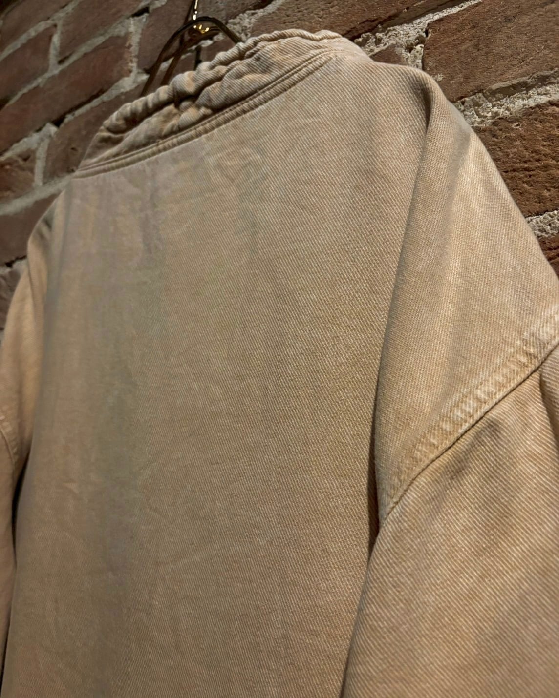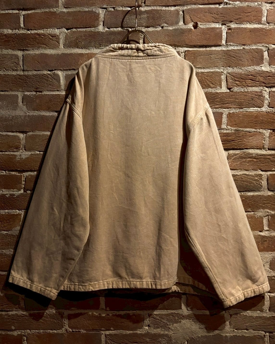 ガシッとしたベージュのコットン素材をベースに採用したハーフボタン仕様のプルオーバー。