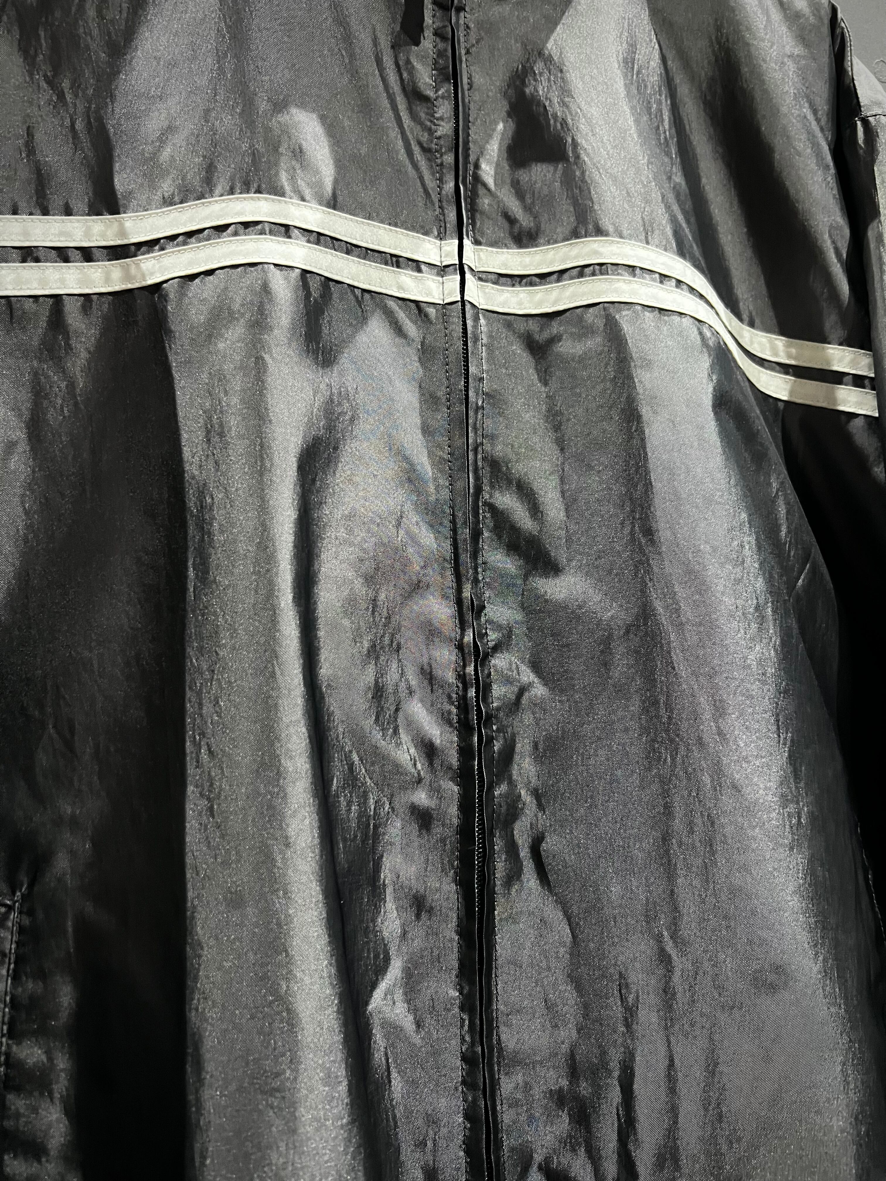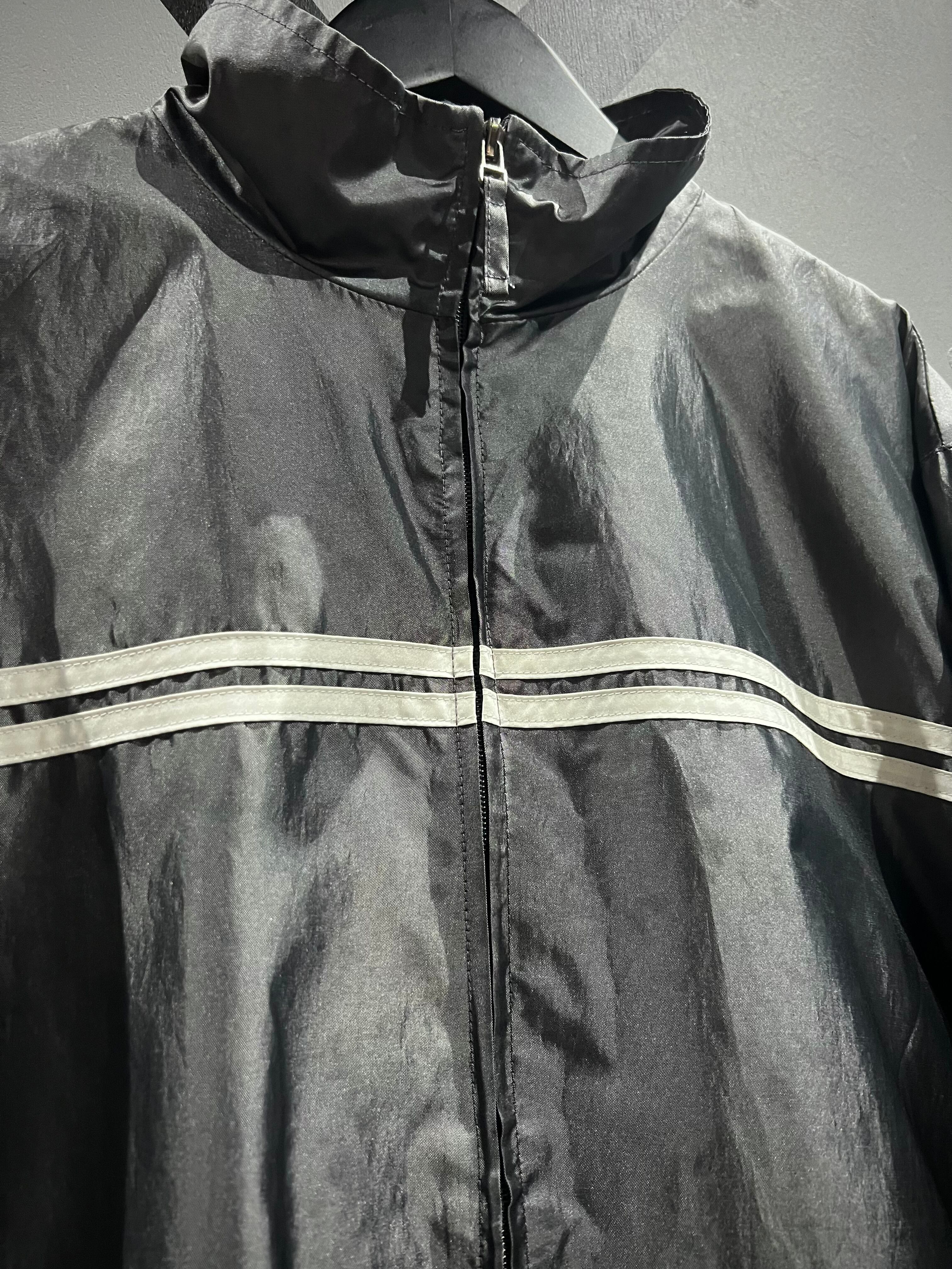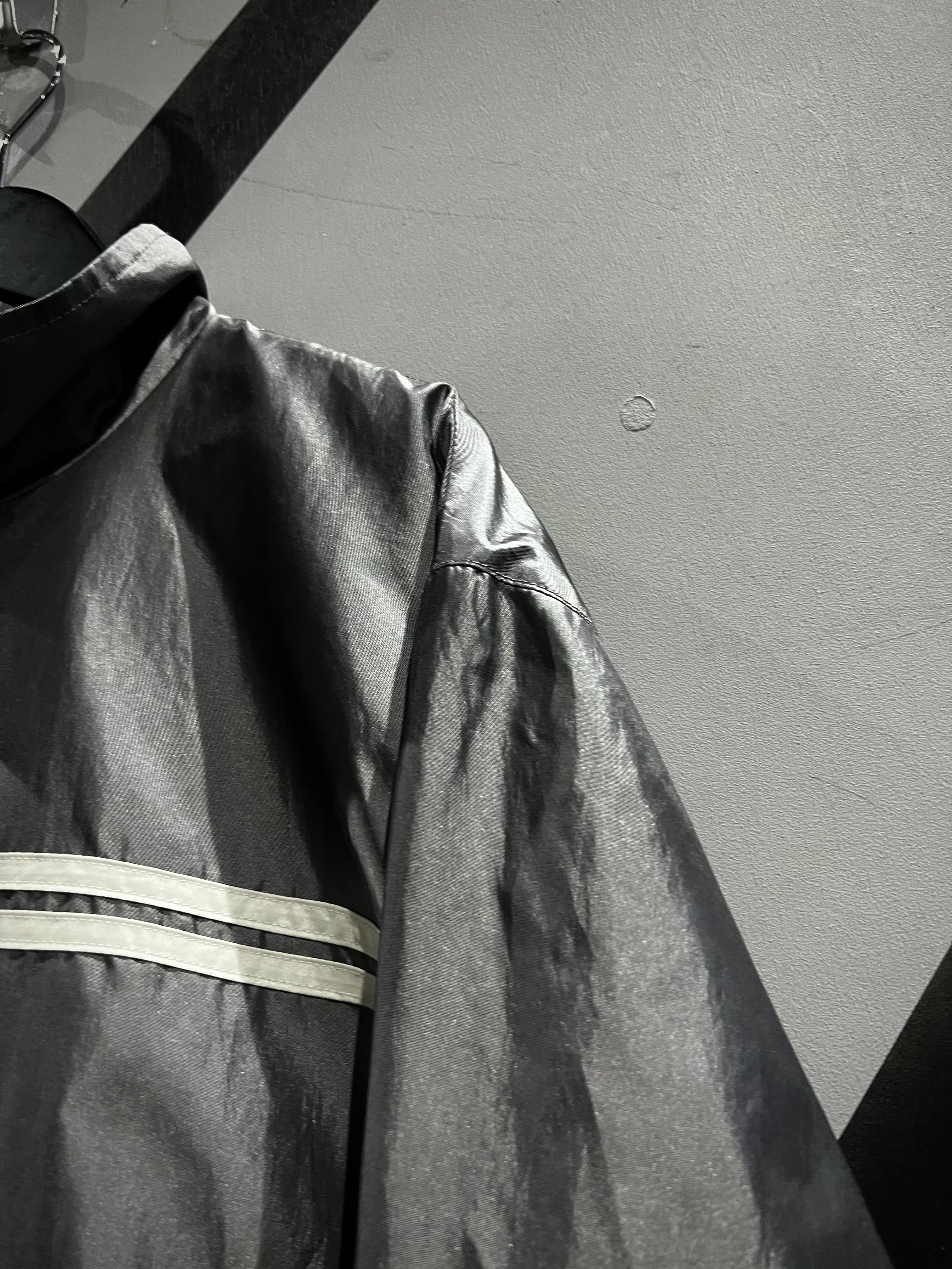 鈍い光沢を放つメタリックなグレーのボディに、2本のラインを載せたジップアップナイロンジャケット。