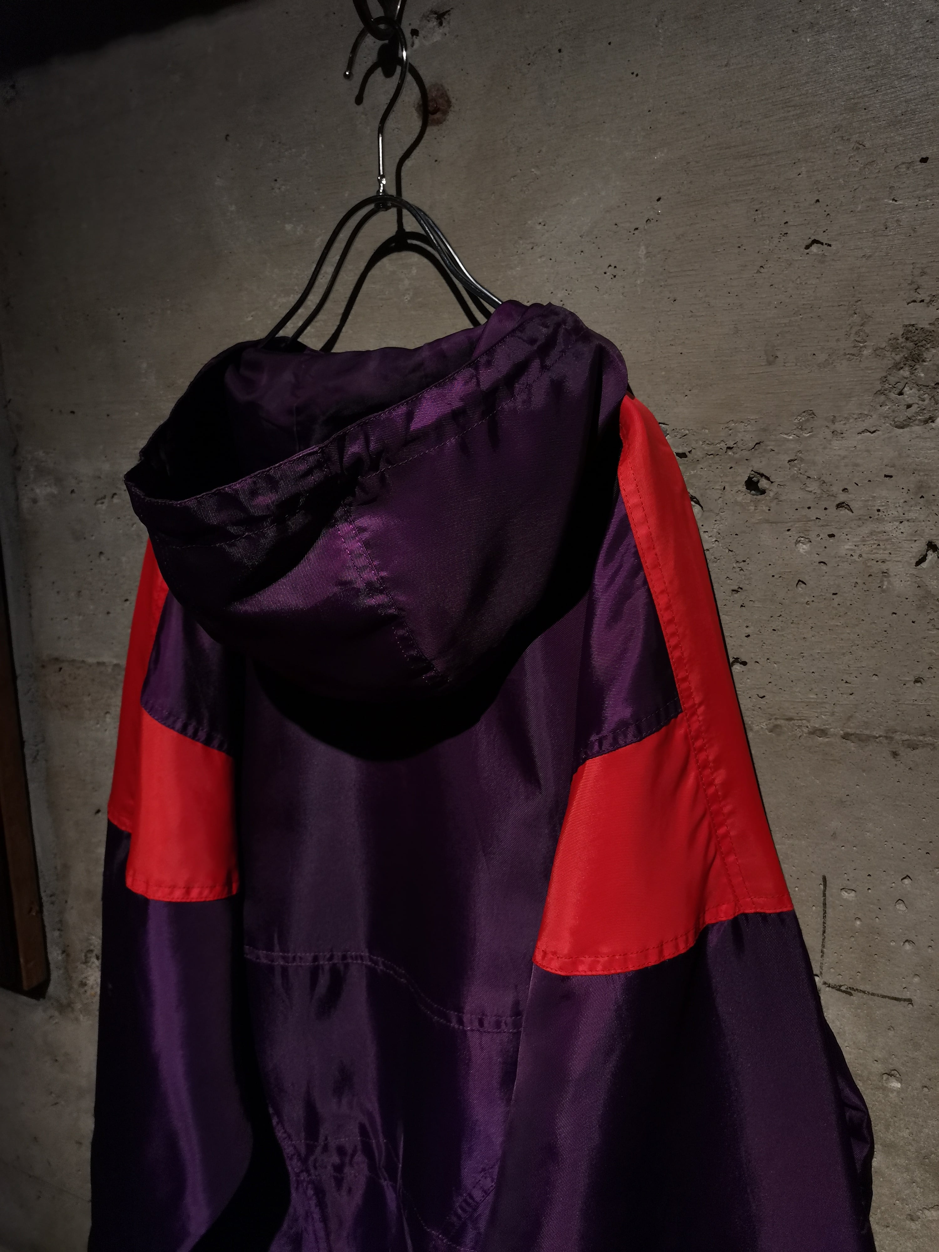 ビビットな紫のボティに赤色を切り替え、このブランドらしい蜘蛛の巣のデザインを載せたアノラックパーカー。