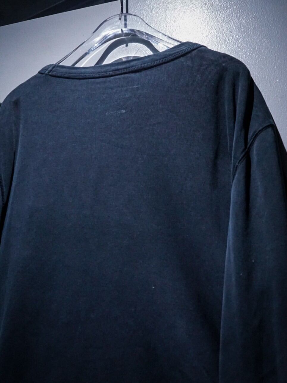 フェードブラックのボディの左肩に、レタリング風のプリントを載せたロンT。