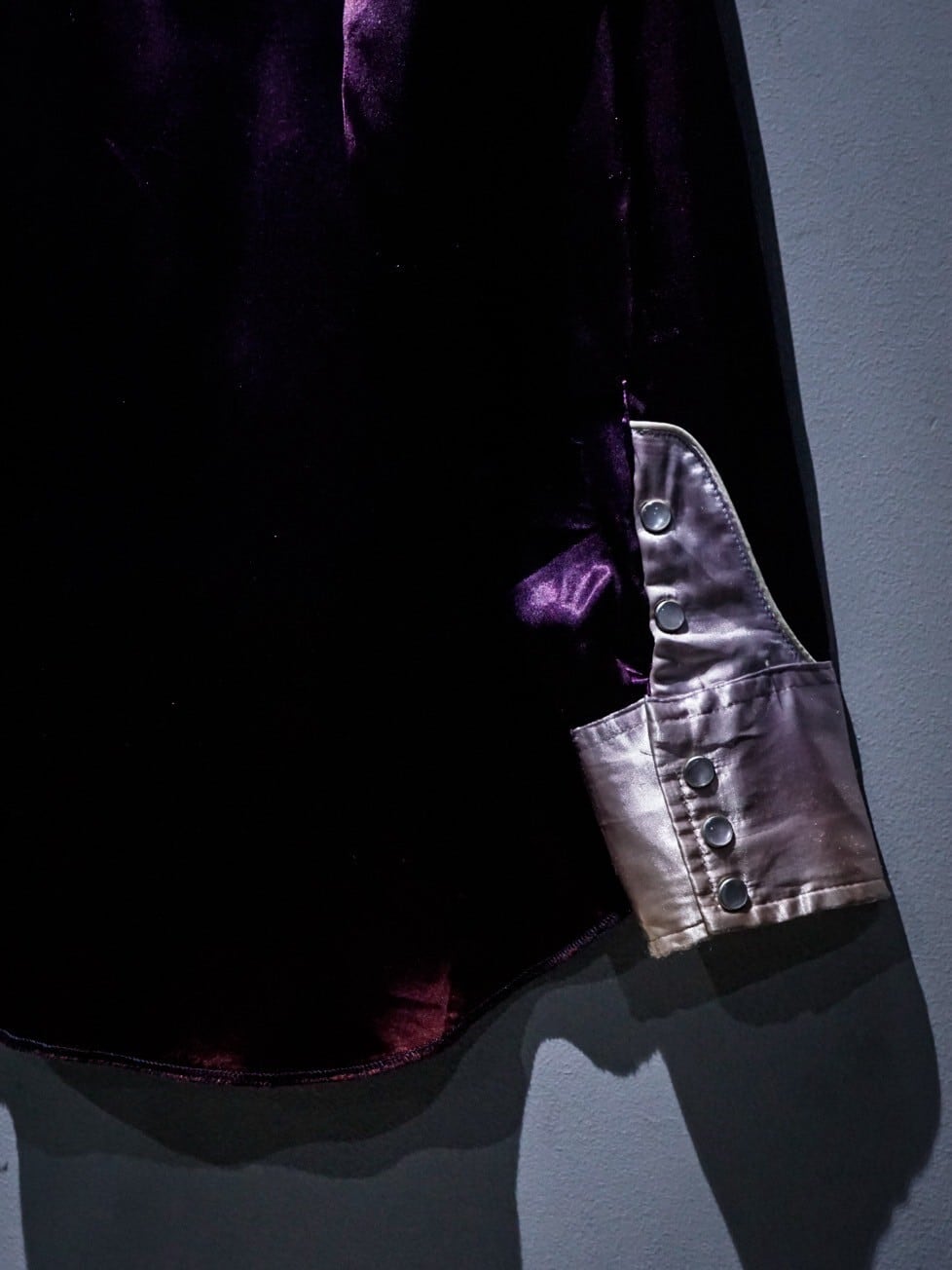 フロントヨークと襟に編み込まれた紐、そしてチェーンステッチでデザインを施しており、立体感のある仕上がりに。紫ベースのボディに色鮮やかな糸がよく映えています。