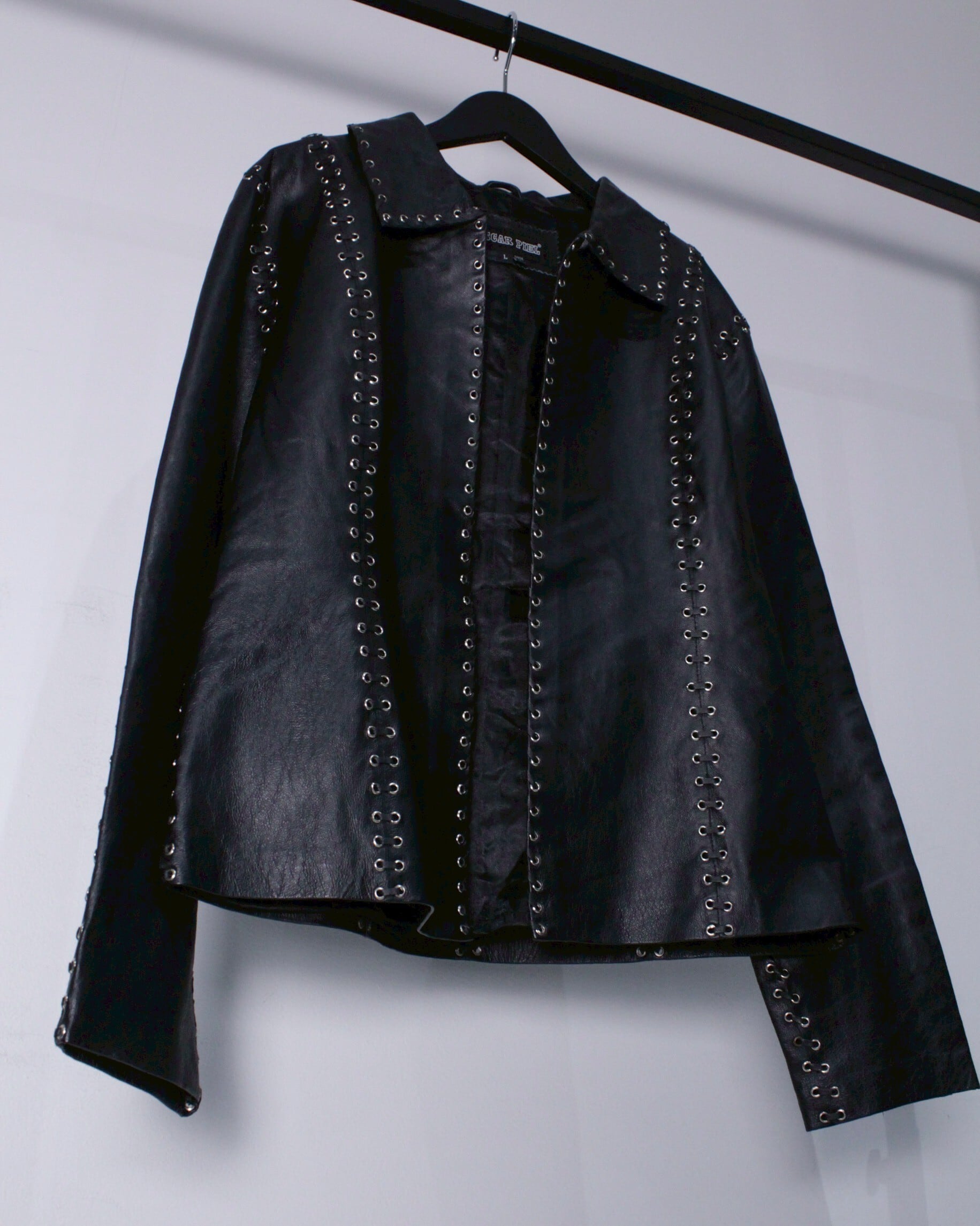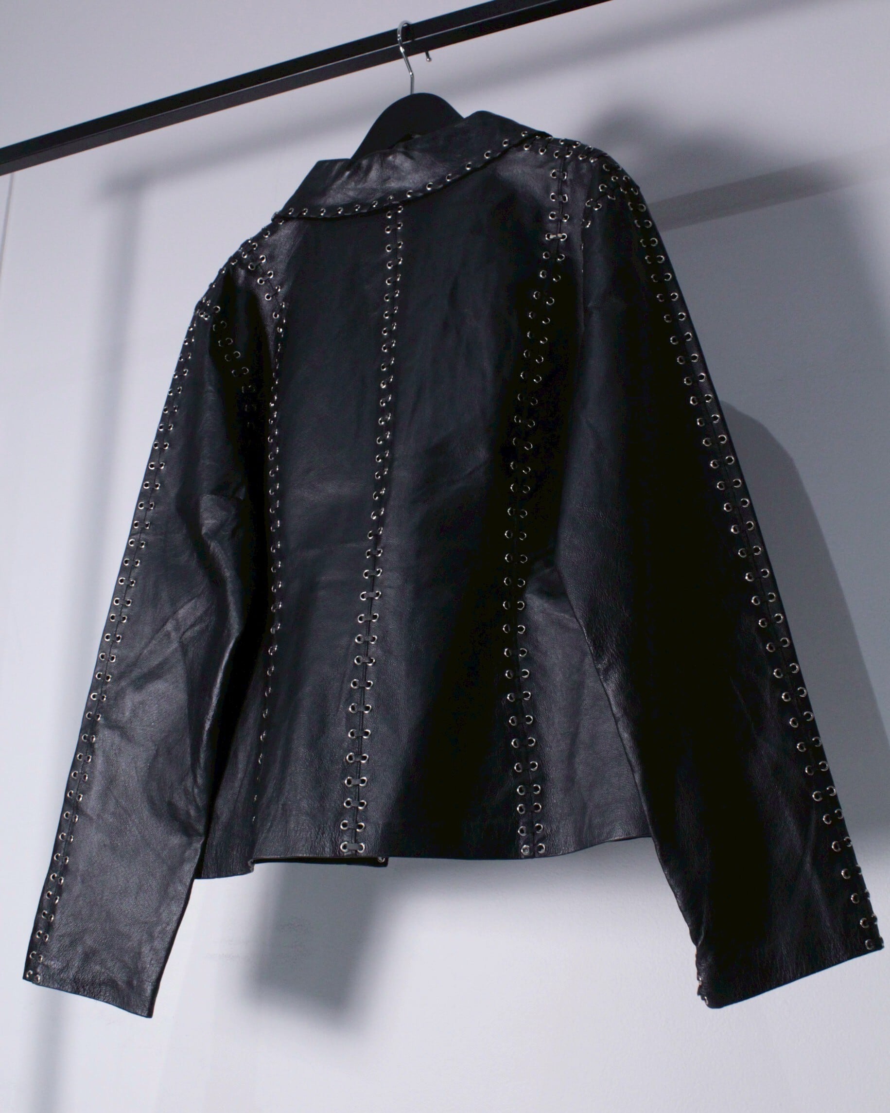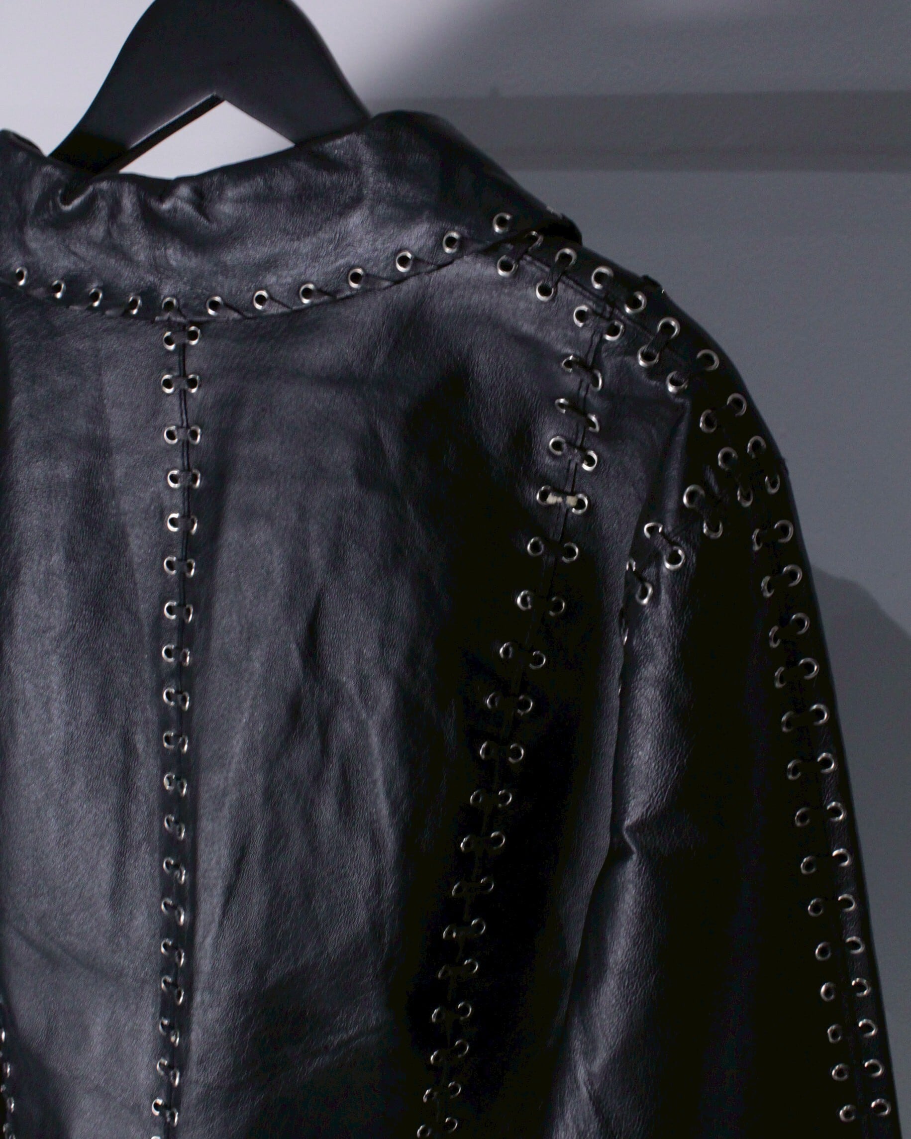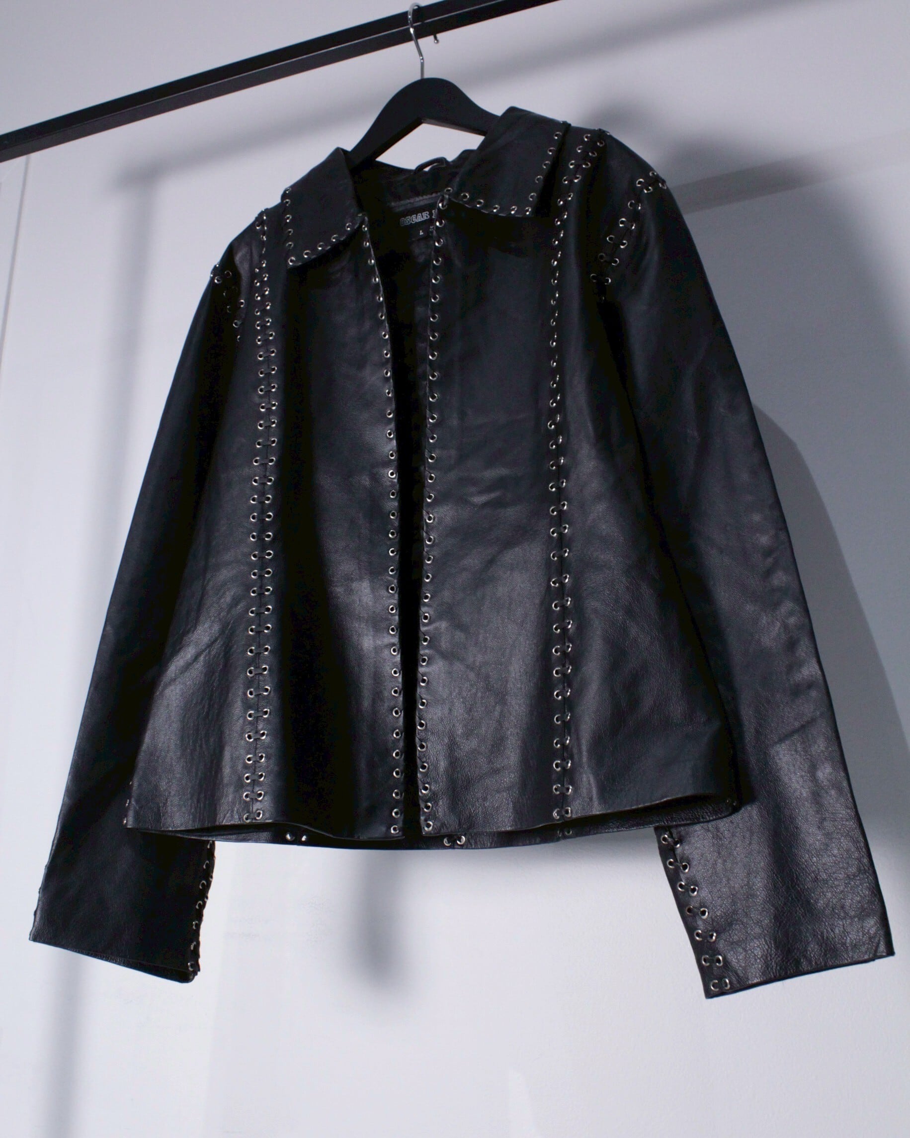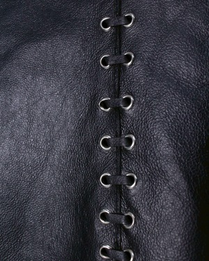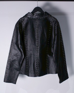 ハリ、コシのあるブラックレザーを用いたボディに、ハトメをズラリと打ち込み紐を通してステッチ風のデザインに仕上げたレザージャケット。