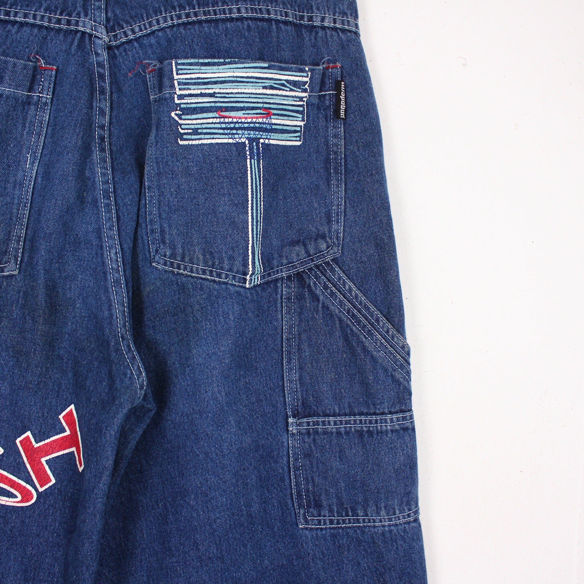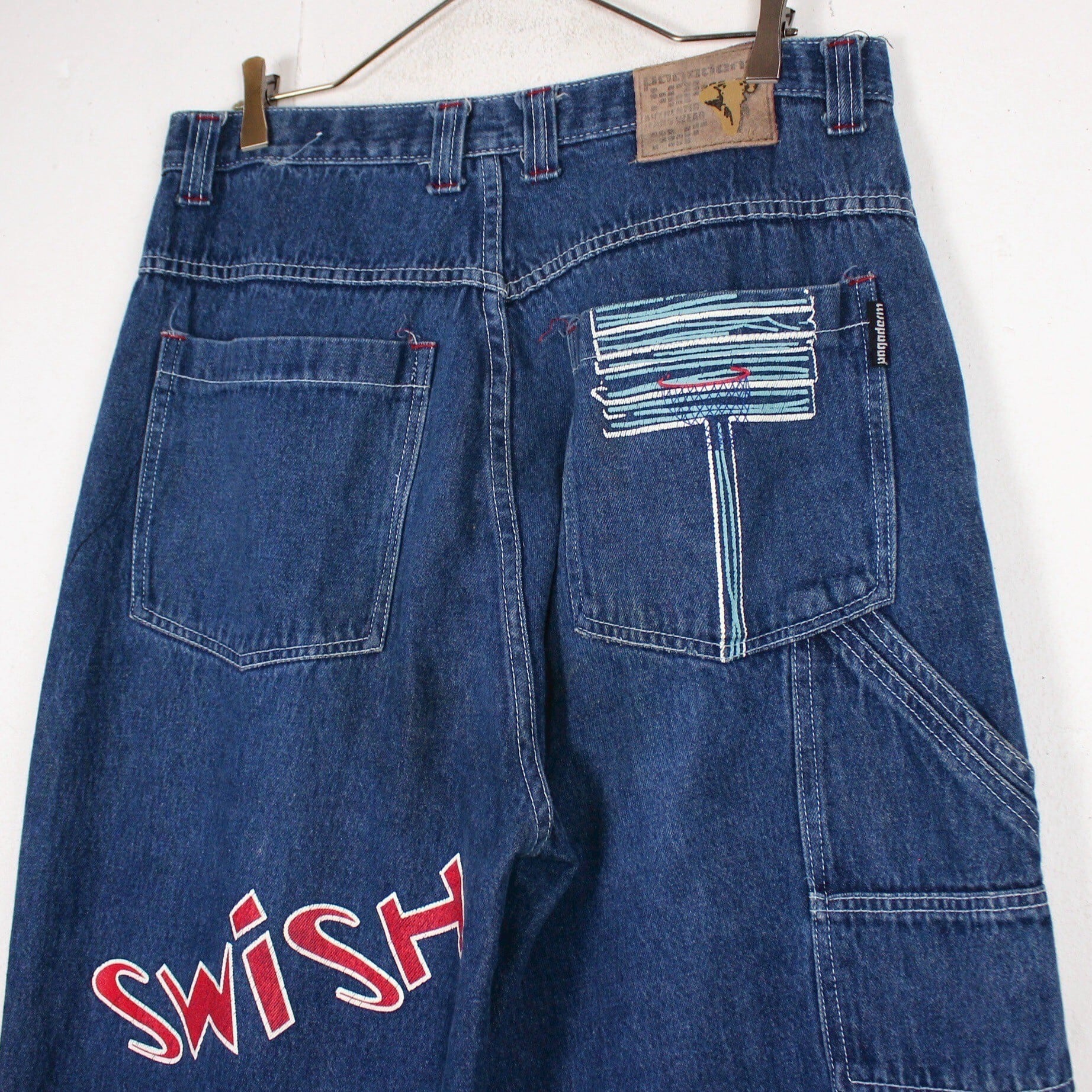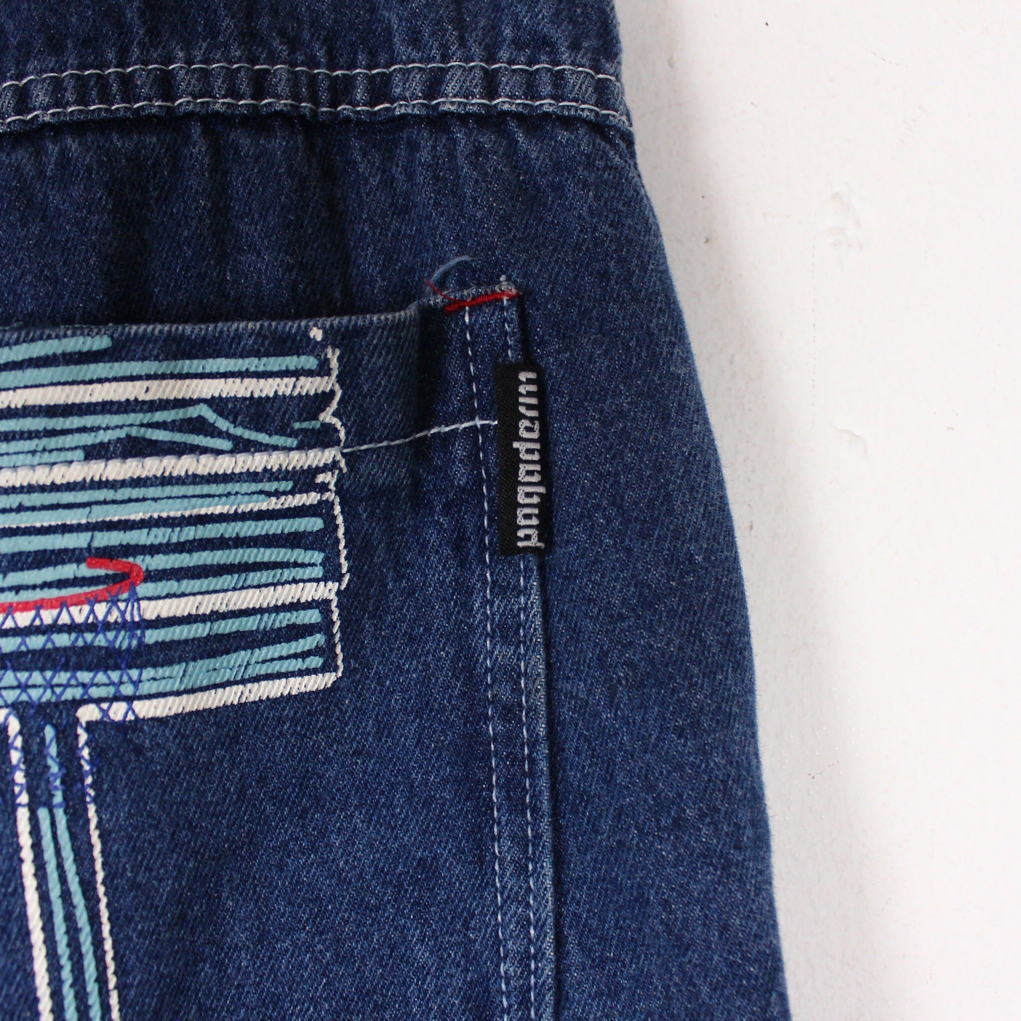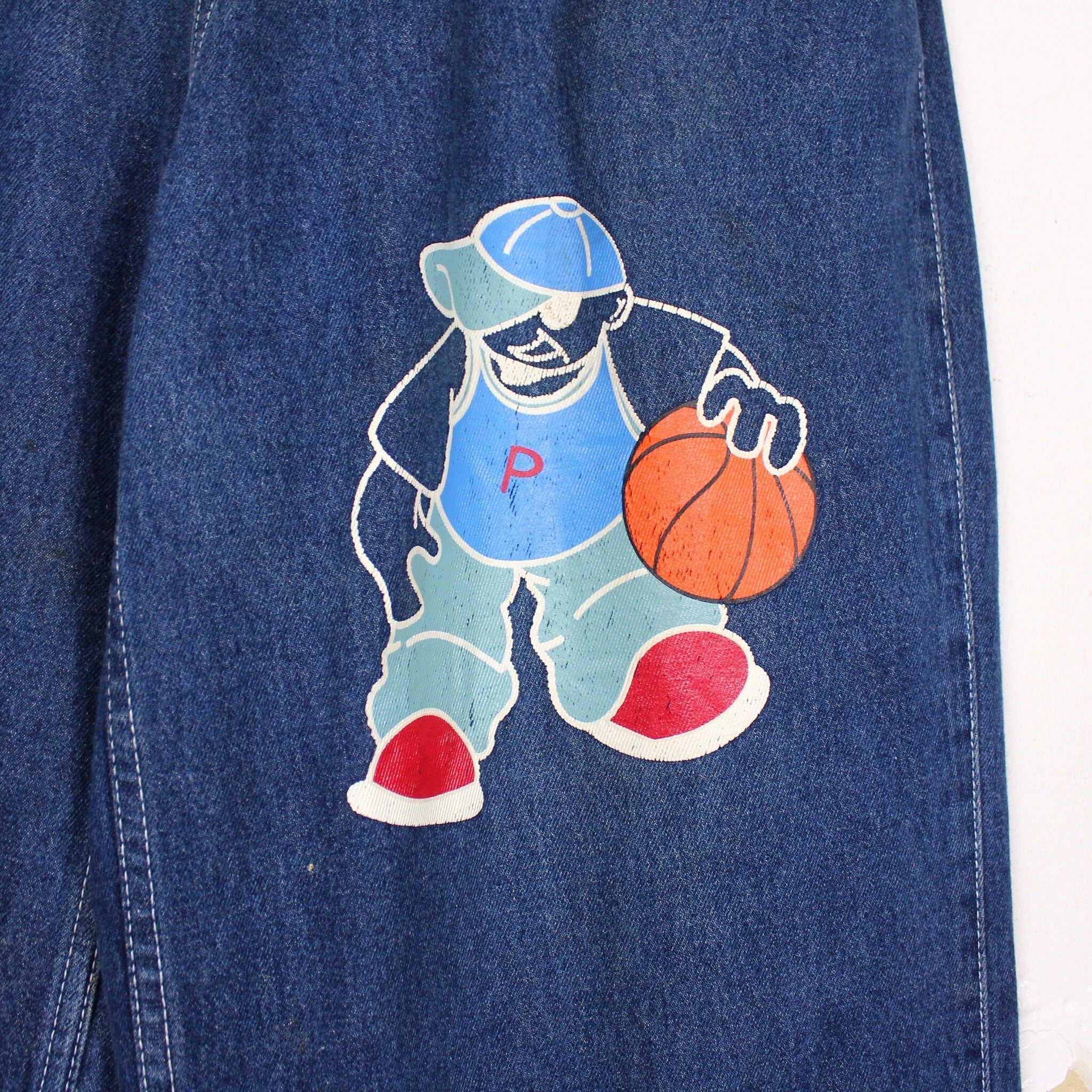 アタリの程よいデニムのボディに、フロントポケット、左腿にバスケボール、B-Boyがプレイする姿をプリントで載せたバギーデニムパンツ。