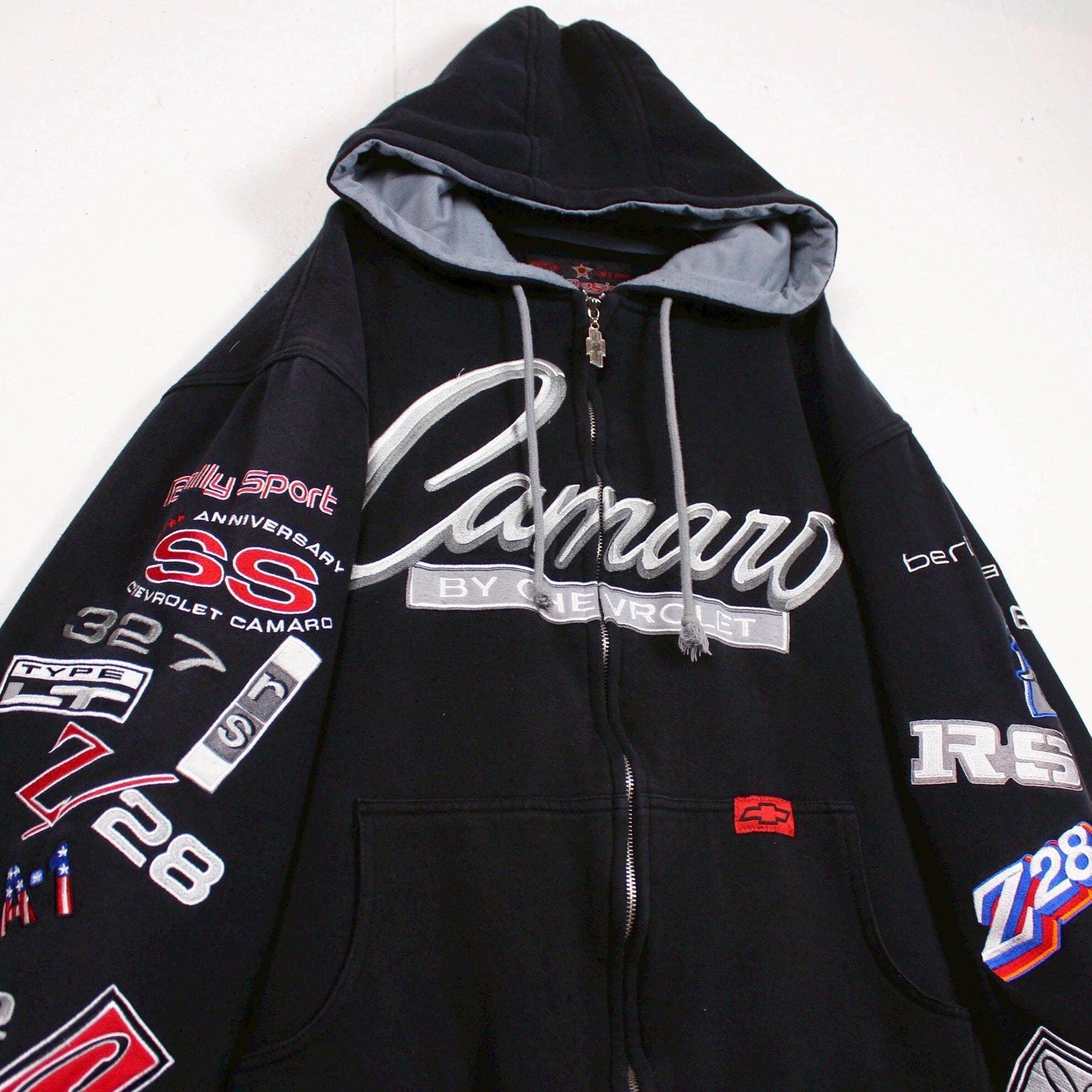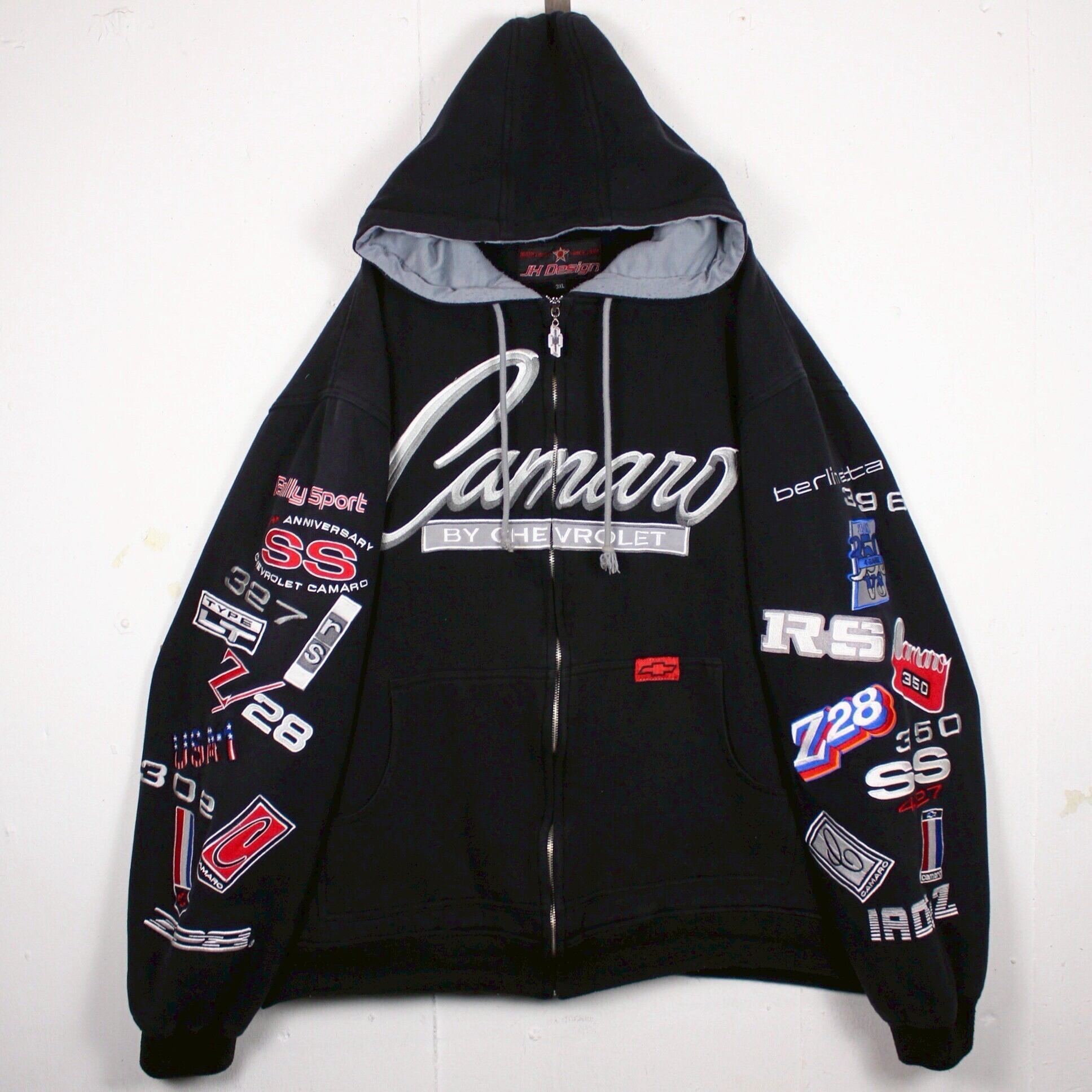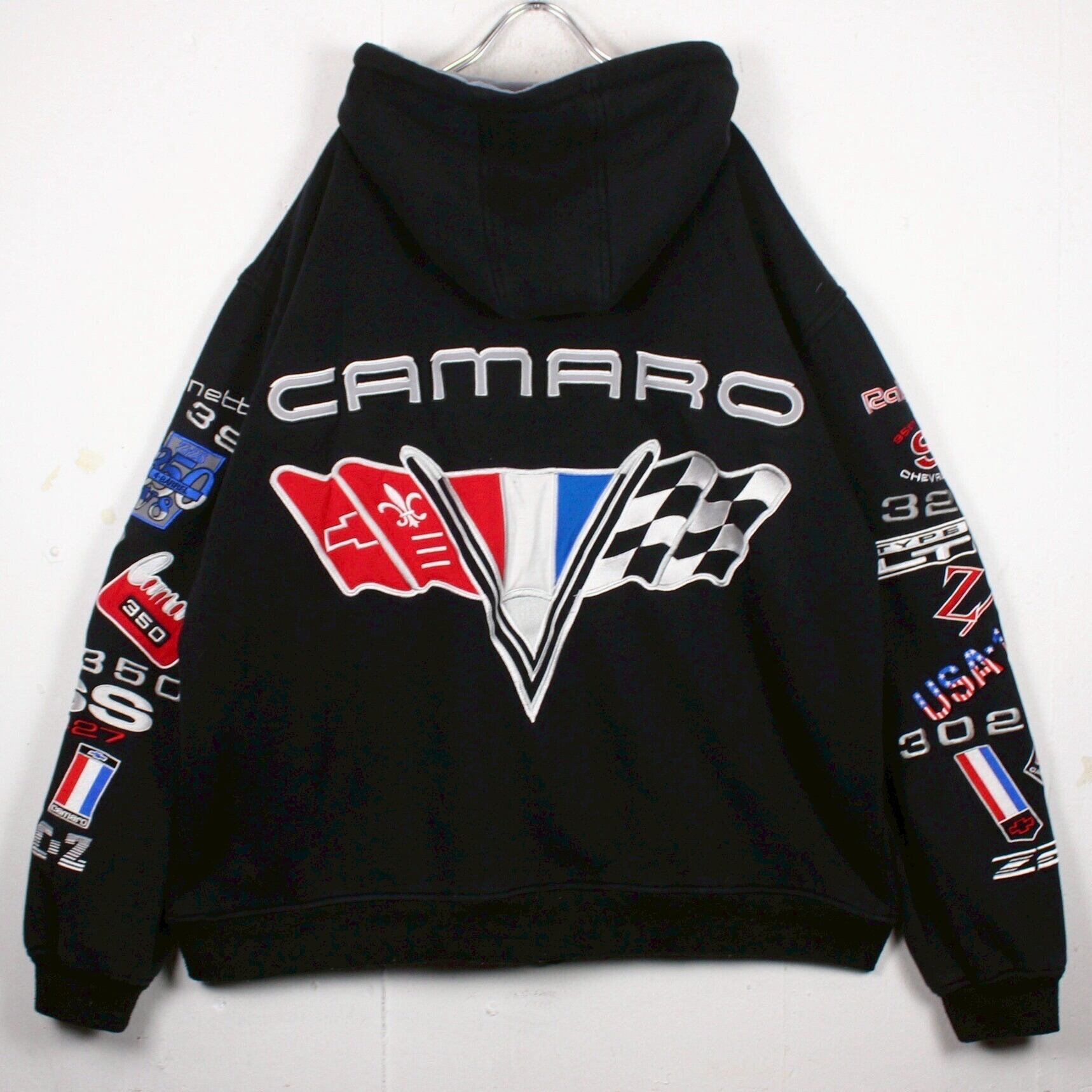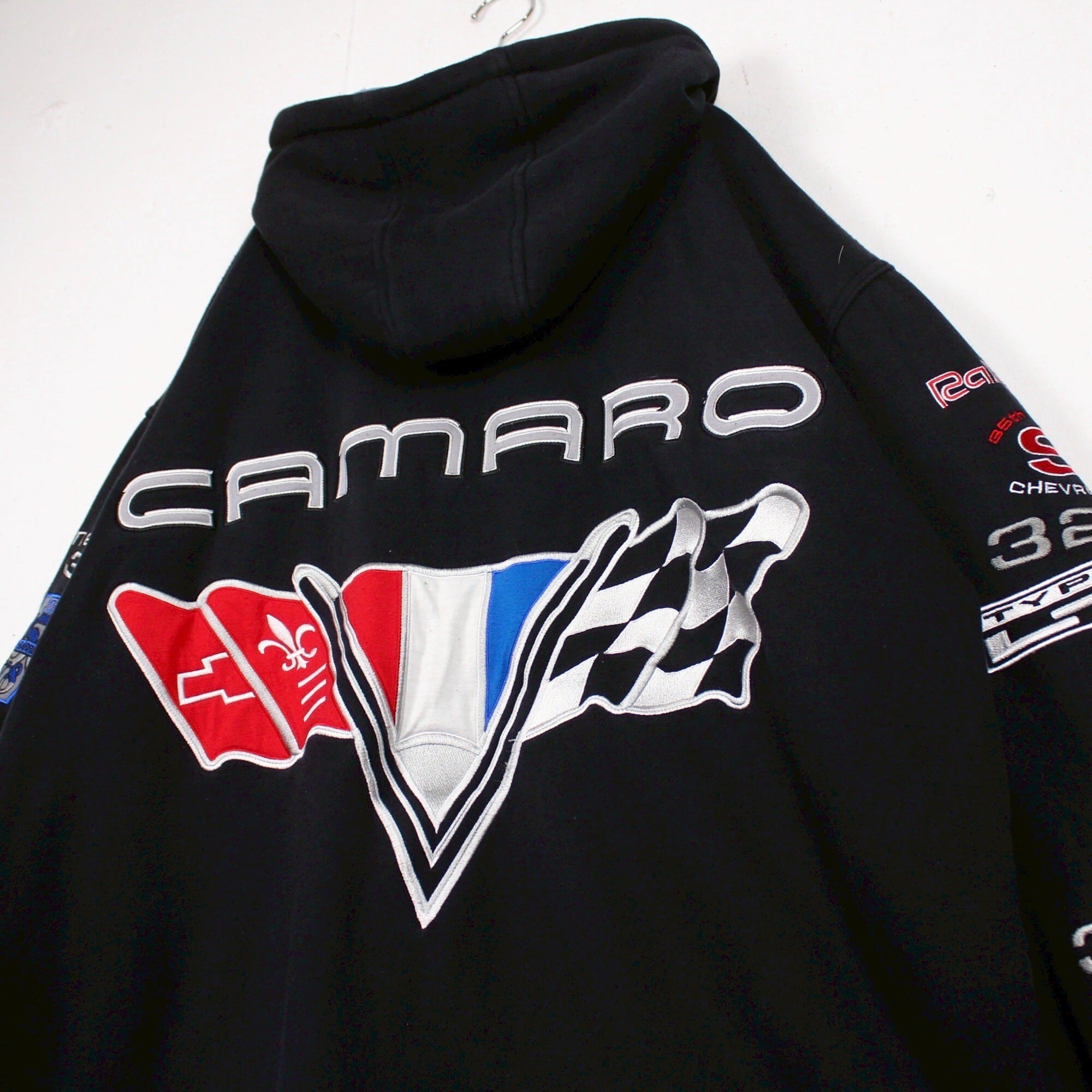 マッスルカーの代表格"カマロ"の文字や、ロゴを刺繍で刻んだジップアップフーディ。