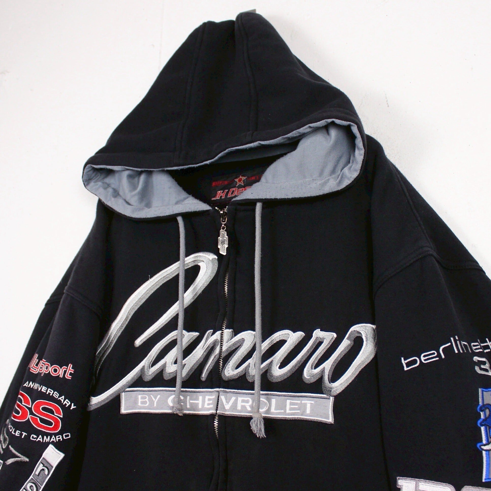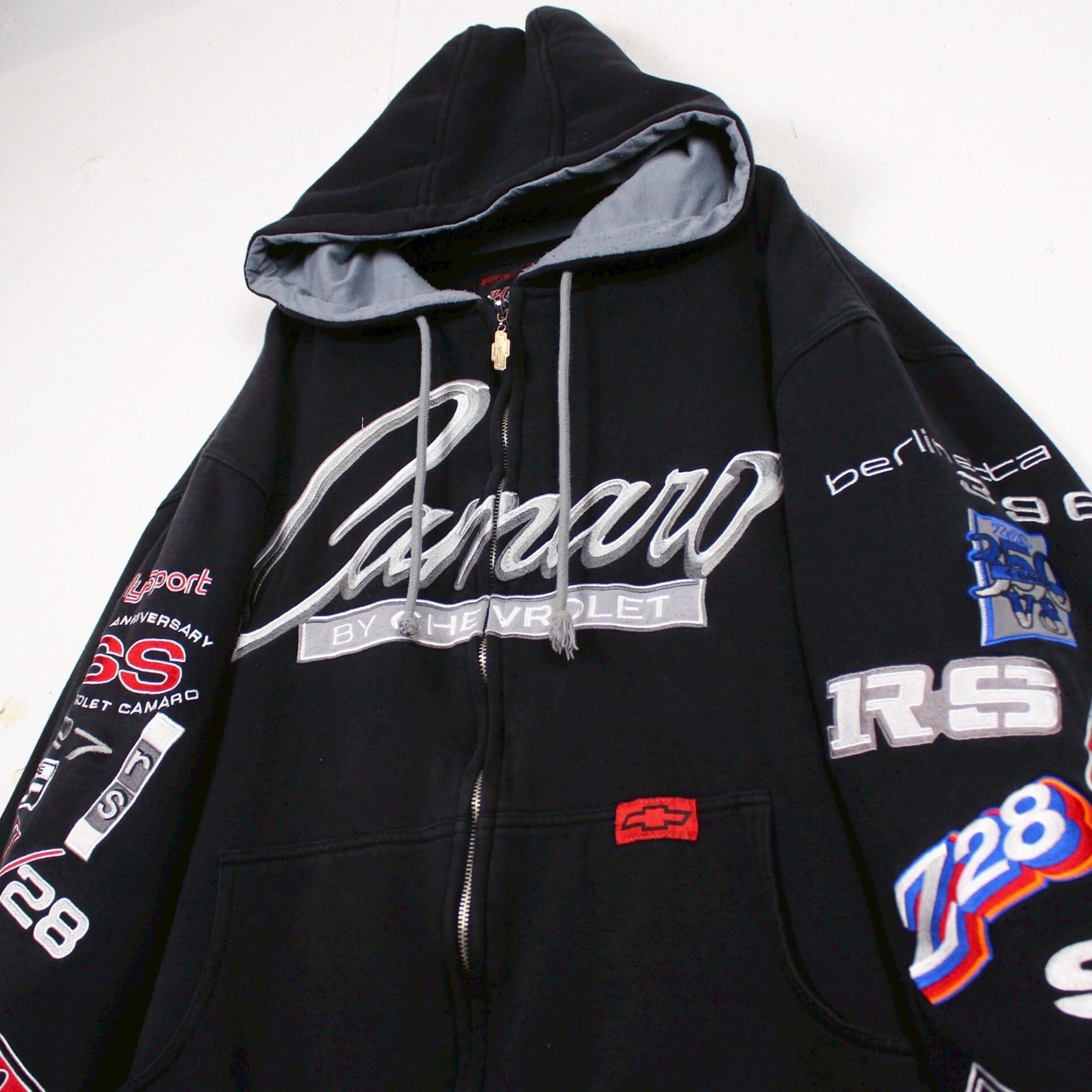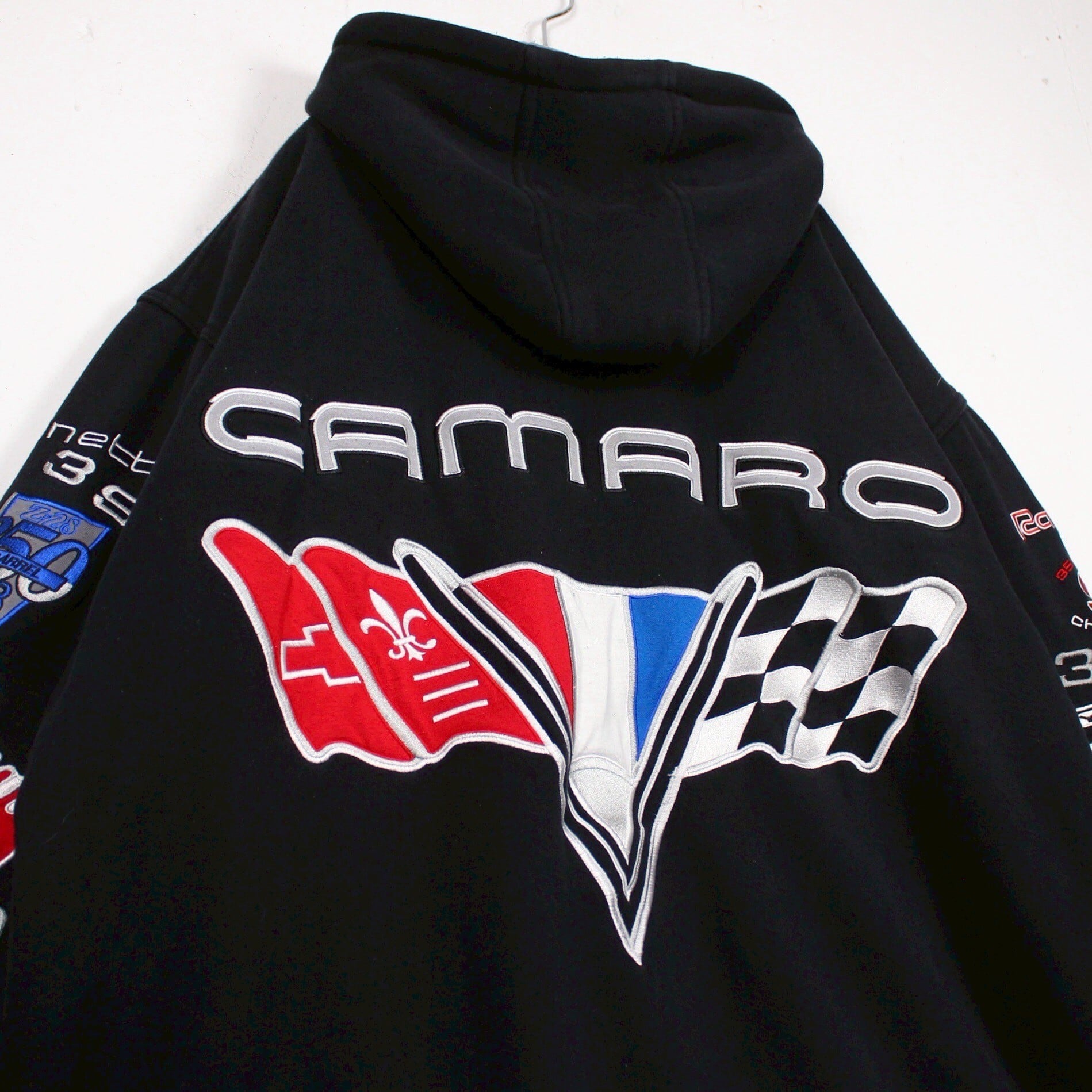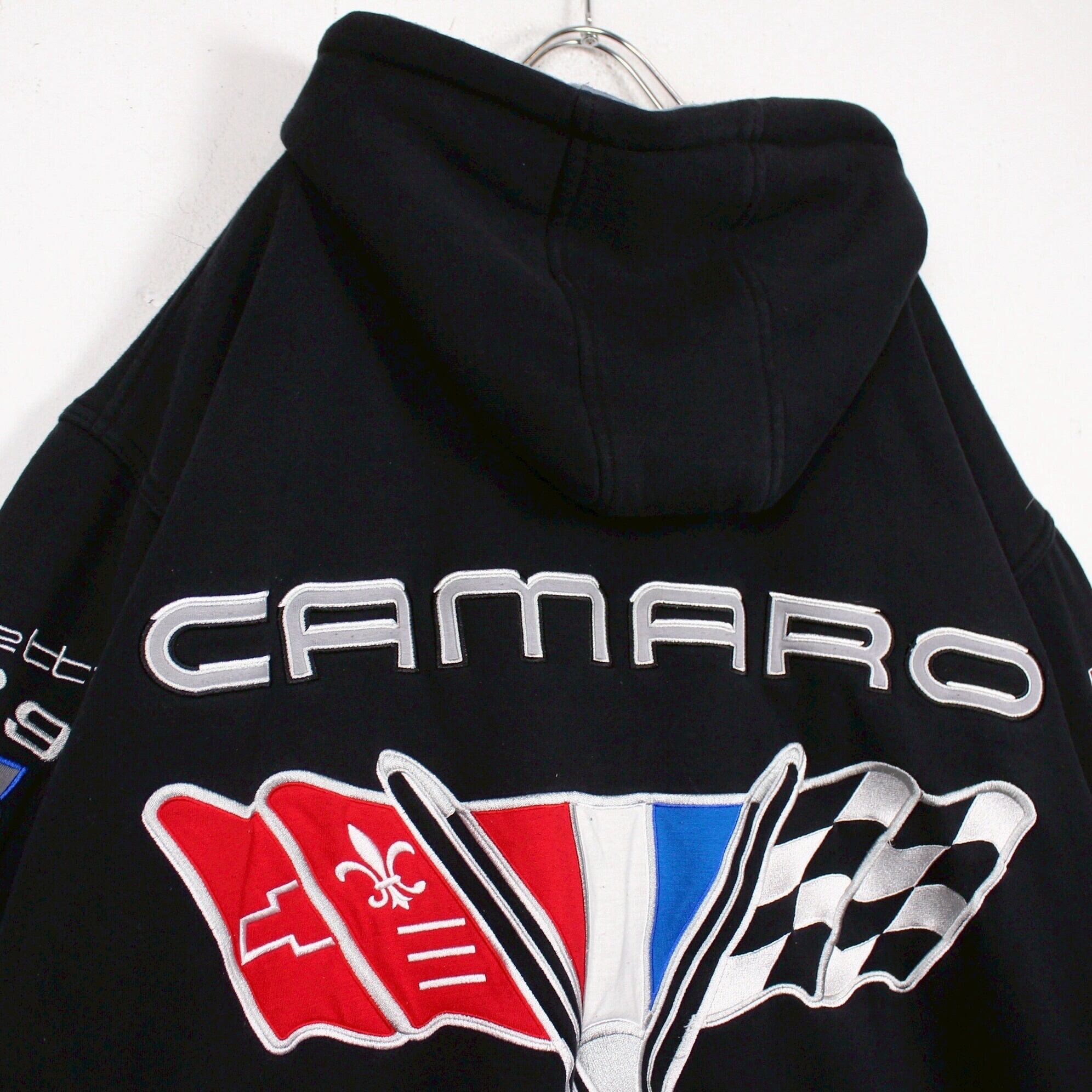 マッスルカーの代表格"カマロ"の文字や、ロゴを刺繍で刻んだジップアップフーディ。