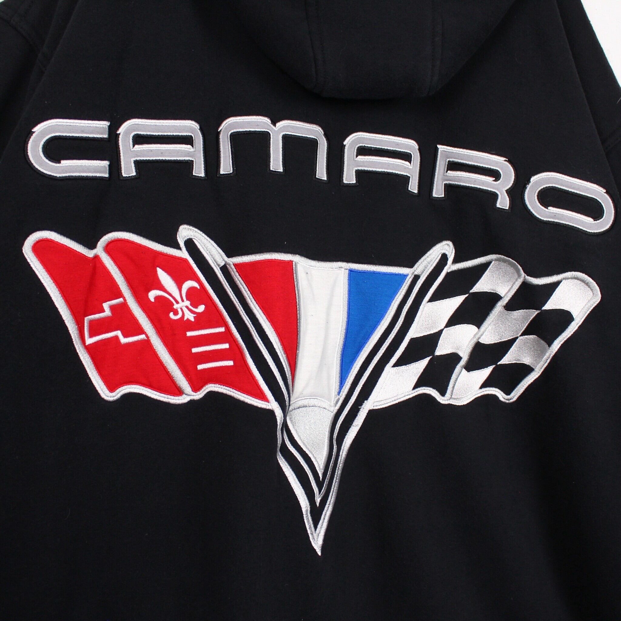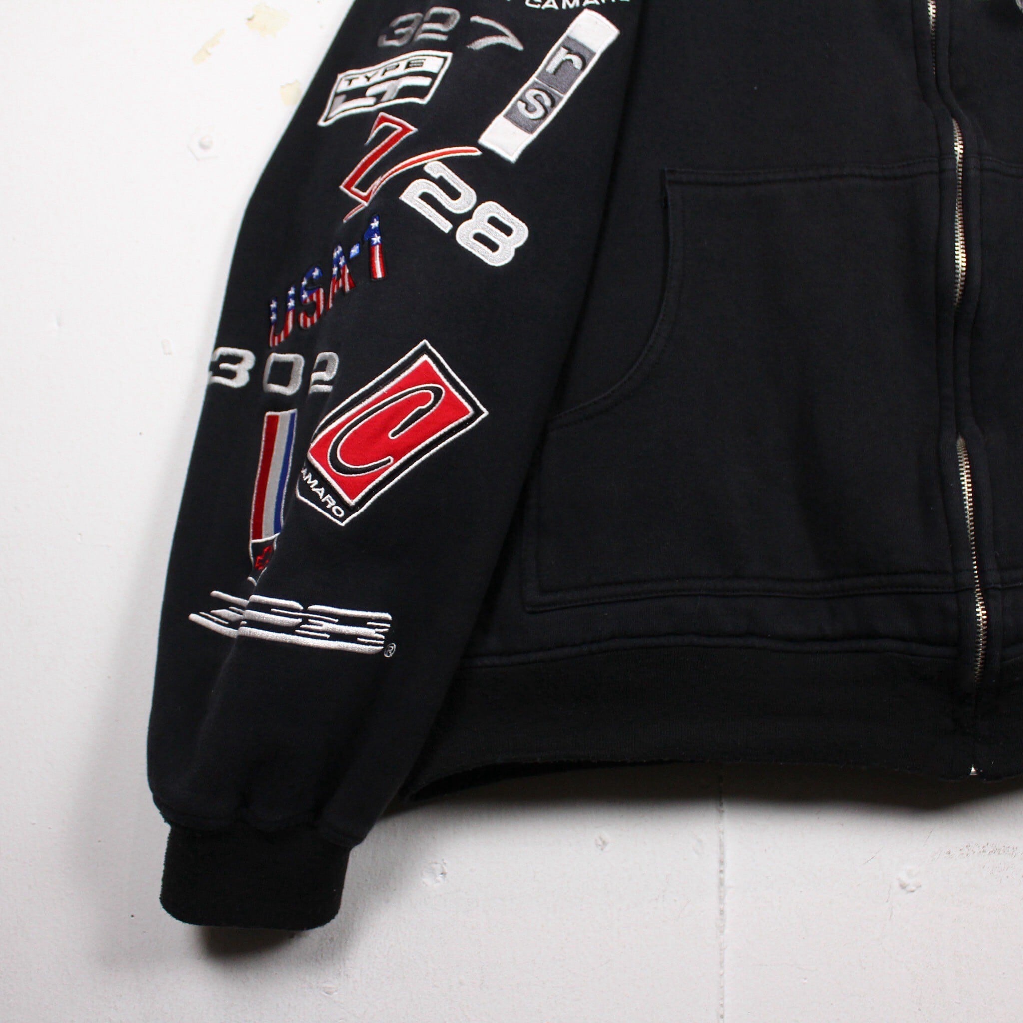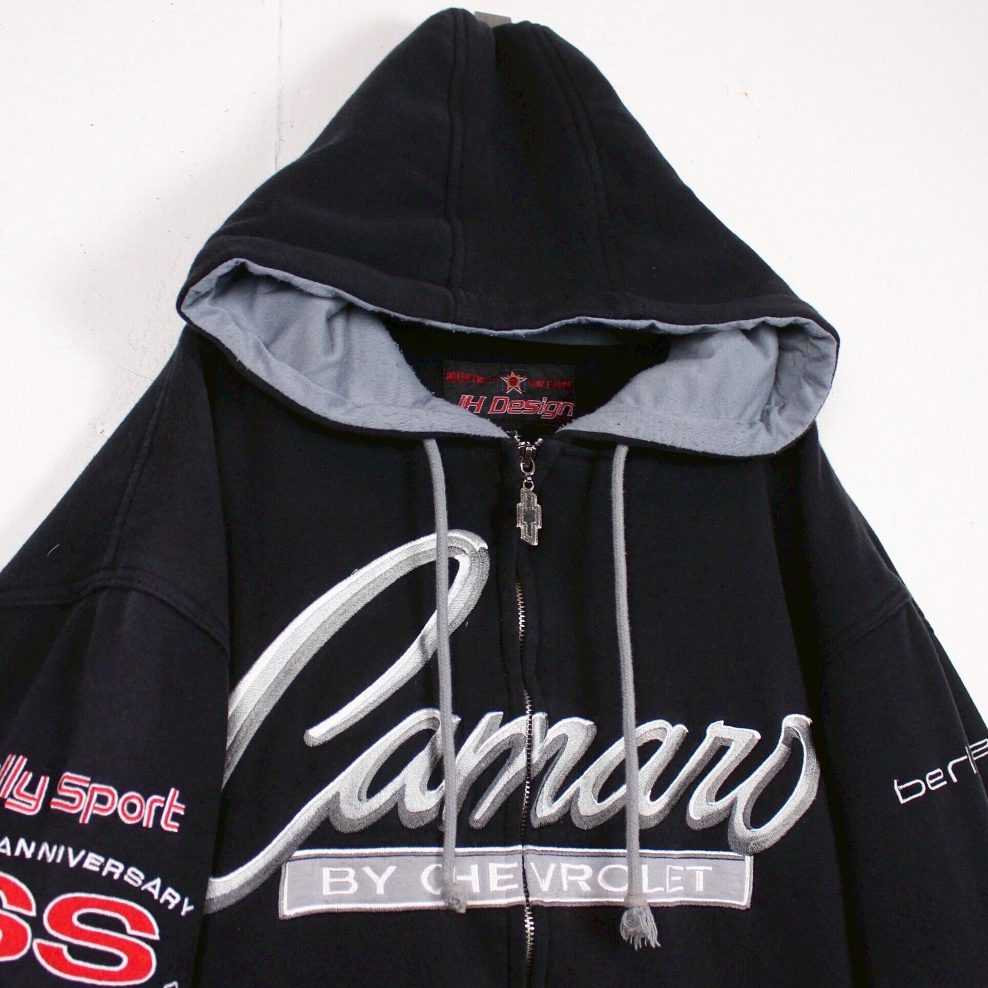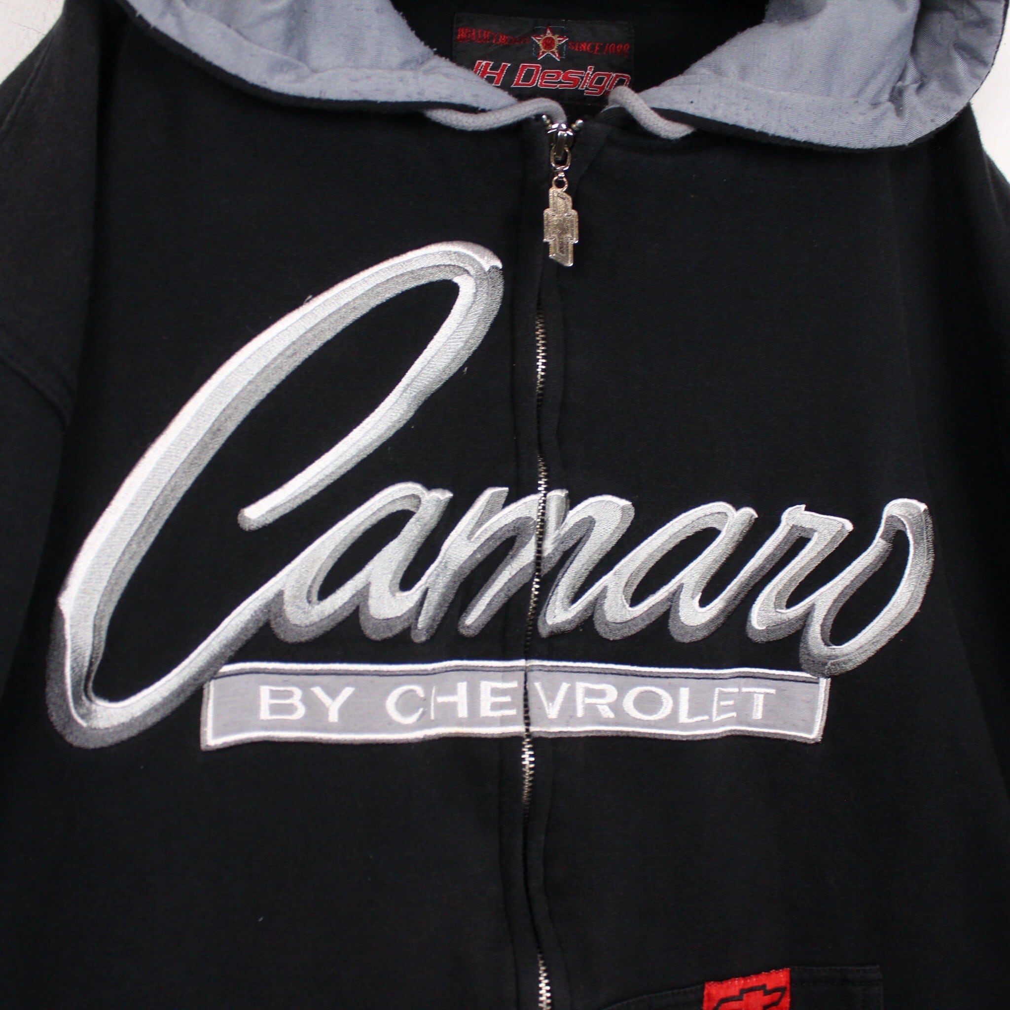 マッスルカーの代表格"カマロ"の文字や、ロゴを刺繍で刻んだジップアップフーディ。