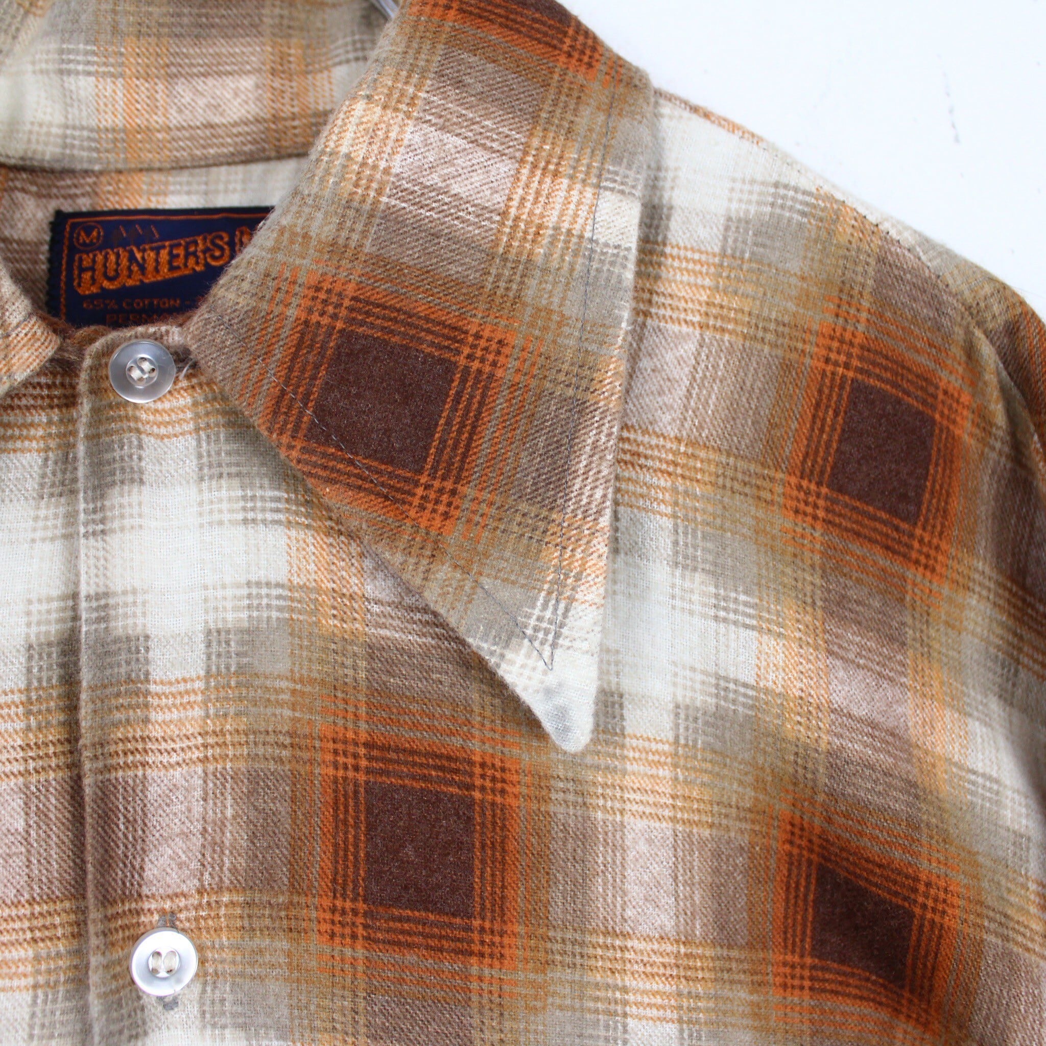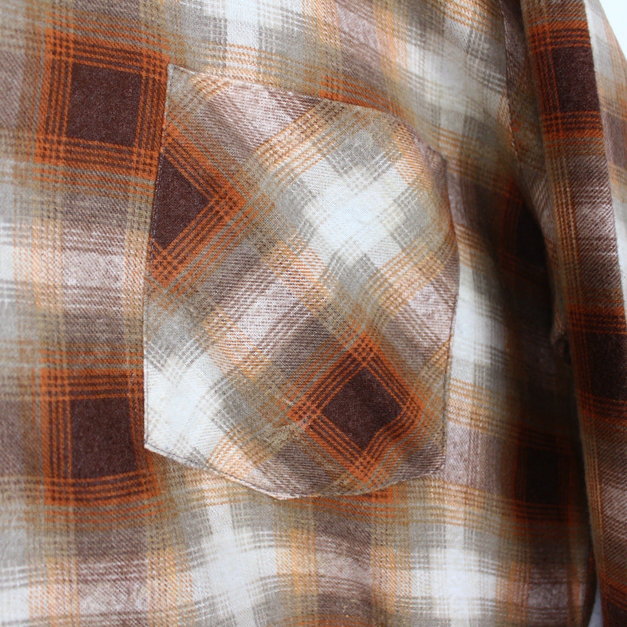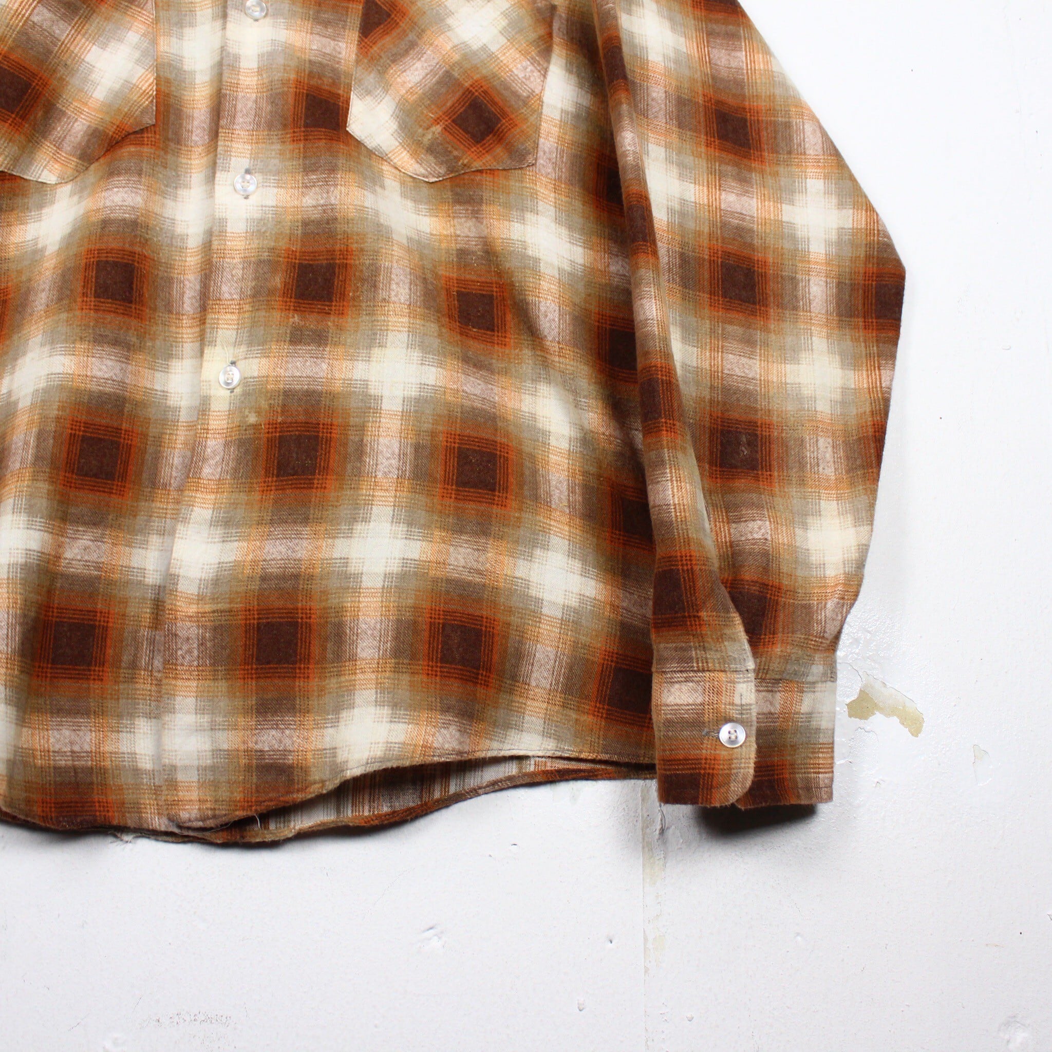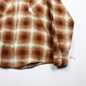 温かみのある白、ベージュ、オレンジ、ブラウンのカラーリングでオンブレチェックを全体に配した70'sヴィンテージの長袖シャツ。
