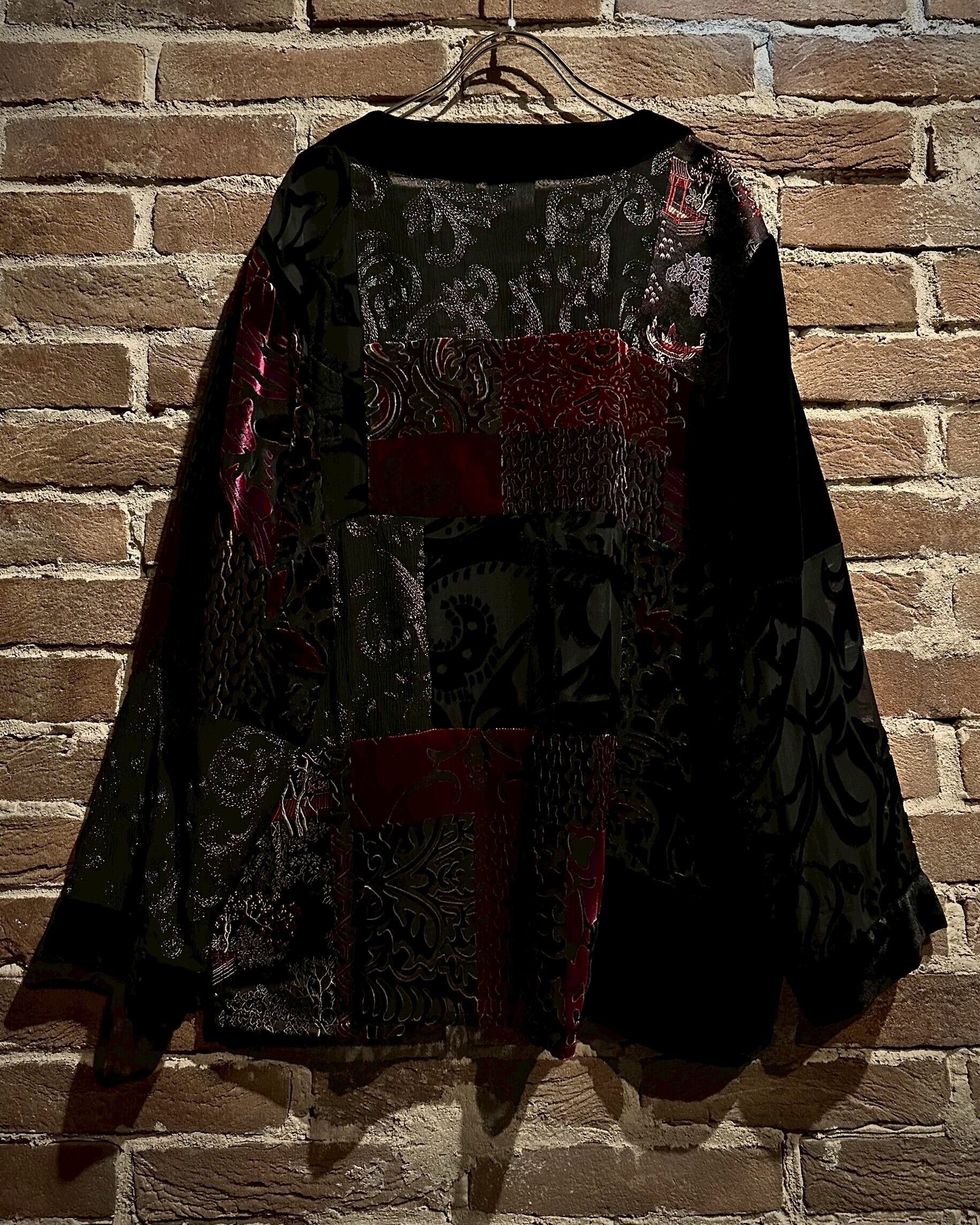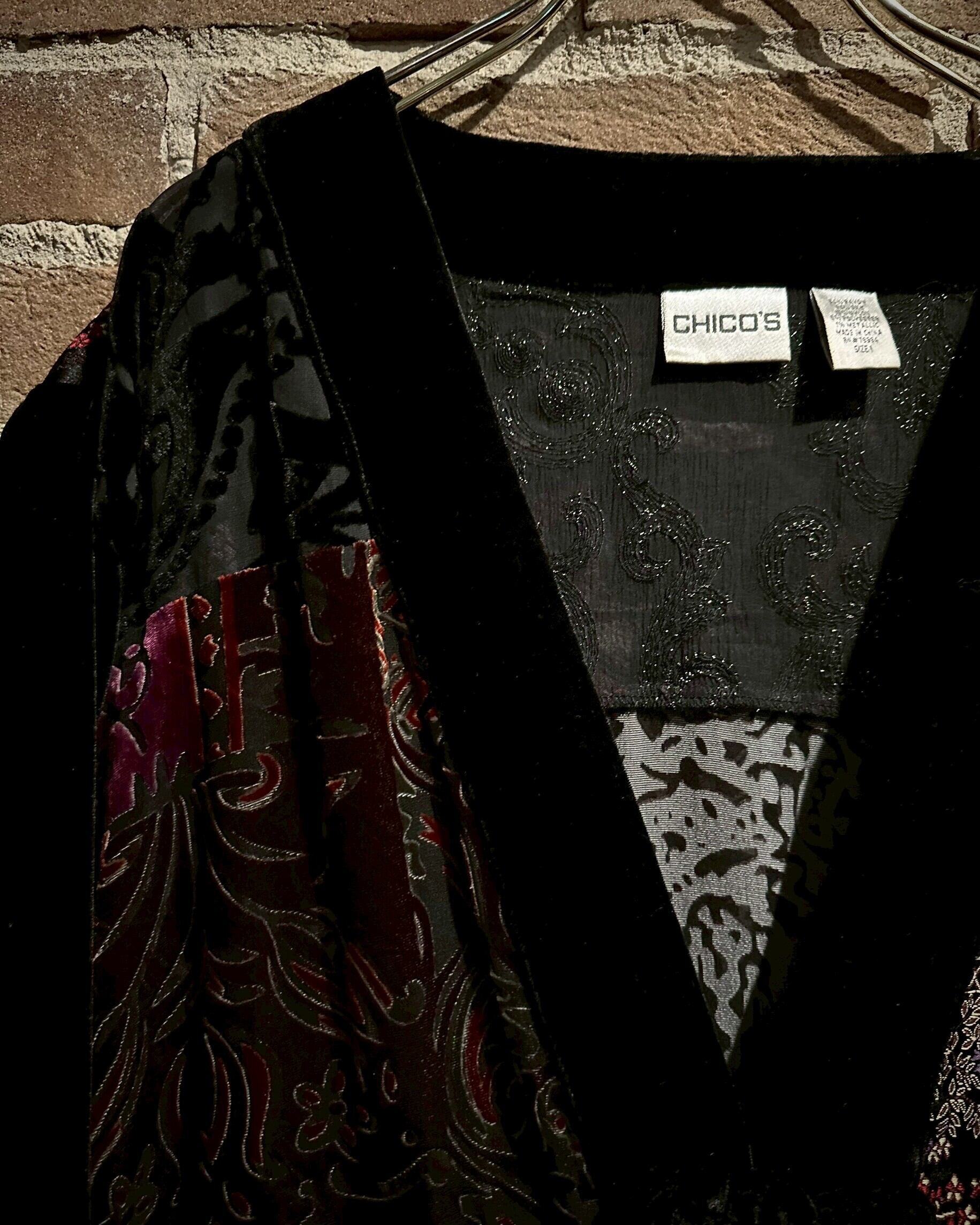 透け感の美しいブラックシアーを用いたボディに、ベロアのフロッキープリントによってボタニカル調の柄模様を載せたカーディガンジャケット。