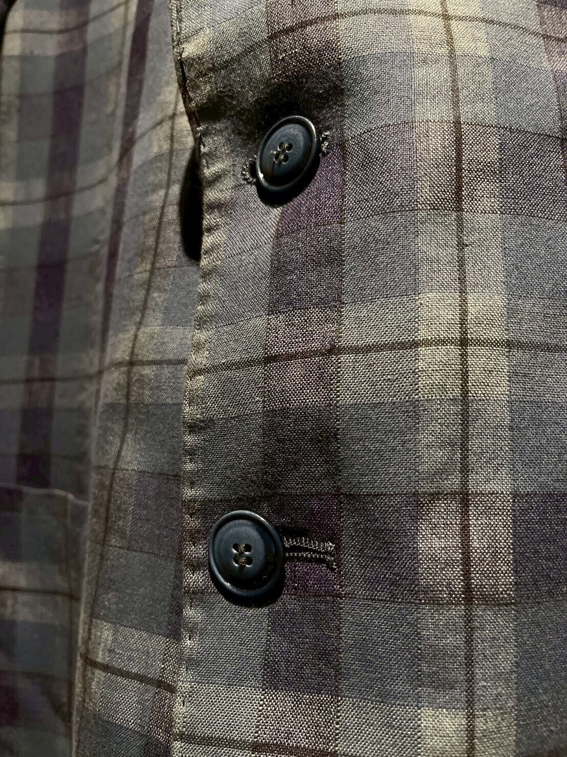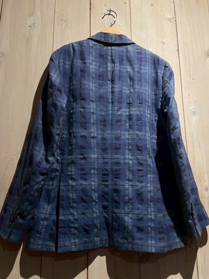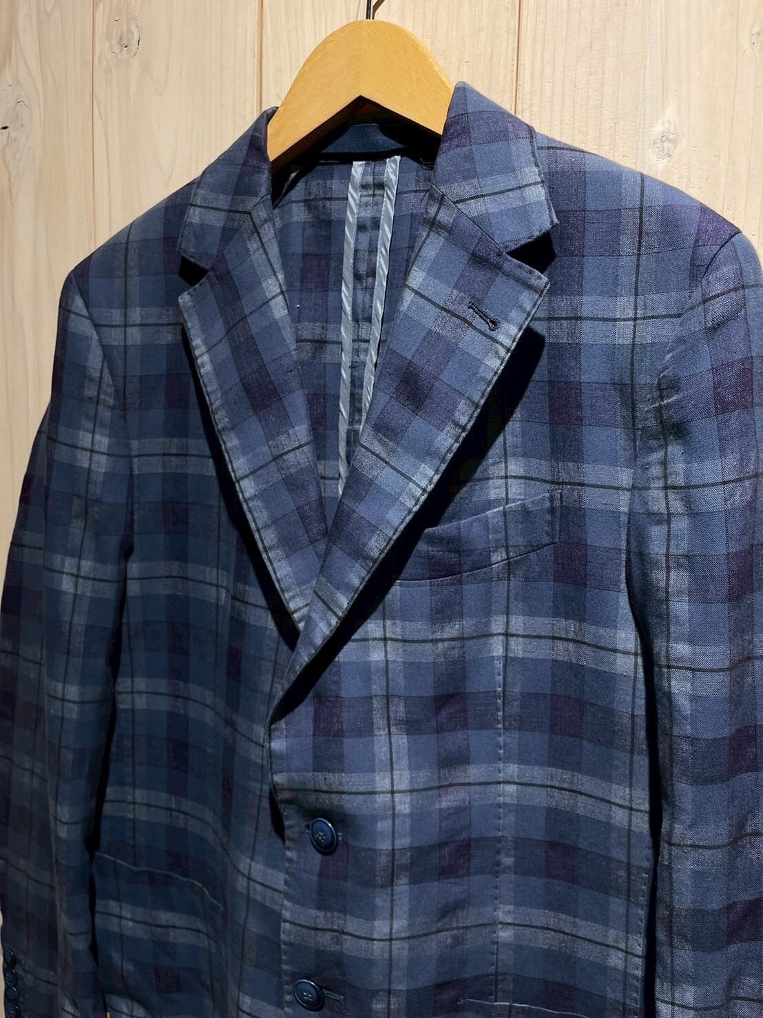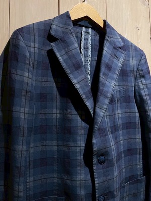 リネン×コットンを使用したハリのある素材を使用し、上品な青ベースのオーバーチェックを全面に載せたテーラードジャケット。