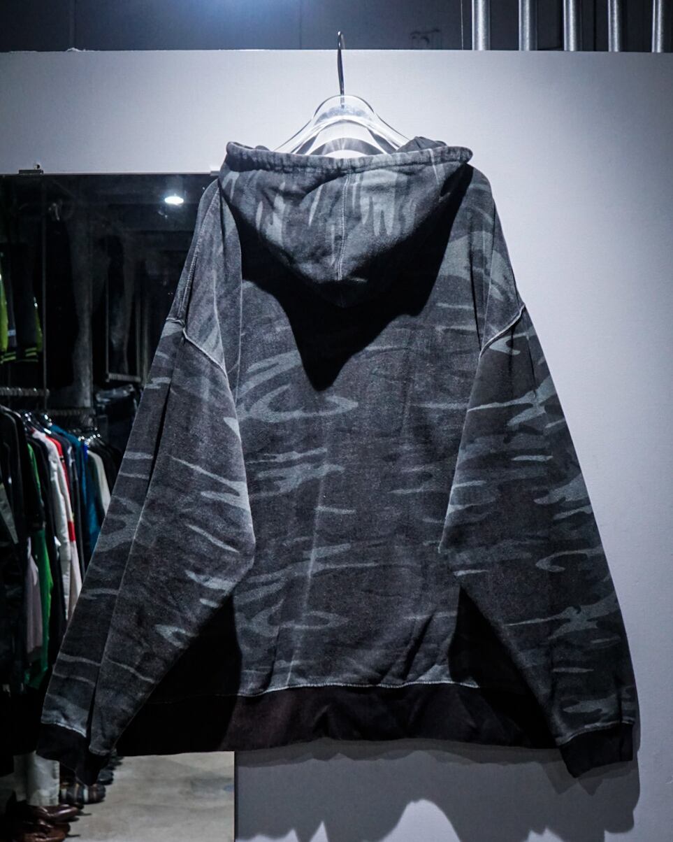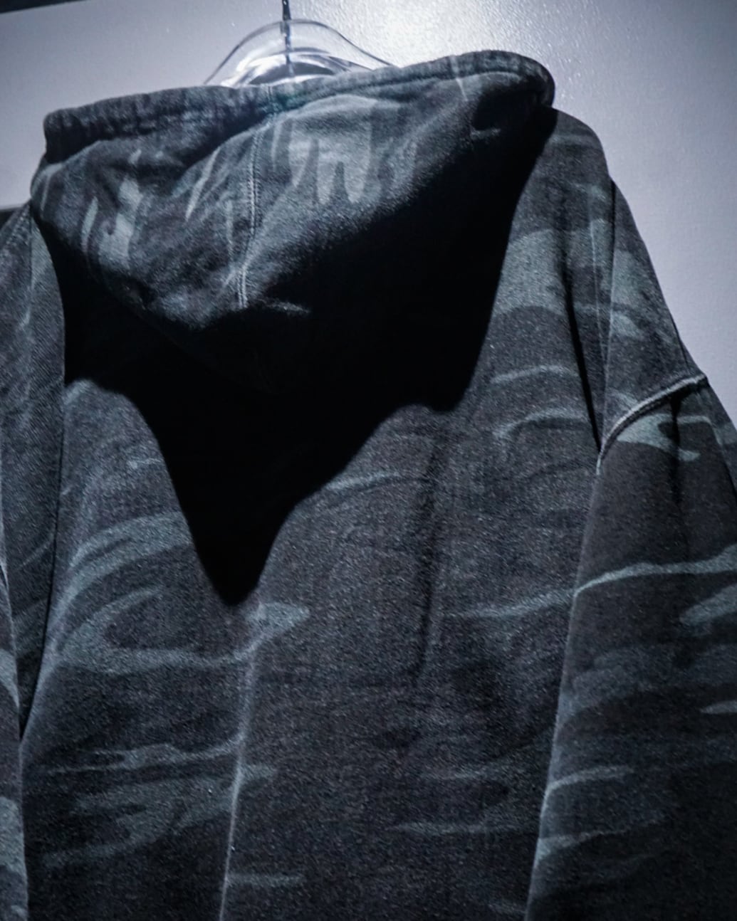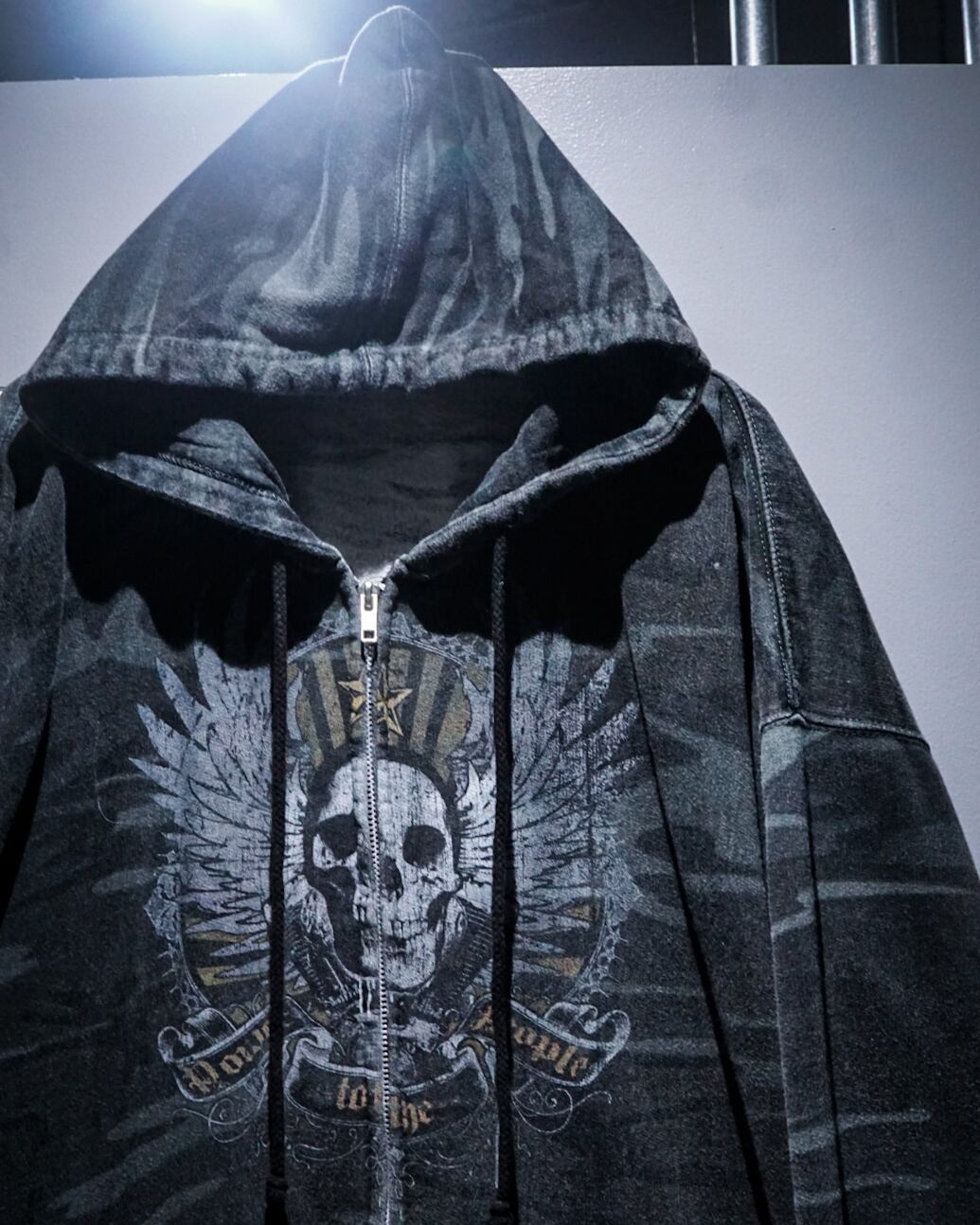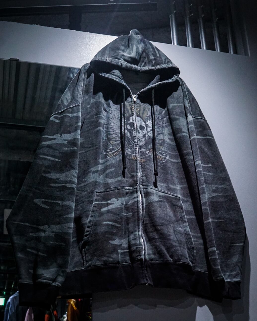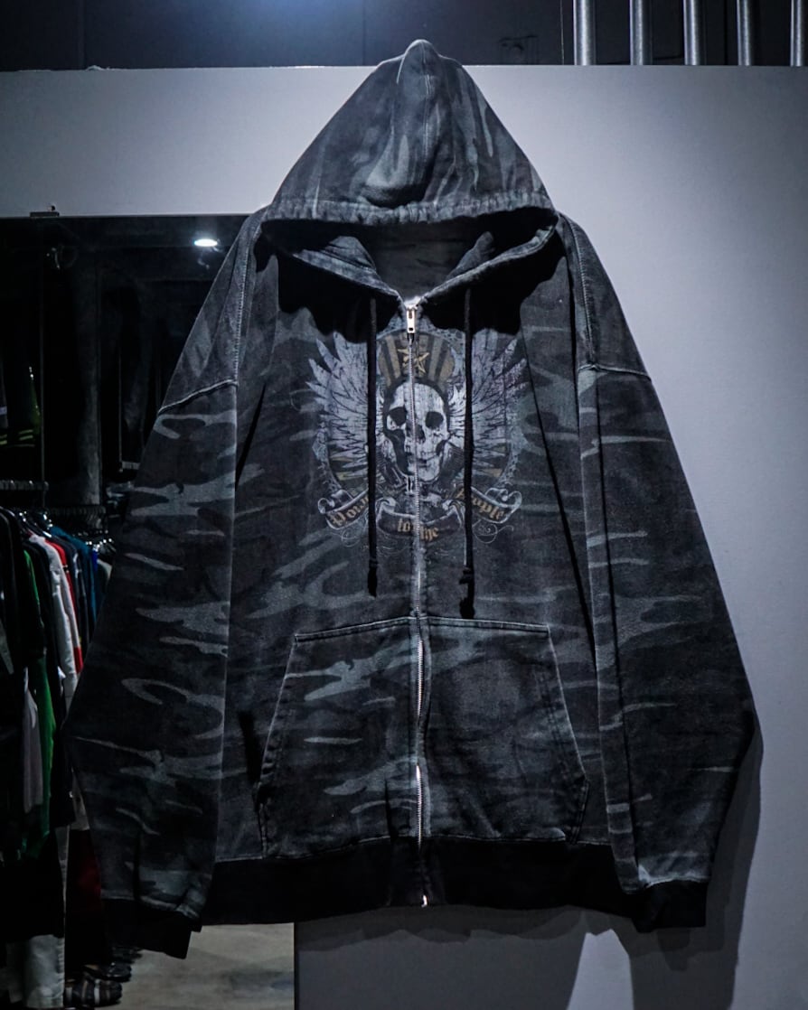 ウッドランドカモをボディ全面に配し、フロントにスカルモチーフのプリントを載せたジップアップフーディ。