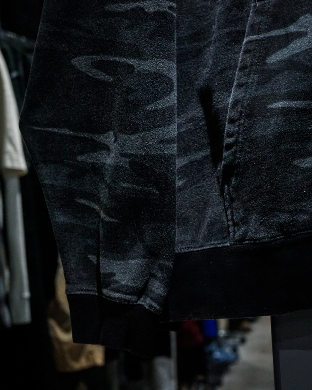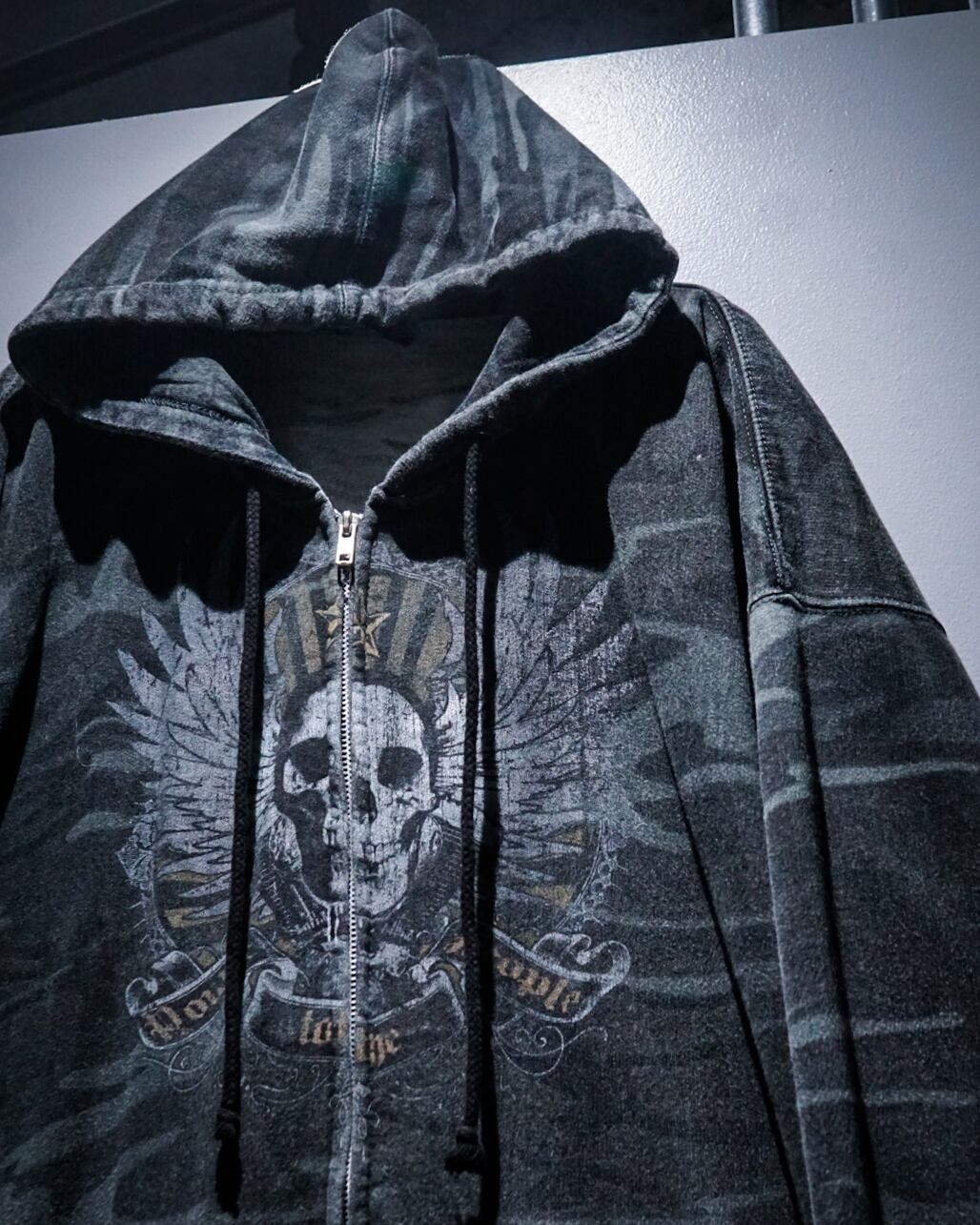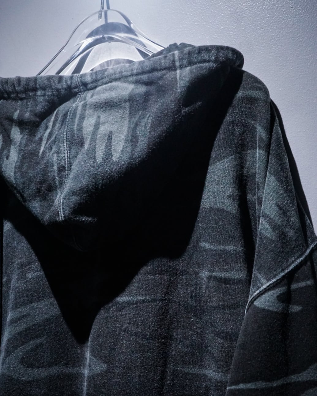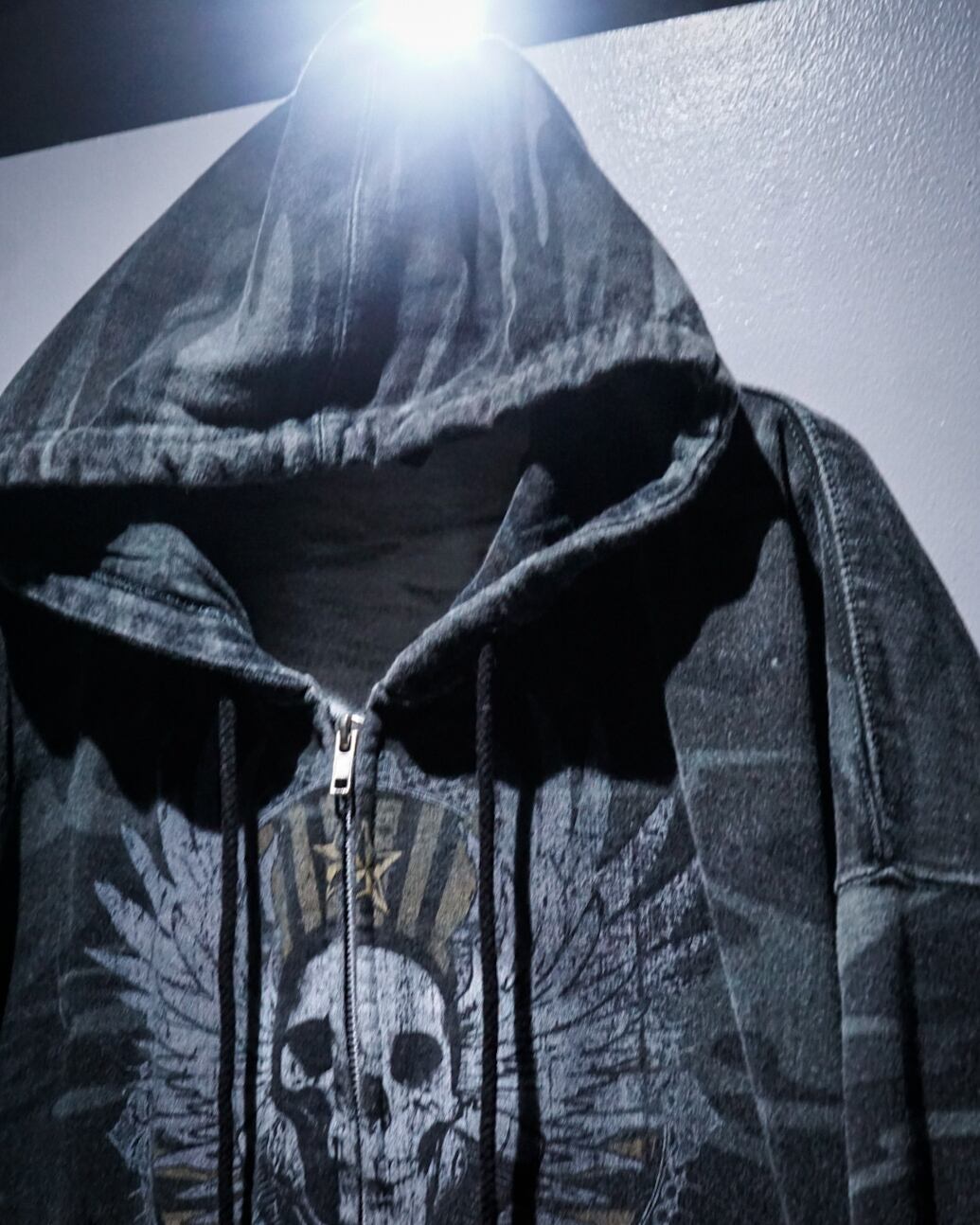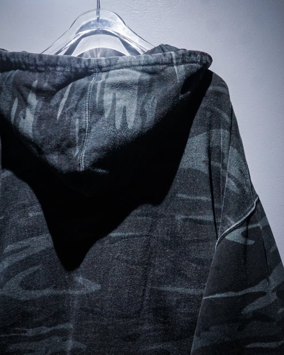 ウッドランドカモをボディ全面に配し、フロントにスカルモチーフのプリントを載せたジップアップフーディ。