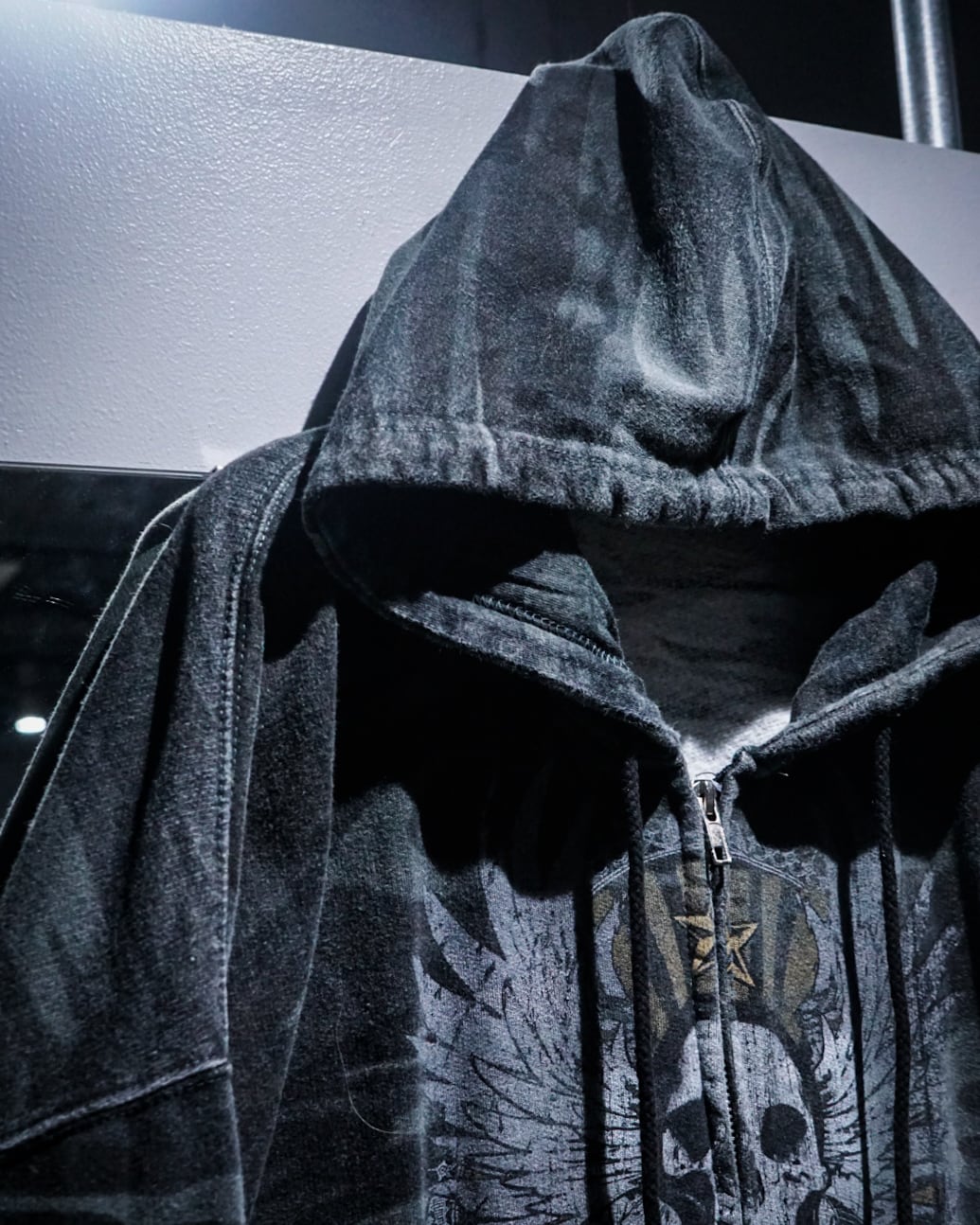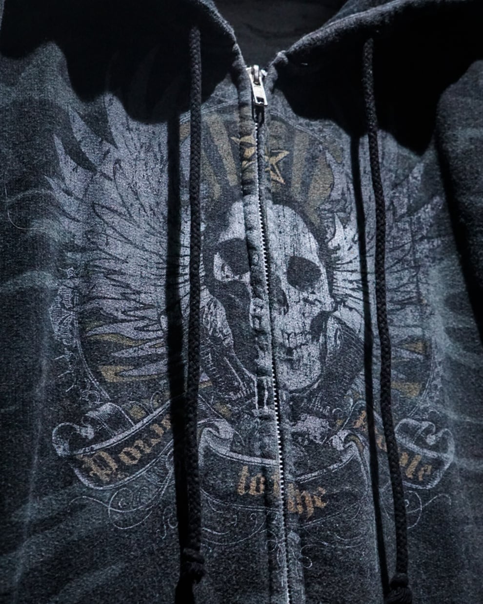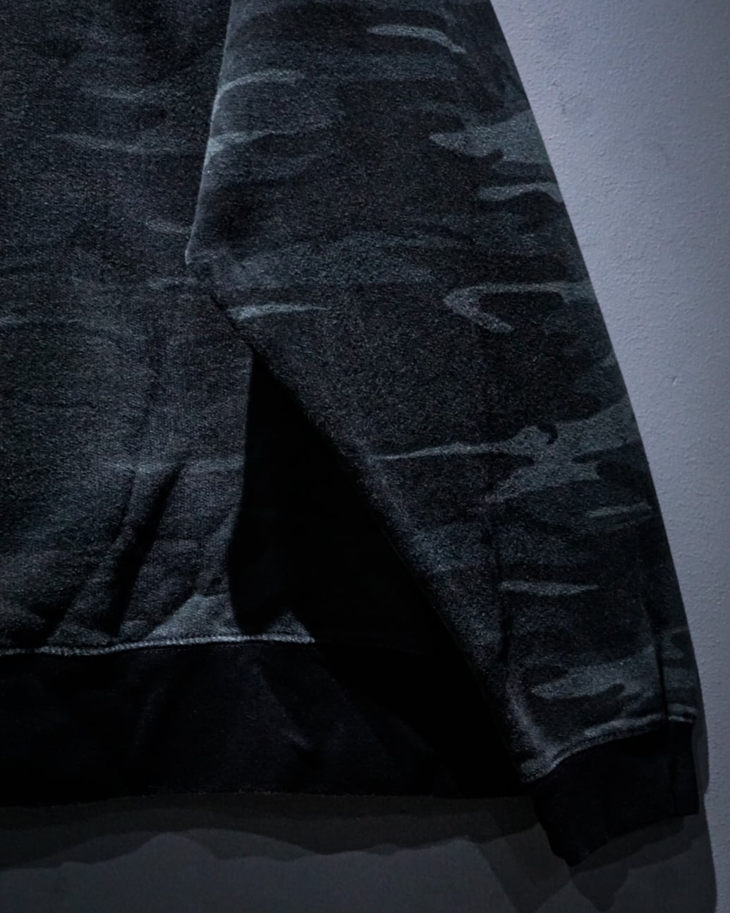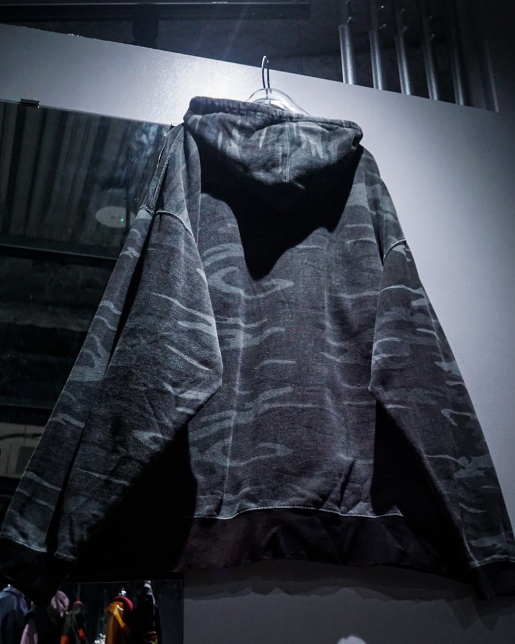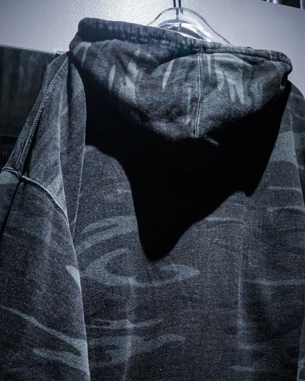 ウッドランドカモをボディ全面に配し、フロントにスカルモチーフのプリントを載せたジップアップフーディ。