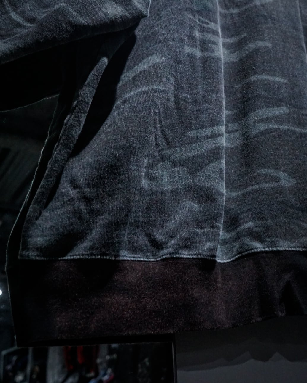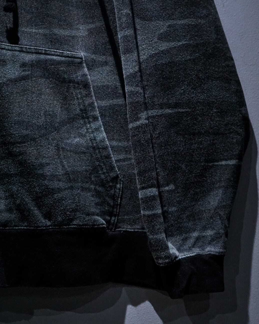 袖口、裾に施されたリブやフード部分に施されたドローコードには黒を差し込み、褪色の効いた淡いデザインの中にアクセントをプラス。