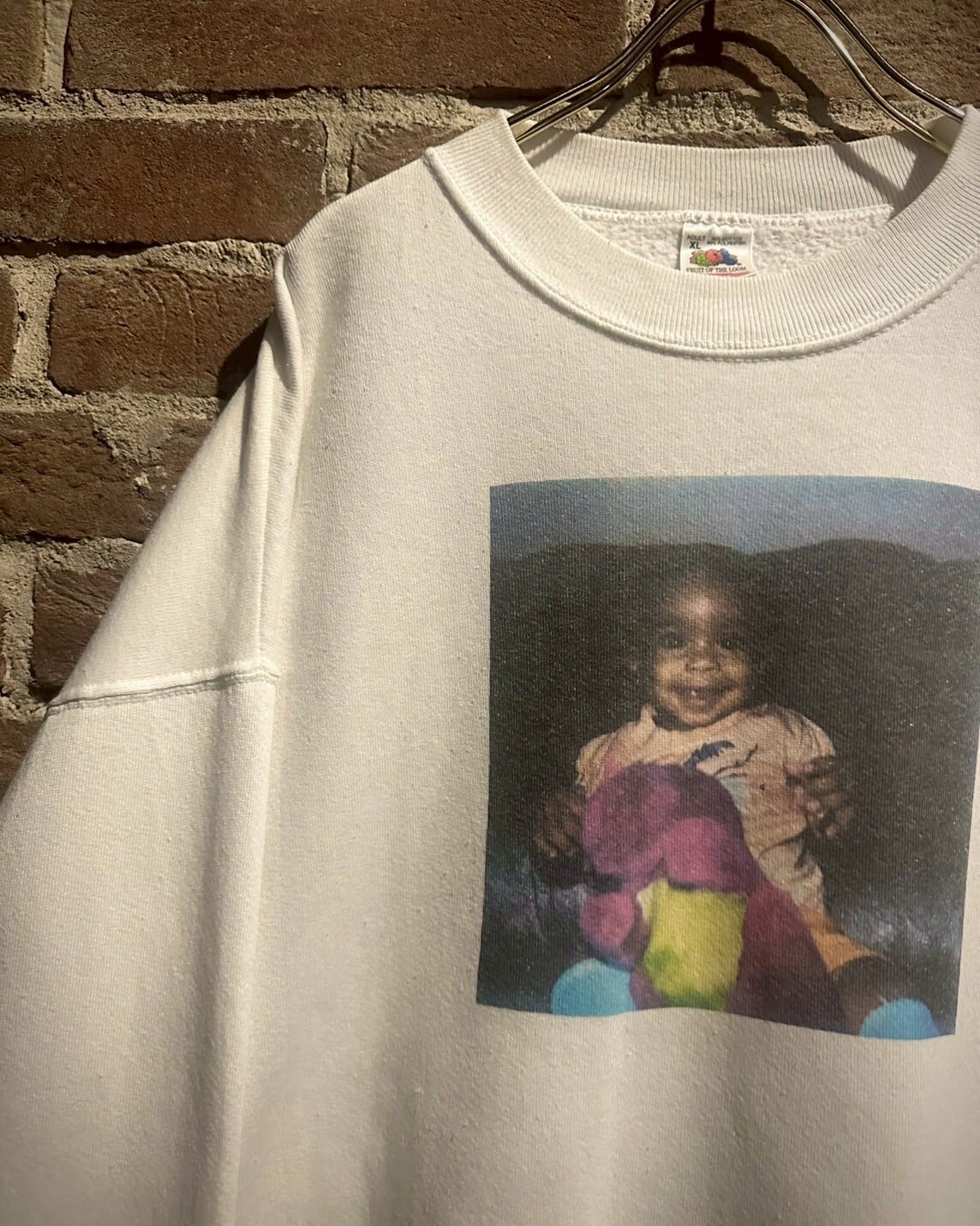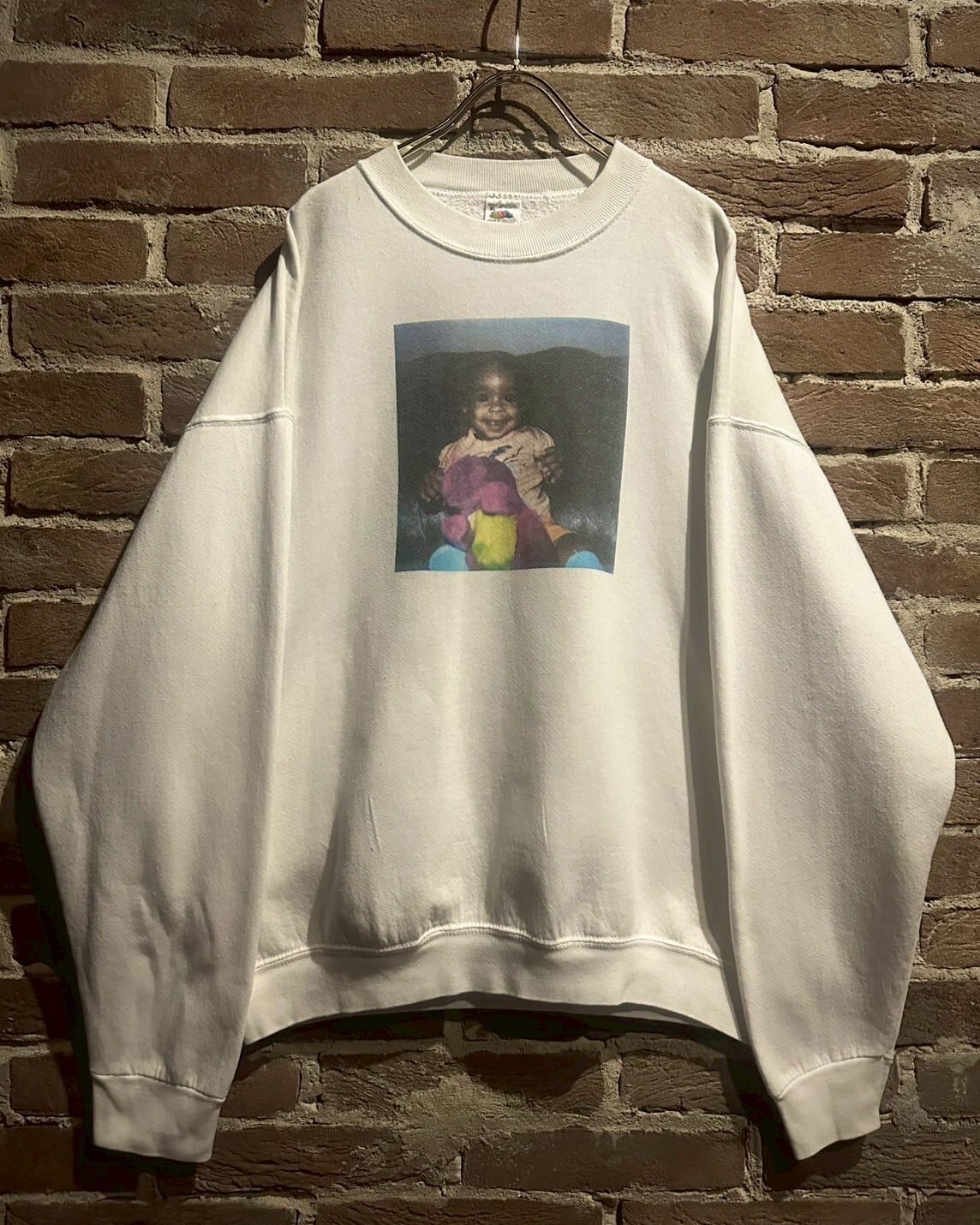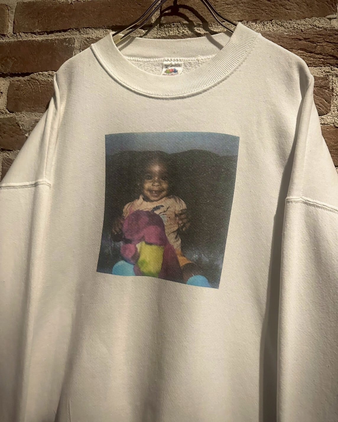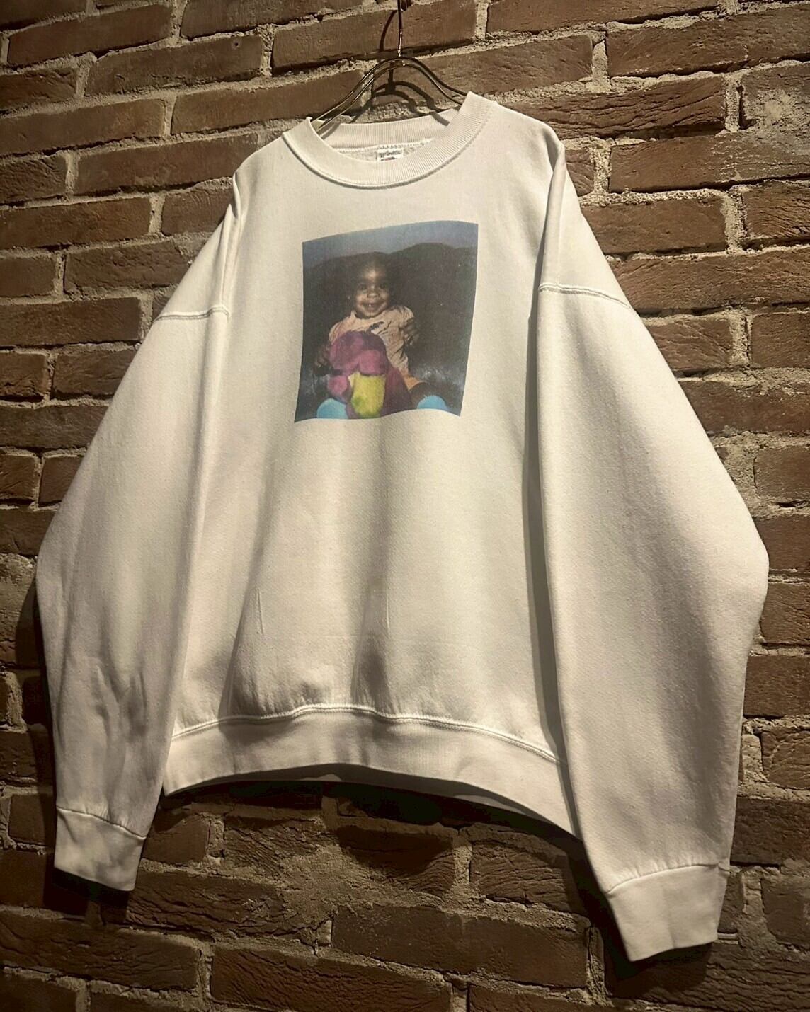 可愛らしい女の子の記念写真のような転写プリントを施した1着。心温まる笑顔のワンシーンを切り取った写真ですが、"誰やねん"感が否めない絶妙な抜け感がたまりません。