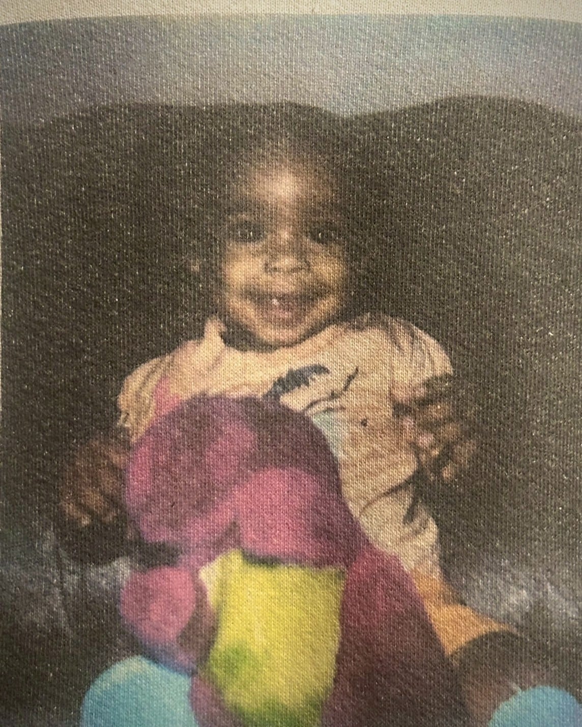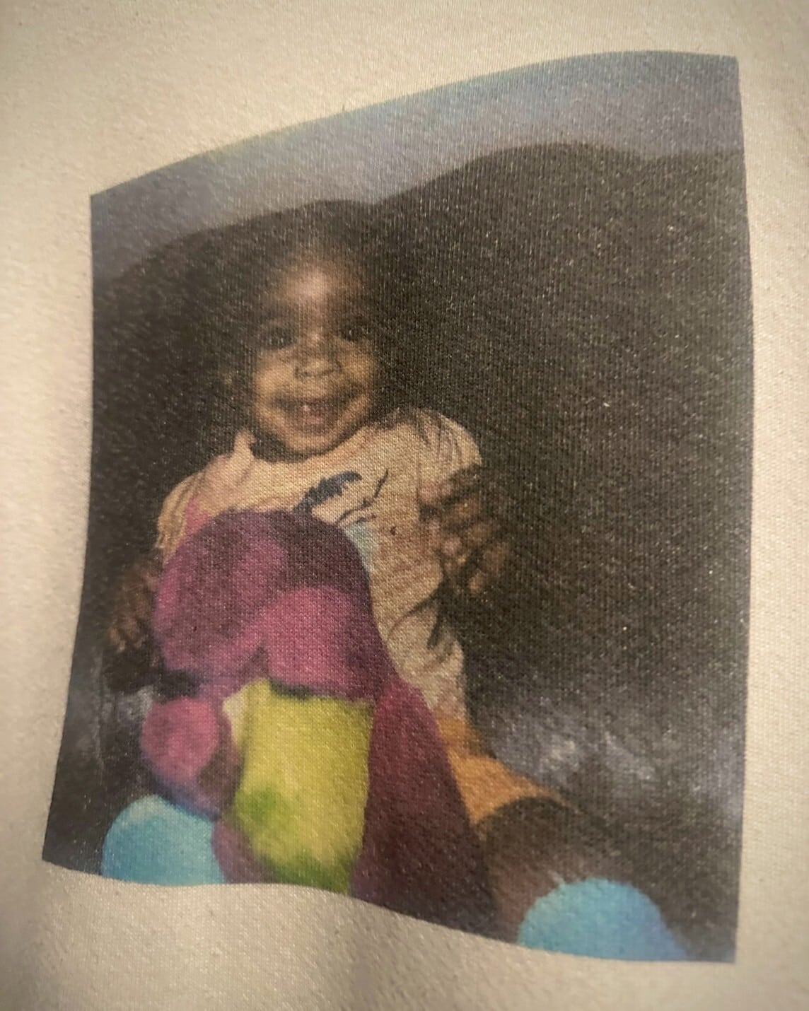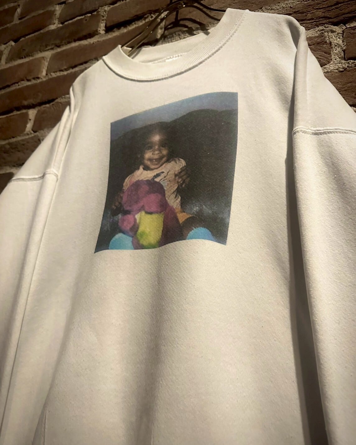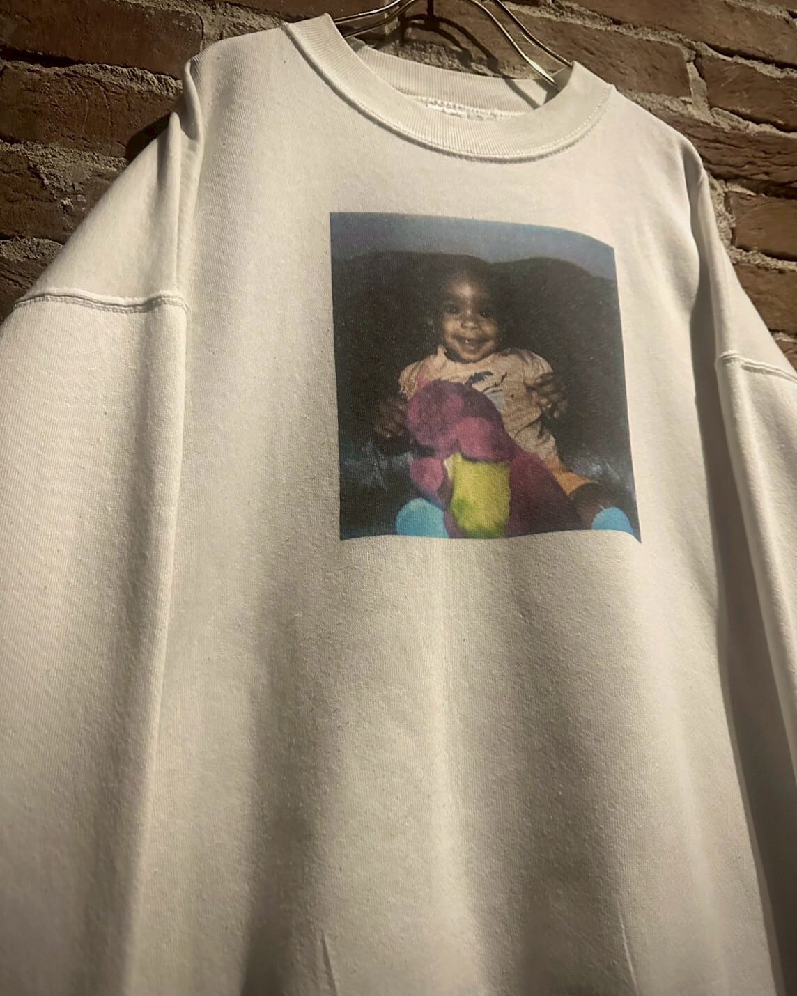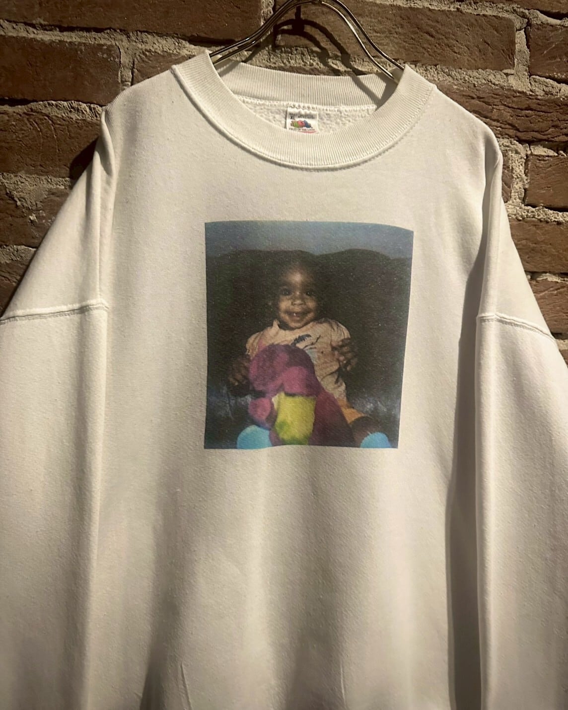 可愛らしい女の子の記念写真のような転写プリントを施した1着。心温まる笑顔のワンシーンを切り取った写真ですが、"誰やねん"感が否めない絶妙な抜け感がたまりません。