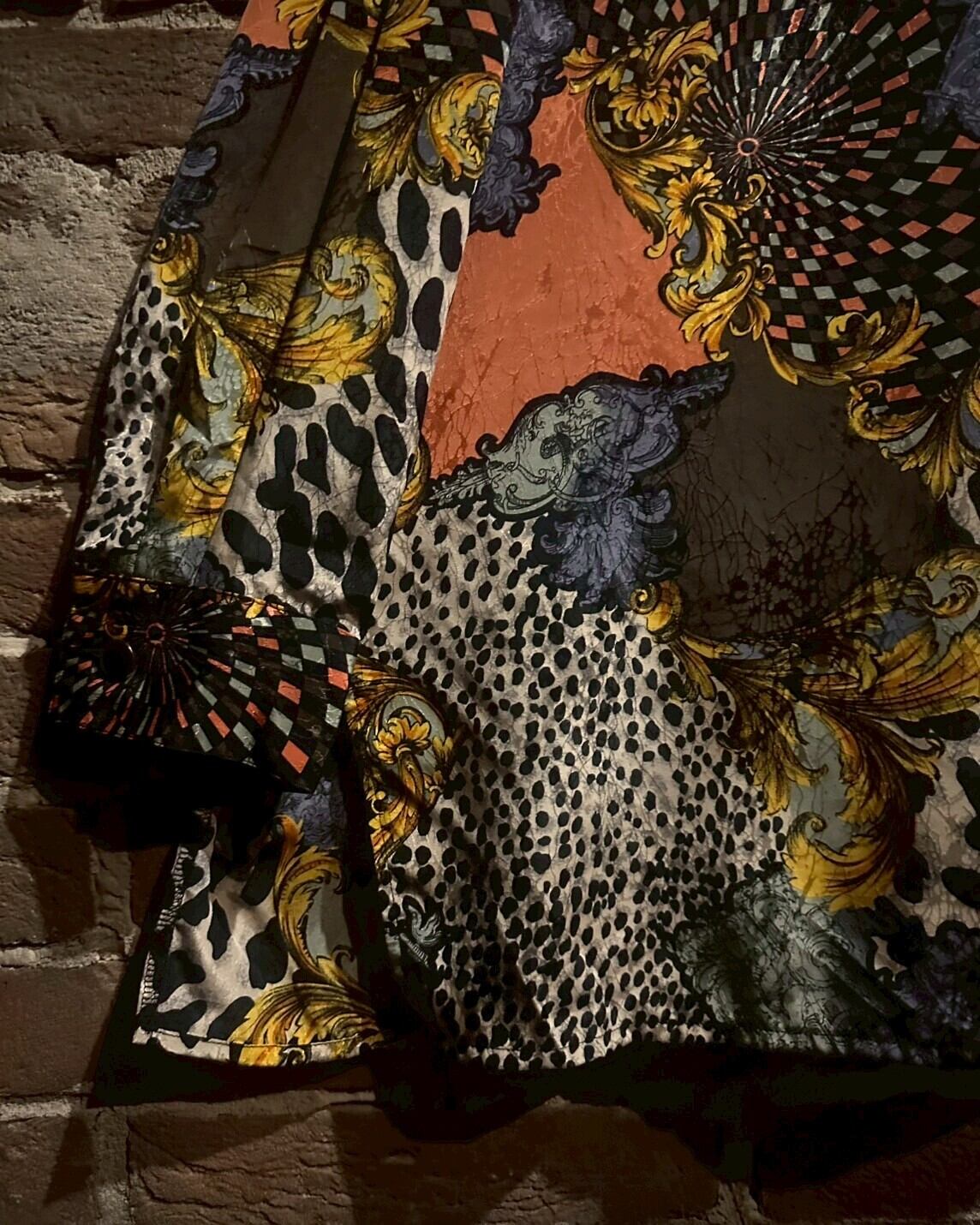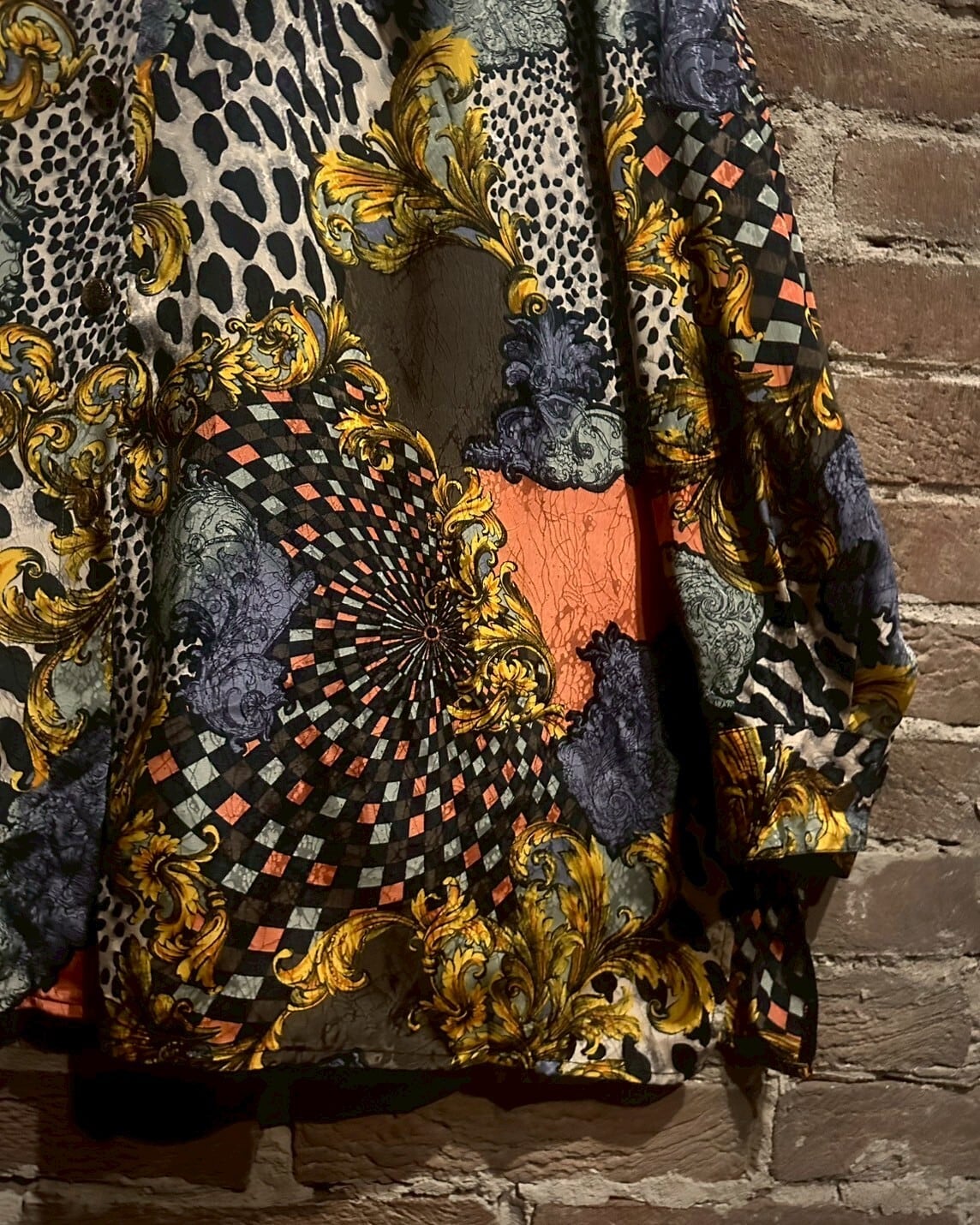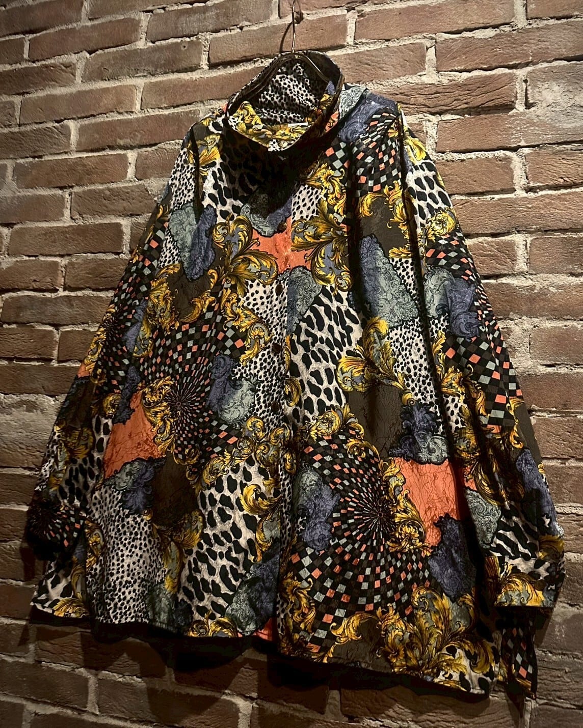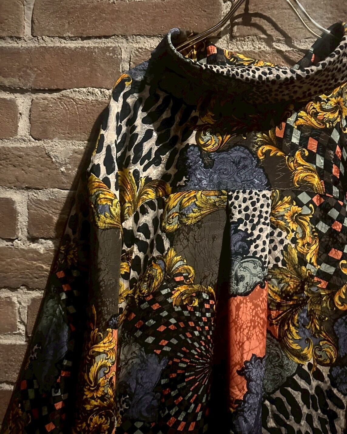スルスルっと滑らかな上質なシルクの混紡素材をボディに用いたジャケット。モノトーンのレオパード、アーティスティックな柄、ヨーロピアン柄をランダムに切り替えたインパクト抜群ながら美しい柄模様が素晴らしい逸品。