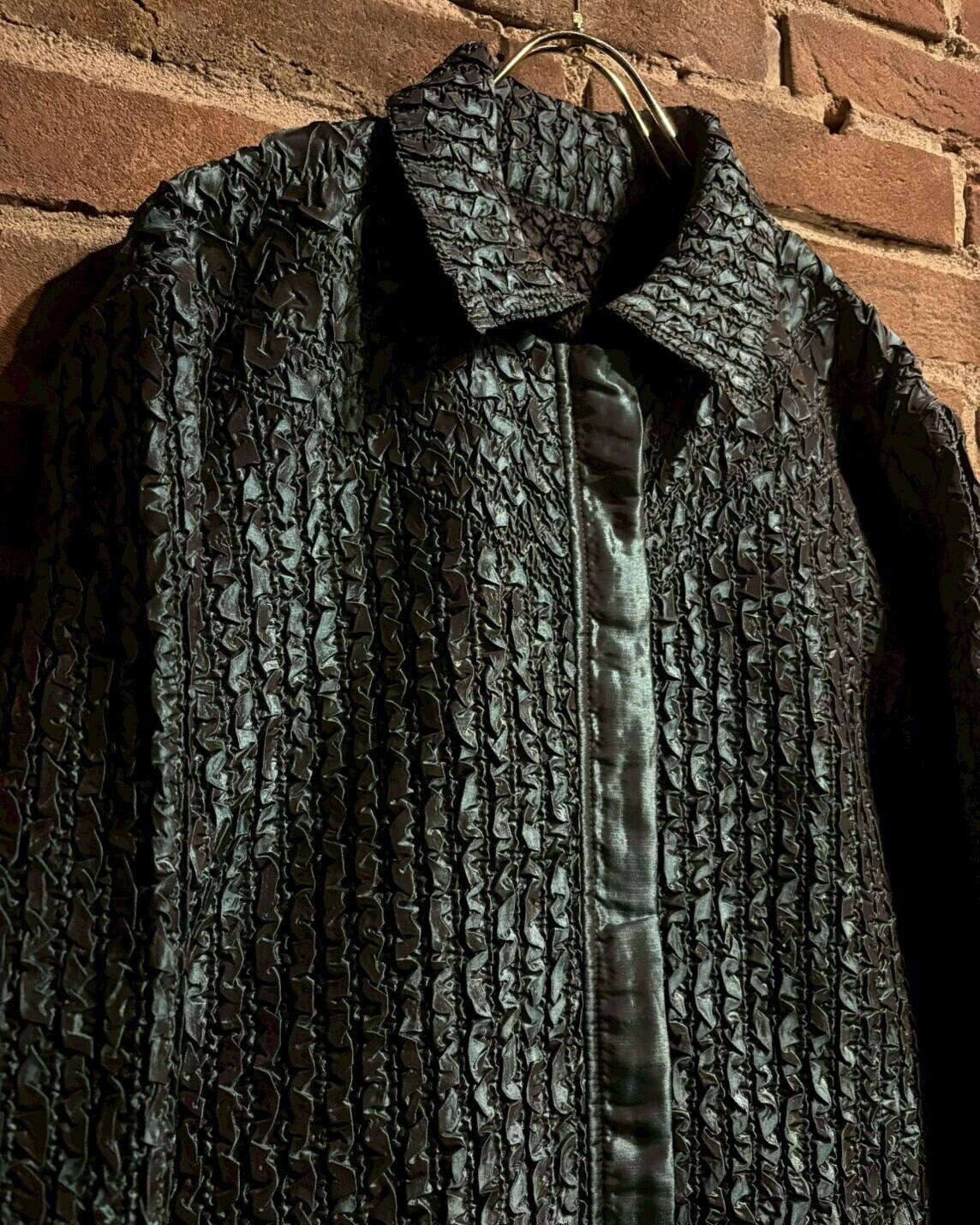 メタリックブルー×黒のリバーシブルで仕上げたポップコーン素材のジップアップジャケット。
