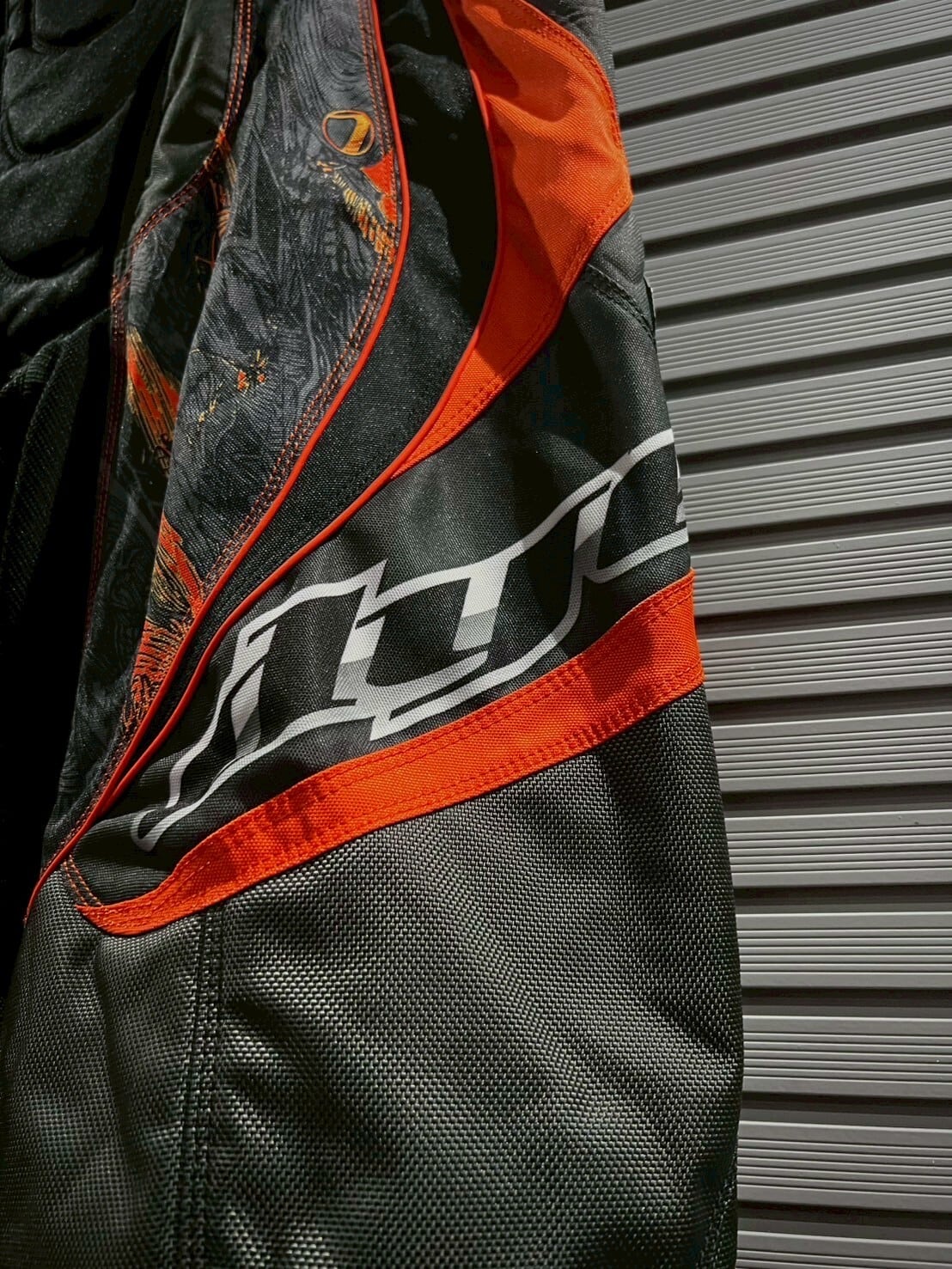 高密度で織られたタフなブラックのボディに、より強度の高い生地、抽象的な柄を切り替えた、機能性、デザイン性を両立したレーシングパンツ。