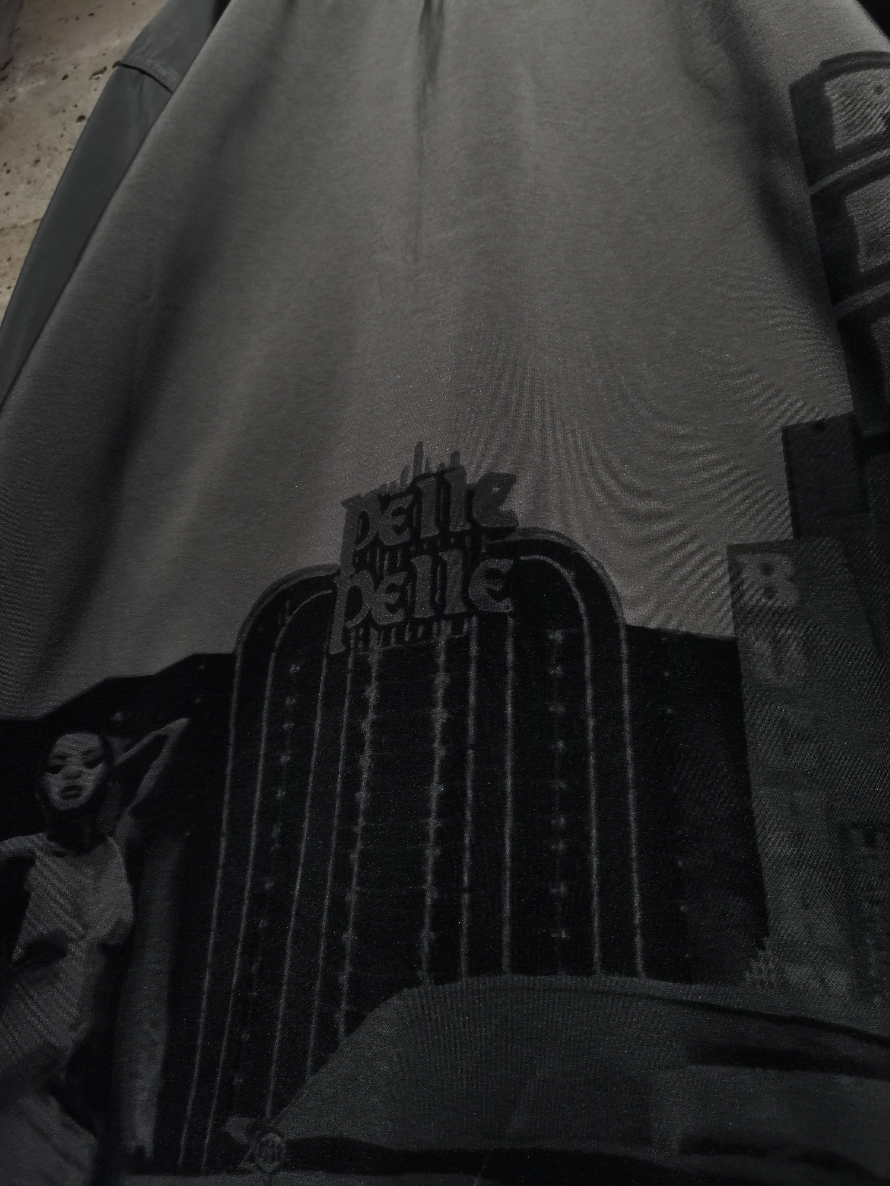 ハリのある滑らかな質感の生地をボディに用い、グレーをベースとしたモノトーンのカラーリングでアメリカンなデザインを載せた1着。