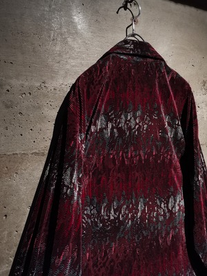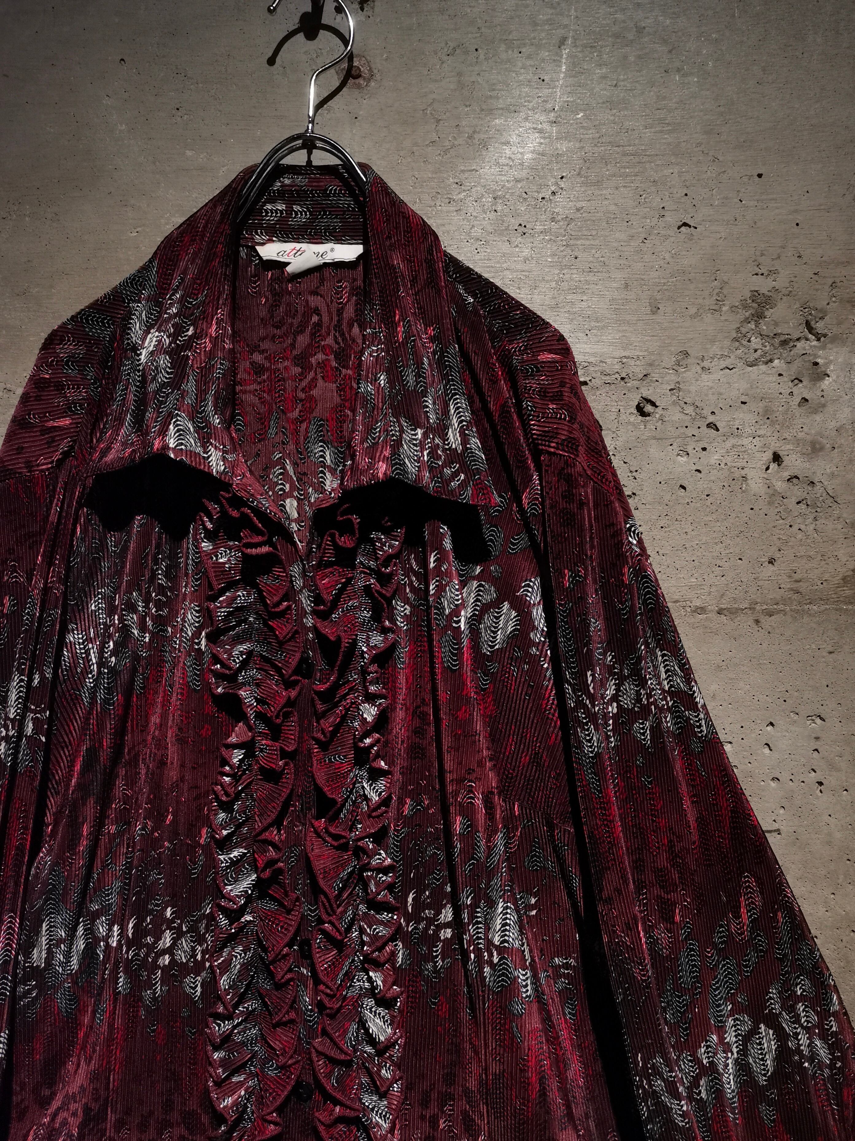 アーティスティックな雰囲気を見せる抽象的な柄を載せたボディにプリーツ加工を施し、フロントにフリルの装飾を施した長袖シャツ。